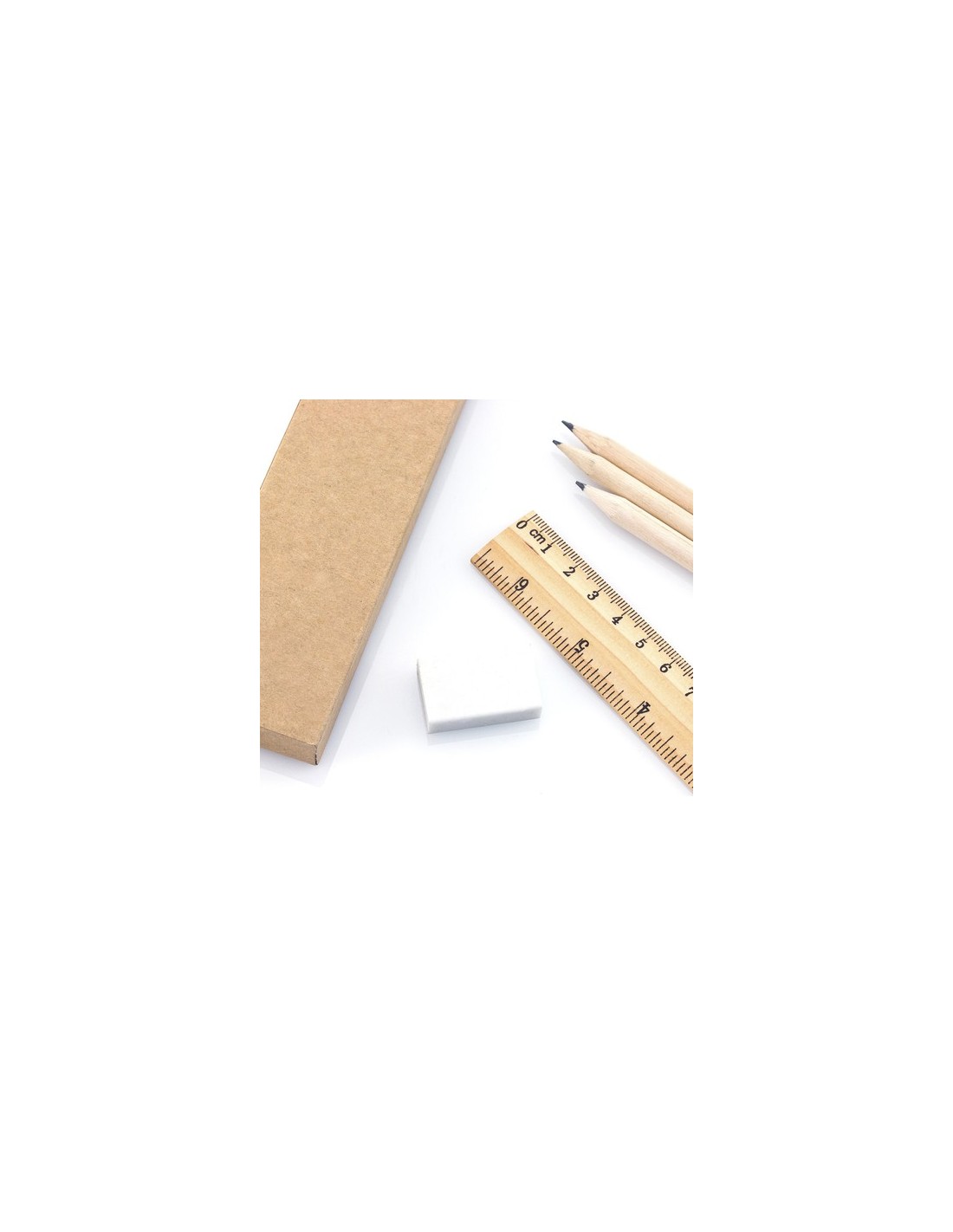 Set de 6 piezas con 3 lápices de madera con cuerpo redondo de acabado natural y mina negra, regla de 20cm con sistema métrico en centímetros/pulgadas, goma de borrar y sacapuntas. Presentado en estuche de cartón reciclado. 6 Piezas Composition : Cartón Reciclado.