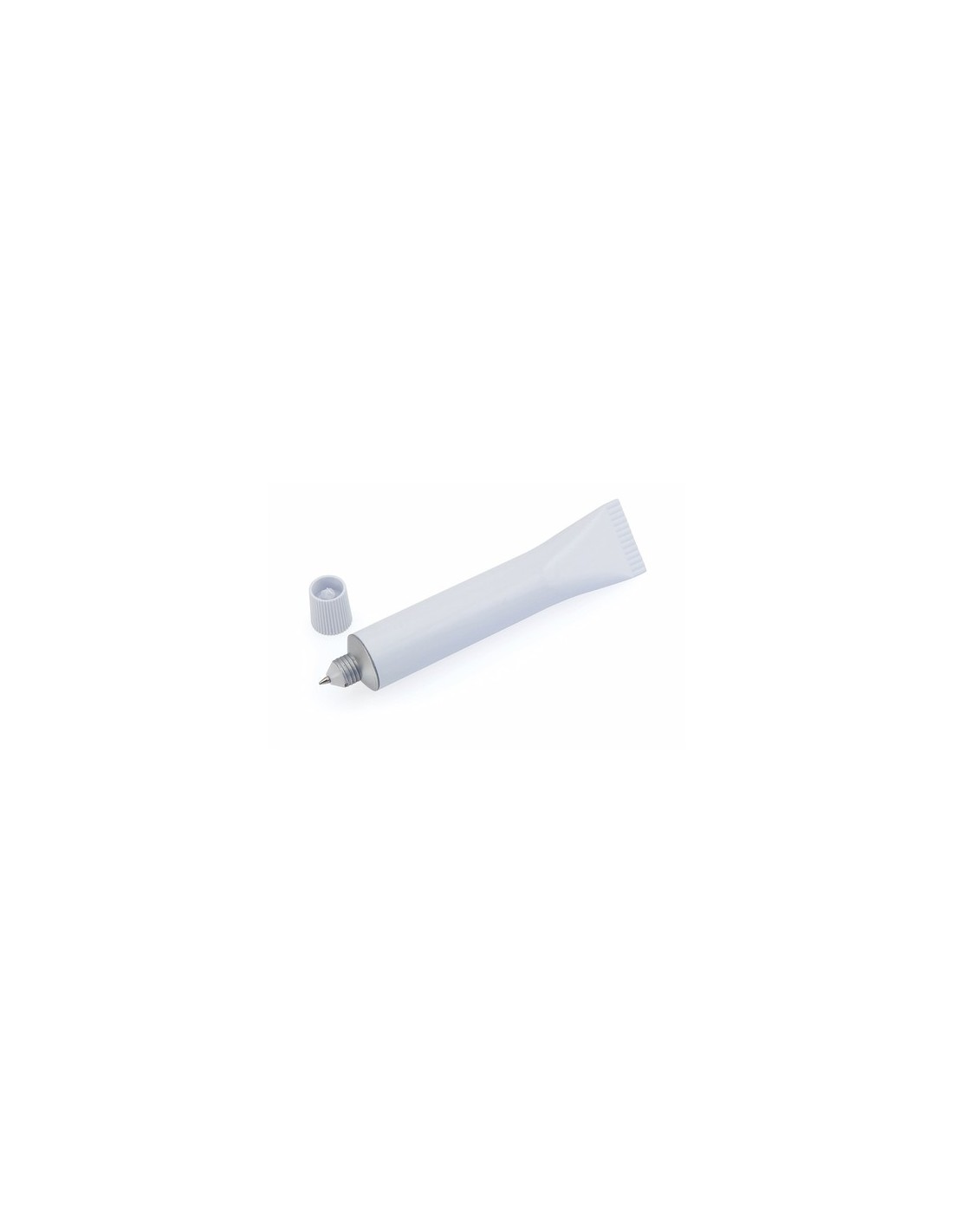 Original bolígrafo con diseño de tubo y cuerpo sólido en color blanco. Con capucha a rosca y de tinta azul.
