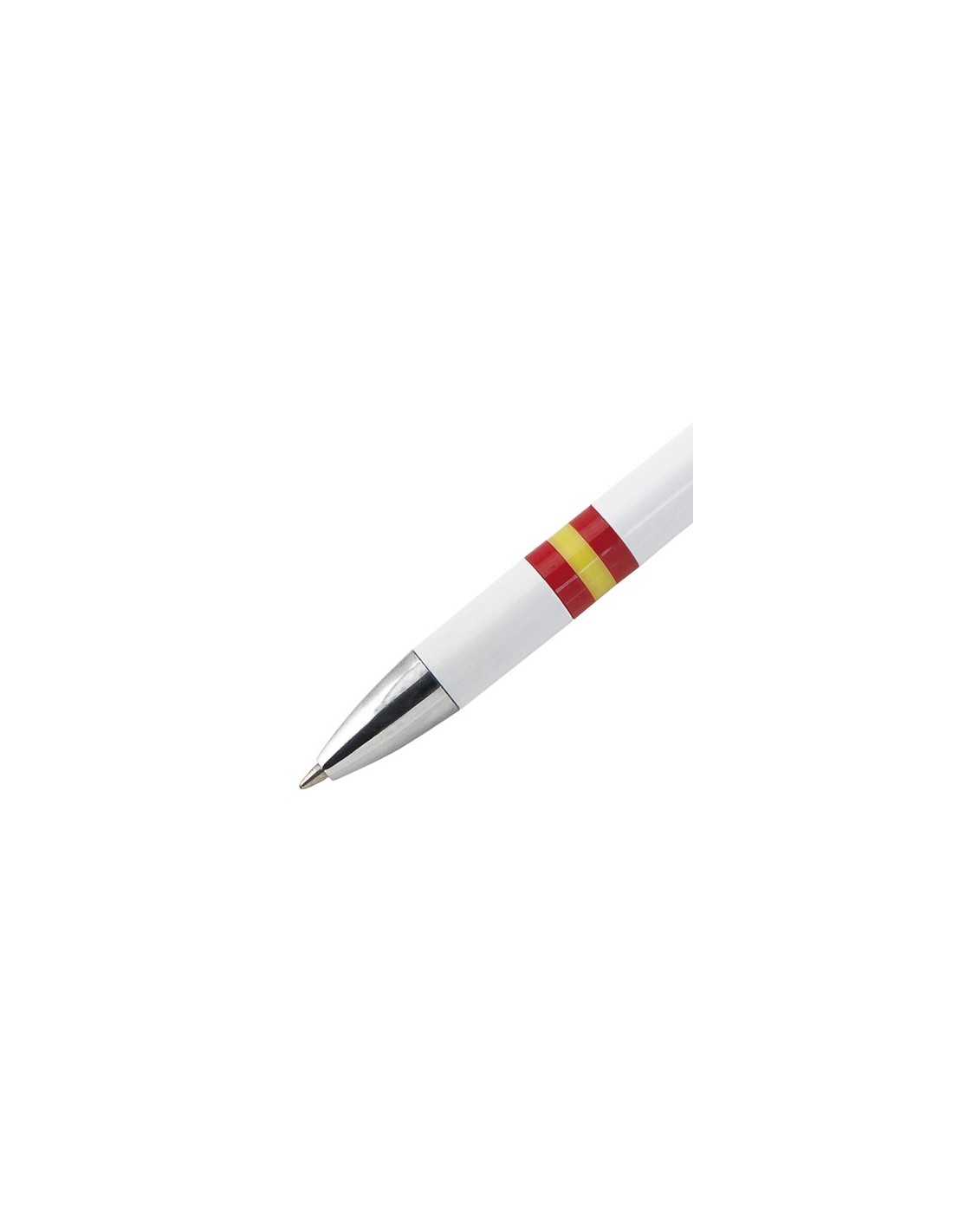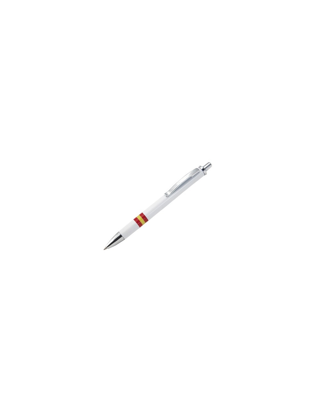 Bolígrafo de mecanismo pulsador de elegante diseño bicolor con accesorios en color plateado brillante y cuerpo de suave acabado en color blanco brillante con la bandera nacional. Con clip metálico, de cartucho jumbo y tinta azul. Carga Jumbo