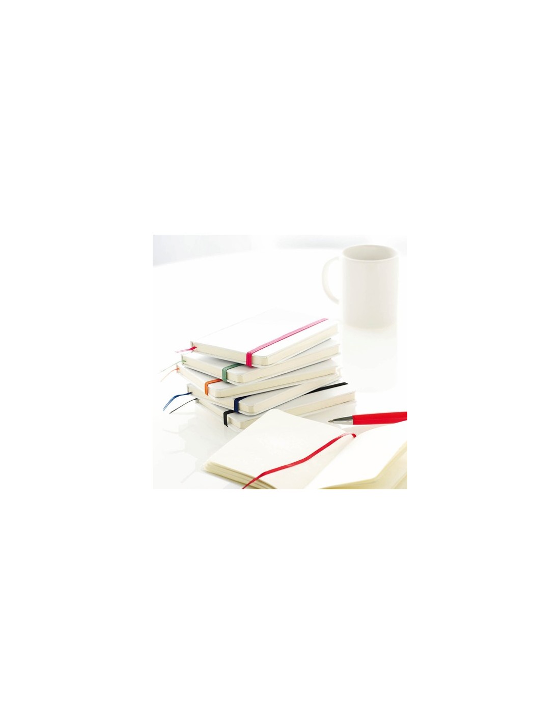 Bloc de notas con tapas de suave tacto acabadas en resistente cartón de elegante acabado en blanco. Especialmente diseñado para marcaje digital en tapas, cuenta con 80 hojas lisas además de elástico de sujeción y marcapáginas de tela a juego. Portada Rígida. 80 Hojas Composition : Cartón.