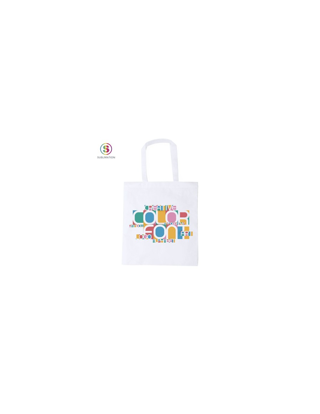 Bolsa de non-woven de 80g/m2 en color blanco especialmente diseñada para marcaje en sublimación. Con asas largas de 60cm y acabado cosido. Composition : Non-Woven.