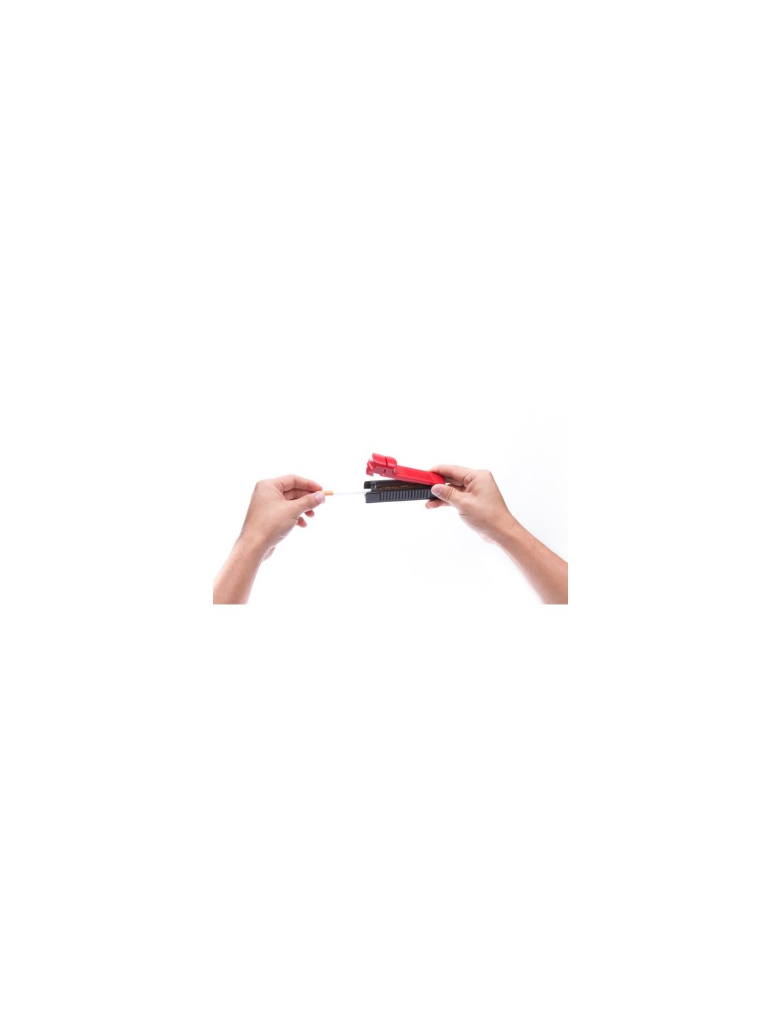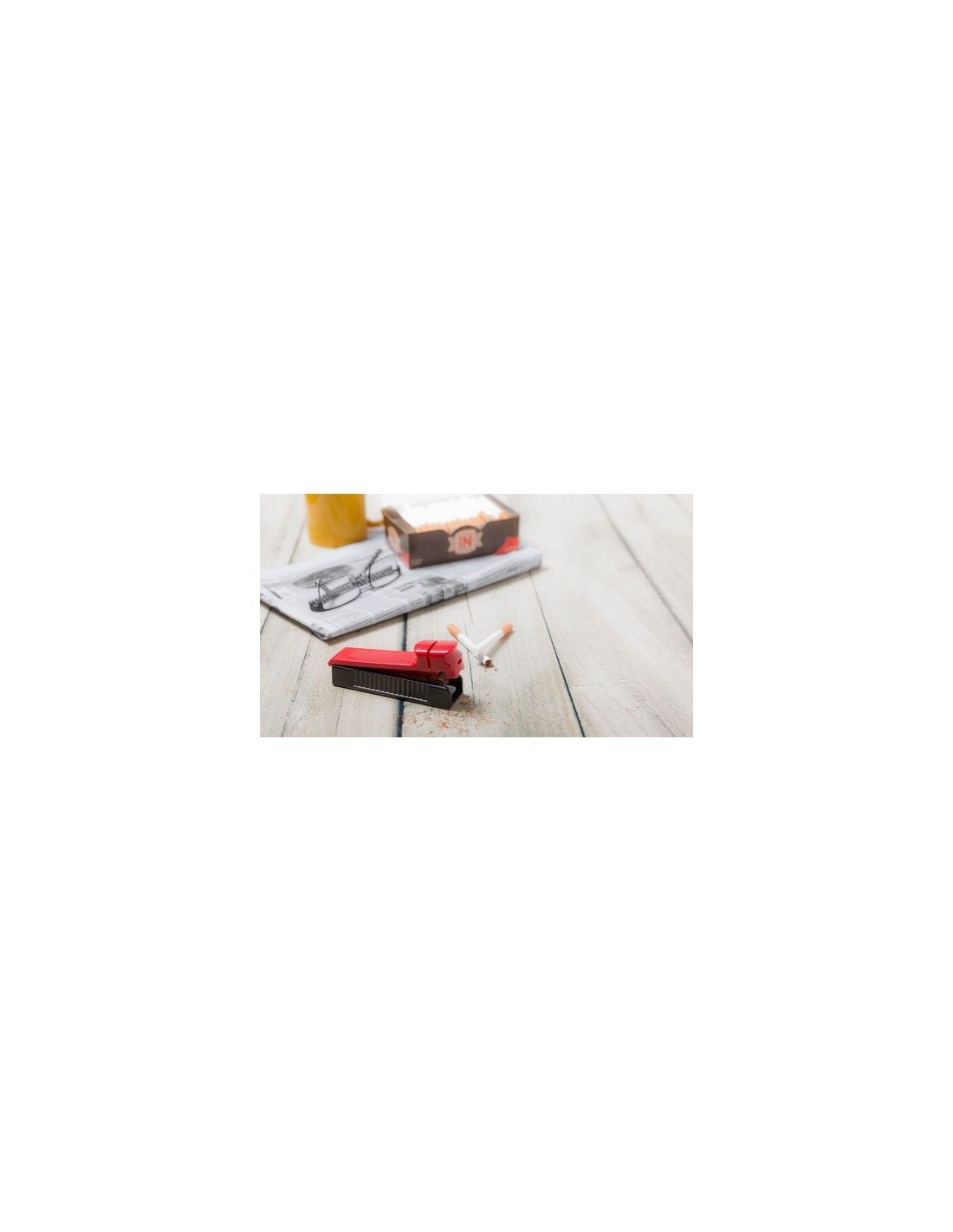 Inyectora para tabaco en diseño bicolor y variada gama de colores. Con pulsador de entubado y presentada en caja individual de diseño.