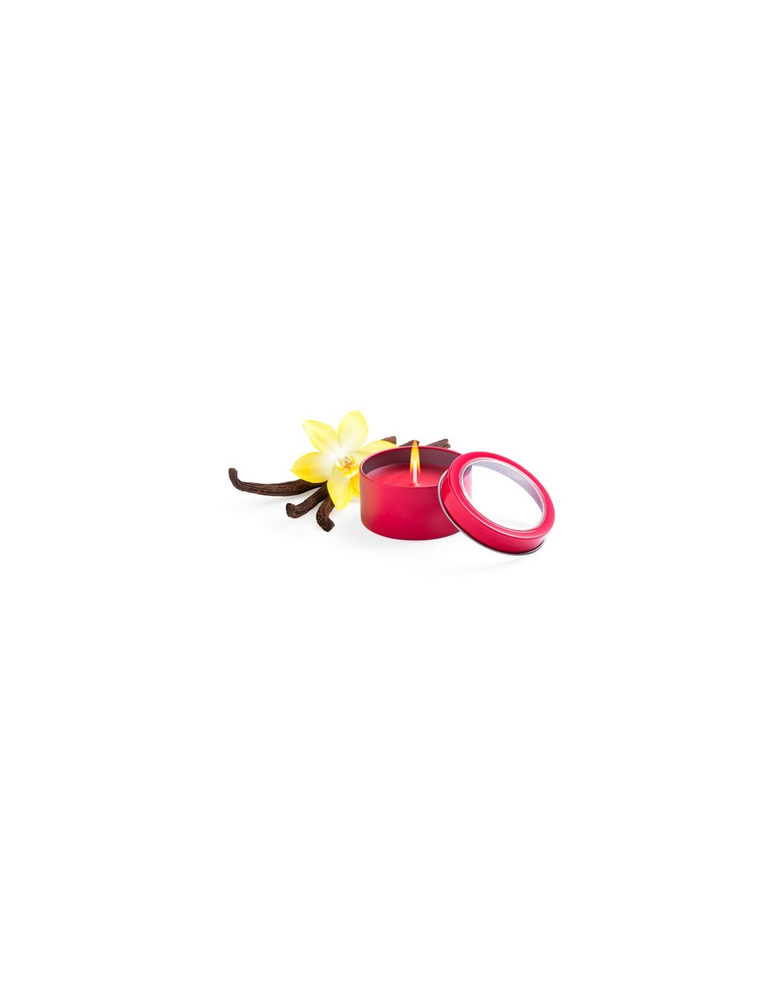 Vela aromática de fragancia vainilla presentada en original tarro metálico con ventana transparente en variada gama de vivos colores. Aroma Vainilla Composition : Metal.