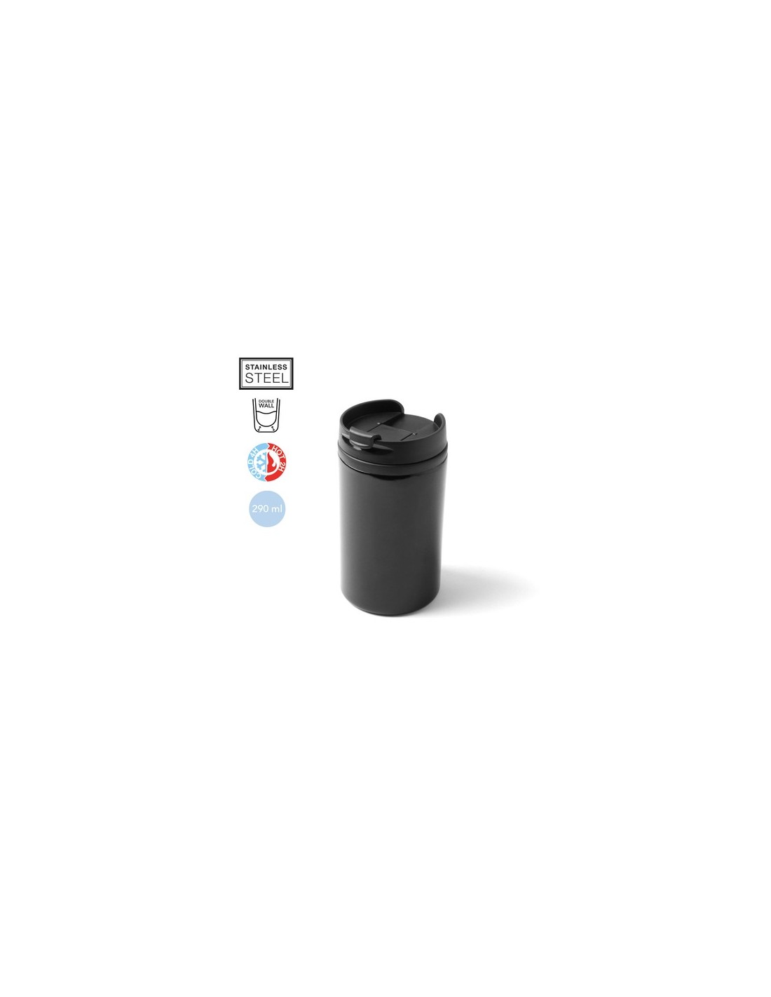 Vaso fabricado en acero inox de 290ml de capacidad con cuerpo en vivos colores de acabado brillante. Con tapa dosificador y base acolchada de suave espuma. Es ideal para tener en tu escritorio, mesa o en cualquier superficie donde disfrutar tranquilamente de tu bebida favorita. 290 ml Composition : Acero Inox.