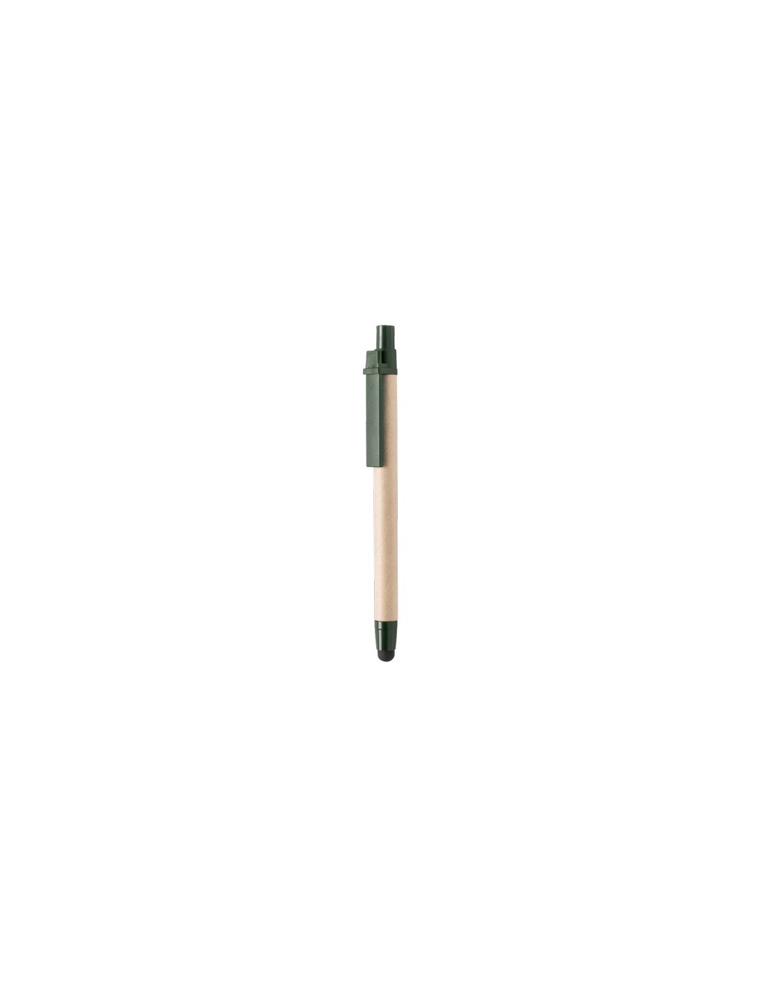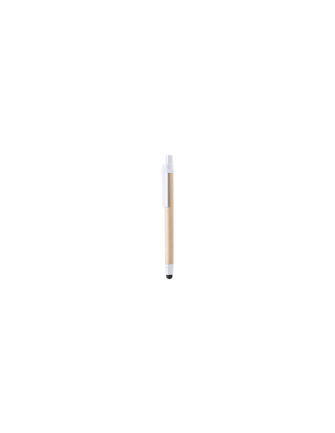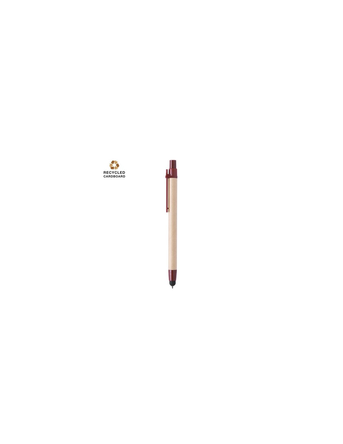 Bolígrafo puntero de mecanismo pulsador en original combinación de cuerpo en cartón reciclado de color natural y accesorios en vivos colores con puntero negro. Tinta azul. Composition : Cartón Reciclado.