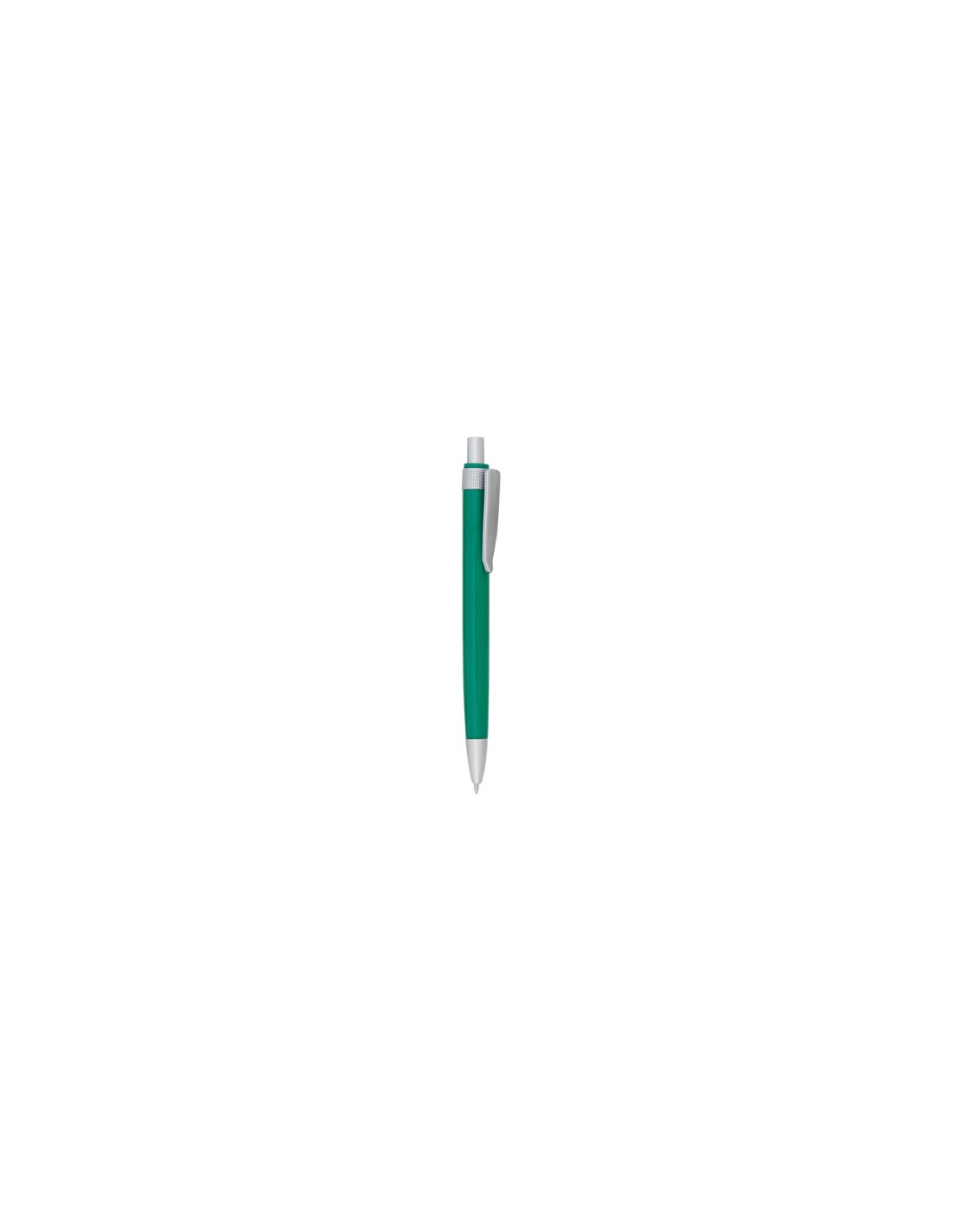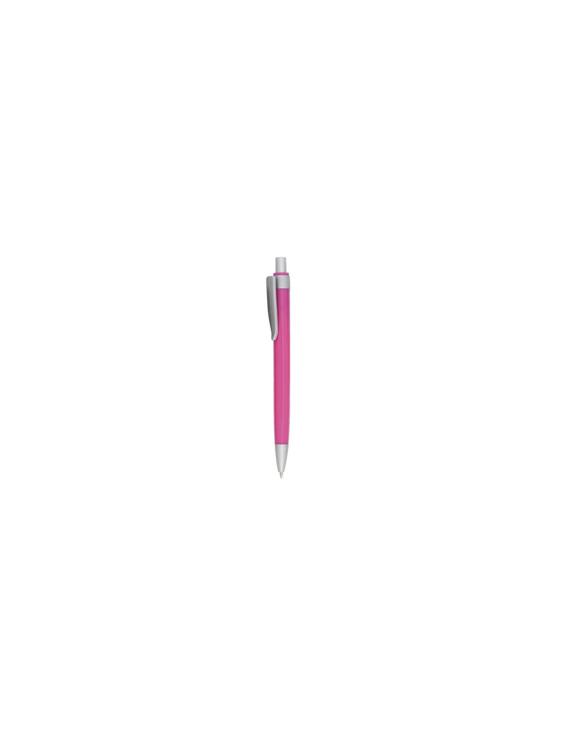Bolígrafo de mecanismo pulsador de atrevido diseño bicolor con accesorios en gris plateado y cuerpo de suave acabado en vivos colores. Con original clip a juego. Tinta azul.