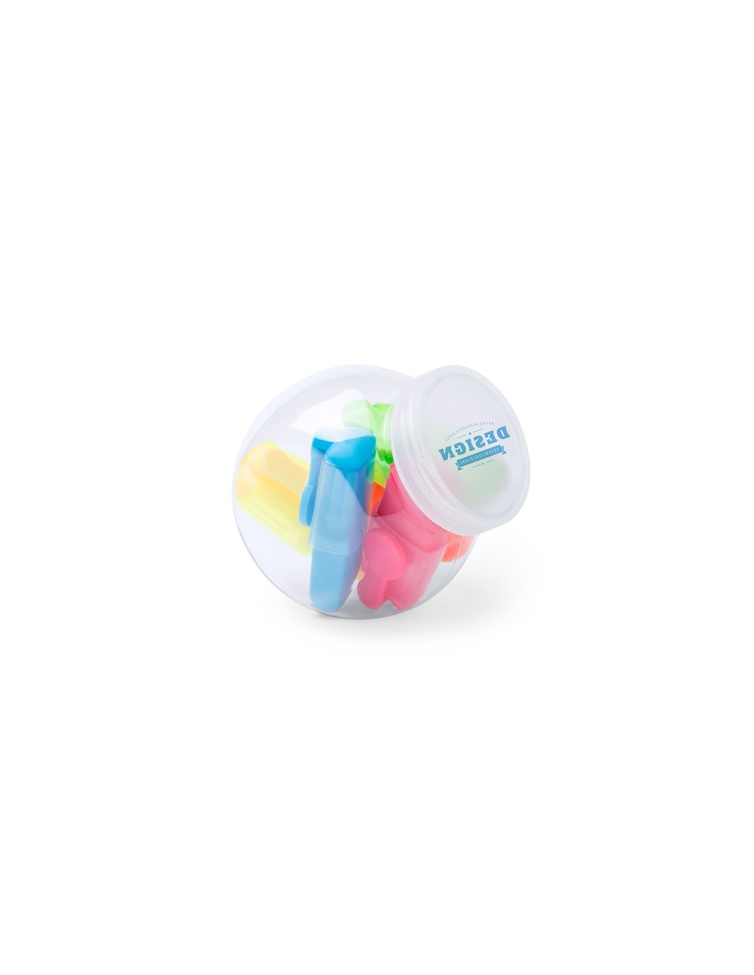 Original set de marcadores fluorescentes de diseño minimalista en cinco colores, presentados en bote con cuerpo transparente y tapa blanca a rosca con superficie lisa para marcaje. 5 Piezas
