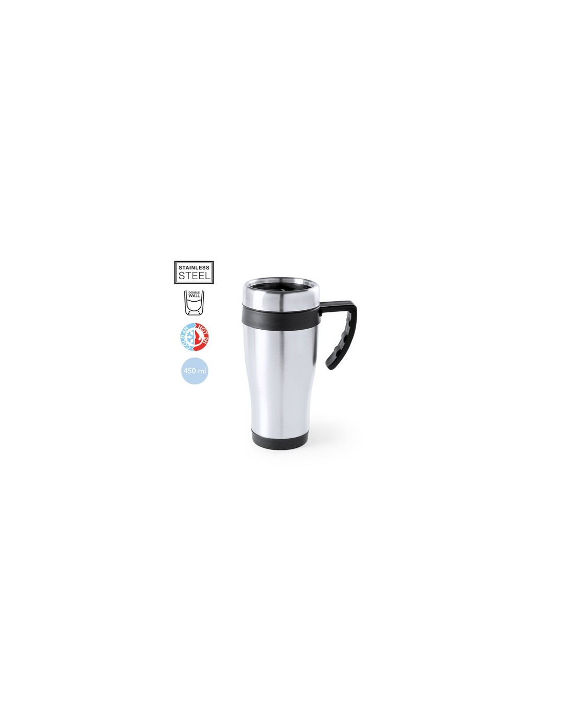 Taza fabricada en acero inox de 450ml de capacidad con cuerpo de acabado brillante con accesorios a juego y en vivos colores. Con tapa dosificador y abrefácil. Es ideal para tener en tu escritorio, mesa o en cualquier superficie donde disfrutar tranquilamente de tu bebida favorita. 450 ml Composition : Acero Inox.