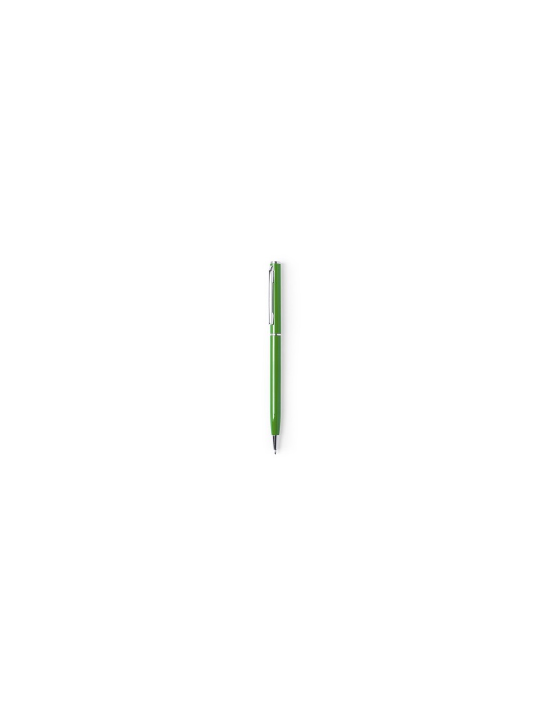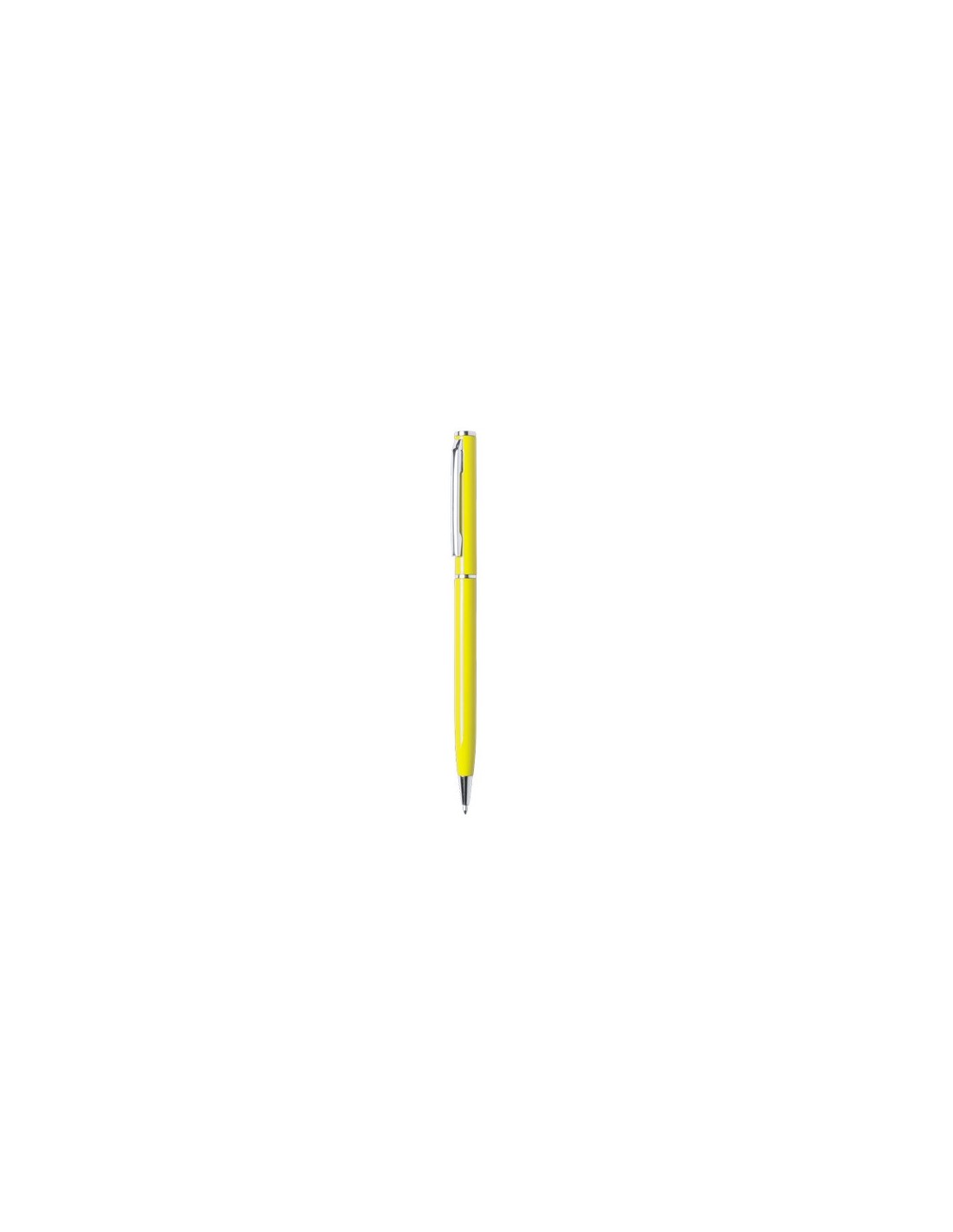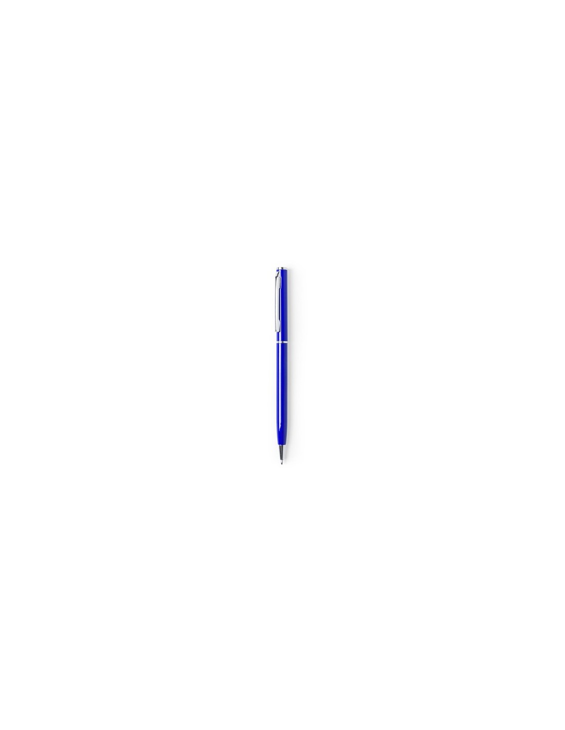 Bolígrafo fabricado en aluminio, de acabado brillo y mecanismo giratorio, con accesorios y anillas en cromado. Disponible en extensa gama de colores, con tinta azul. Composition : Aluminio.