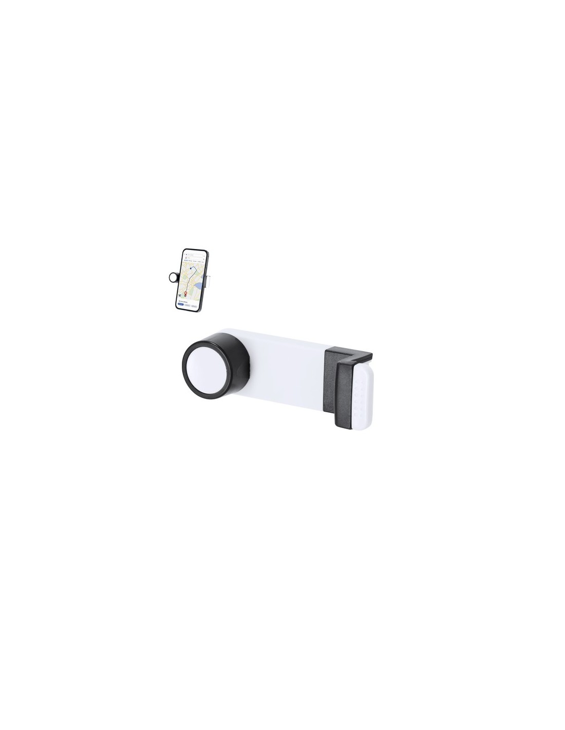 Soporte para smartphone de diseño minimalista y elegante acabado bicolor en blanco y negro. Con sistema de fijación para rejilla de ventilación del automóvil y pastilla circular frontal especialmente diseñada para marcaje en tampografía. Ajustable