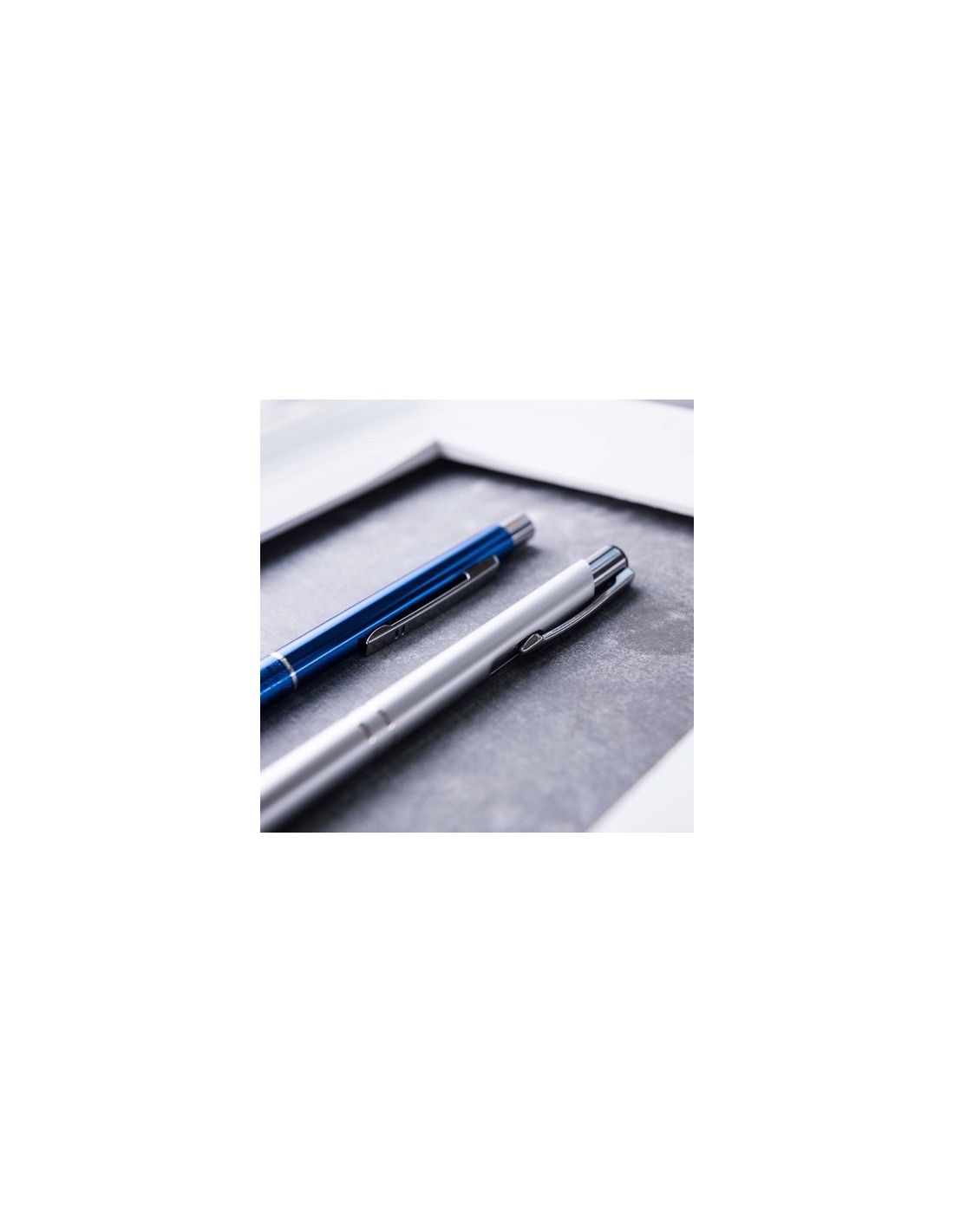 Original bolígrafo de mecanismo pulsador en elegante diseño bicolor. Con cuerpo troquelado en aluminio de suave acabado en variados colores. Original clip, anillas y punta en plateado. De cartucho jumbo y tinta azul. Carga Jumbo Composition : Aluminio.