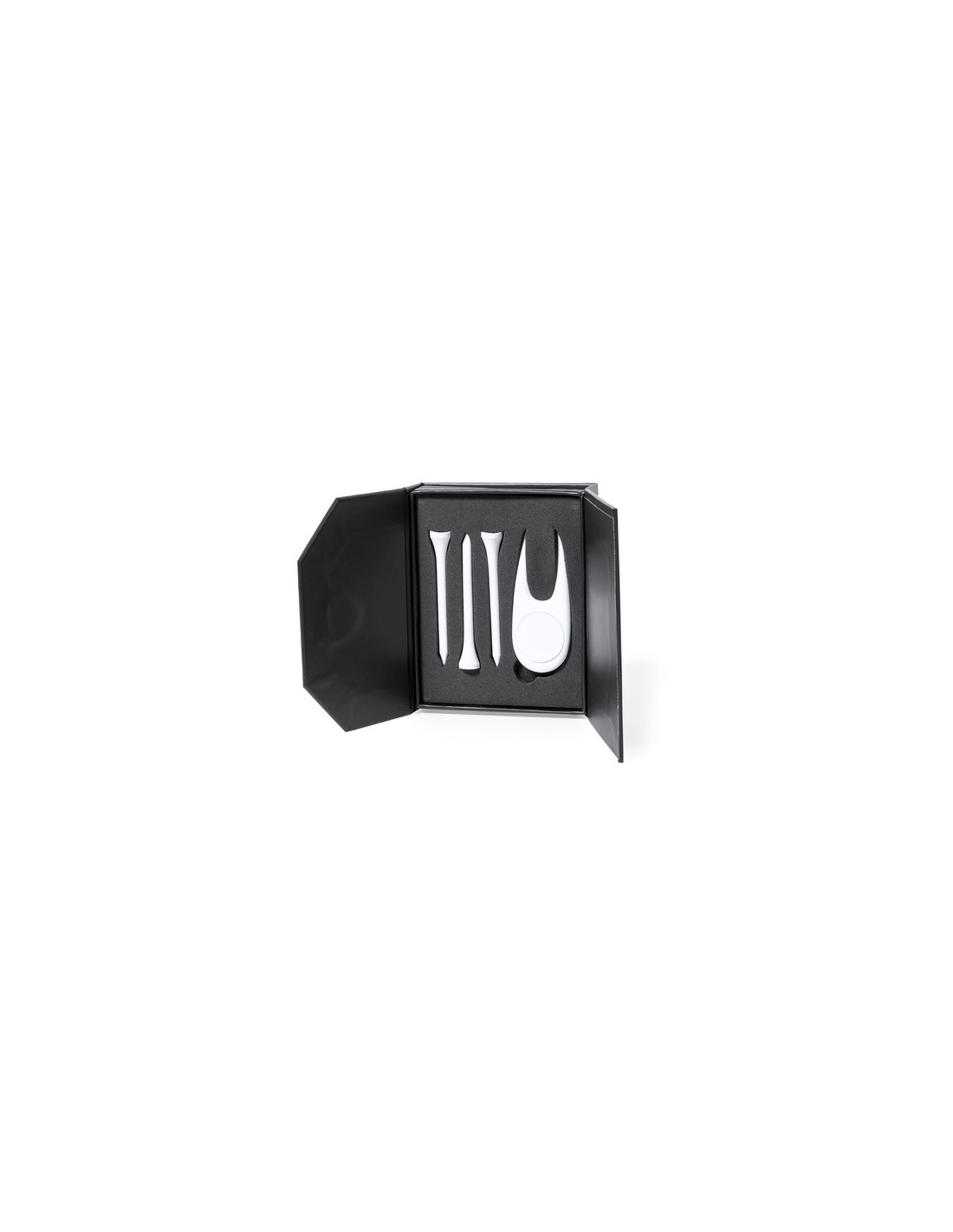 Set de golf de cuatro accesorios en elegante acabado de color blanco. Incluye divot metálico con troquelado especial para doming/gota de resina y 3 tees de madera. Presentado en sobrio estuche individual con interior troquelado y cierre de imán. 4 Accesorios