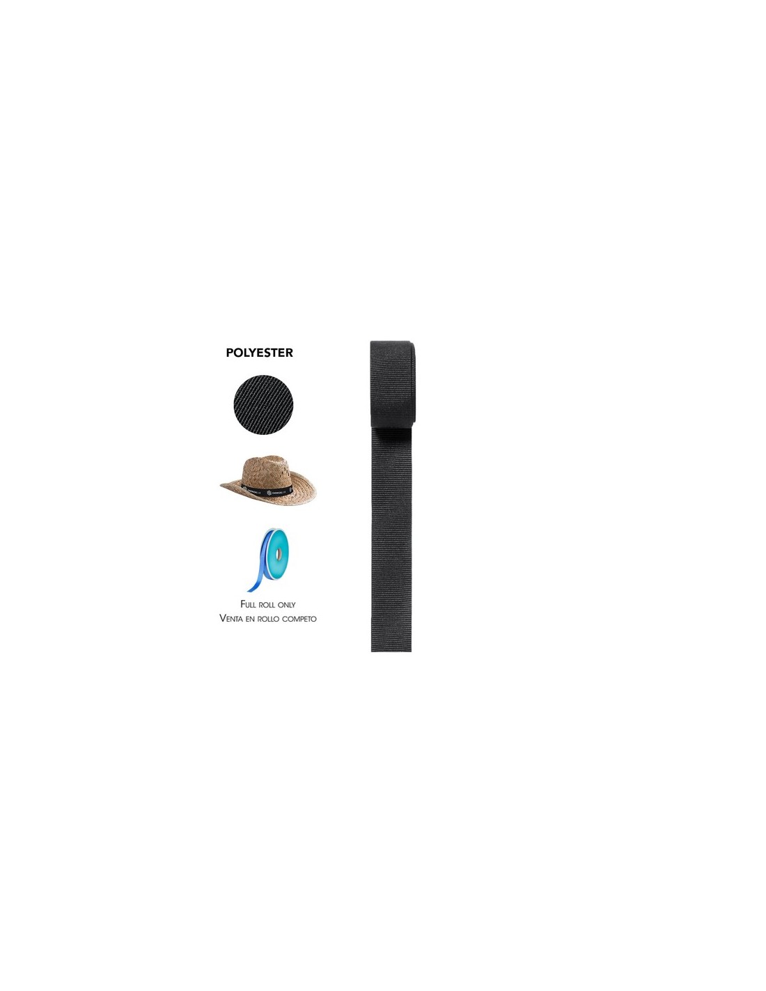 Cinta de poliéster para sombrero en variada gama de colores. Servida en rollos completos de 100 metros de largo, con aproximadamente 150 cintas de 67 x 3,2cm. Composition : Poliéster.