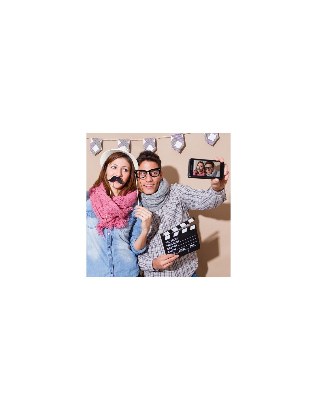 Set selfie de 5 piezas con divertidos accesorios sombrero, pipa, bigote, palomita y gafas. En papel de alto gramaje con mango de madera. Presentado en atractiva bolsa de diseño con auto cierre. 5 Piezas