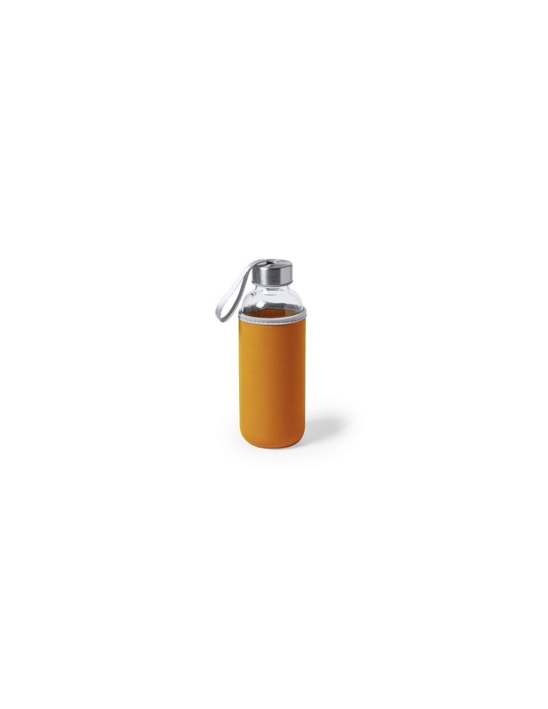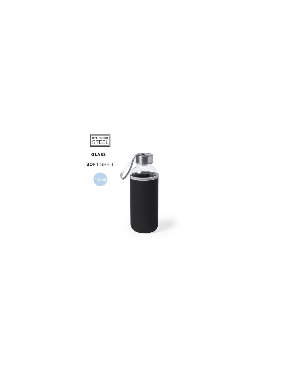 Bidón de cristal de 420 ml de capacidad. Con tapón de seguridad a rosca y practica cinta de transporte, cuenta con una elegante funda de neopreno en vivos colores. Presentado individualmente en una caja de diseño. 420 ml. Funda Soft Shell Composition : Cristal/ Acero Inox.