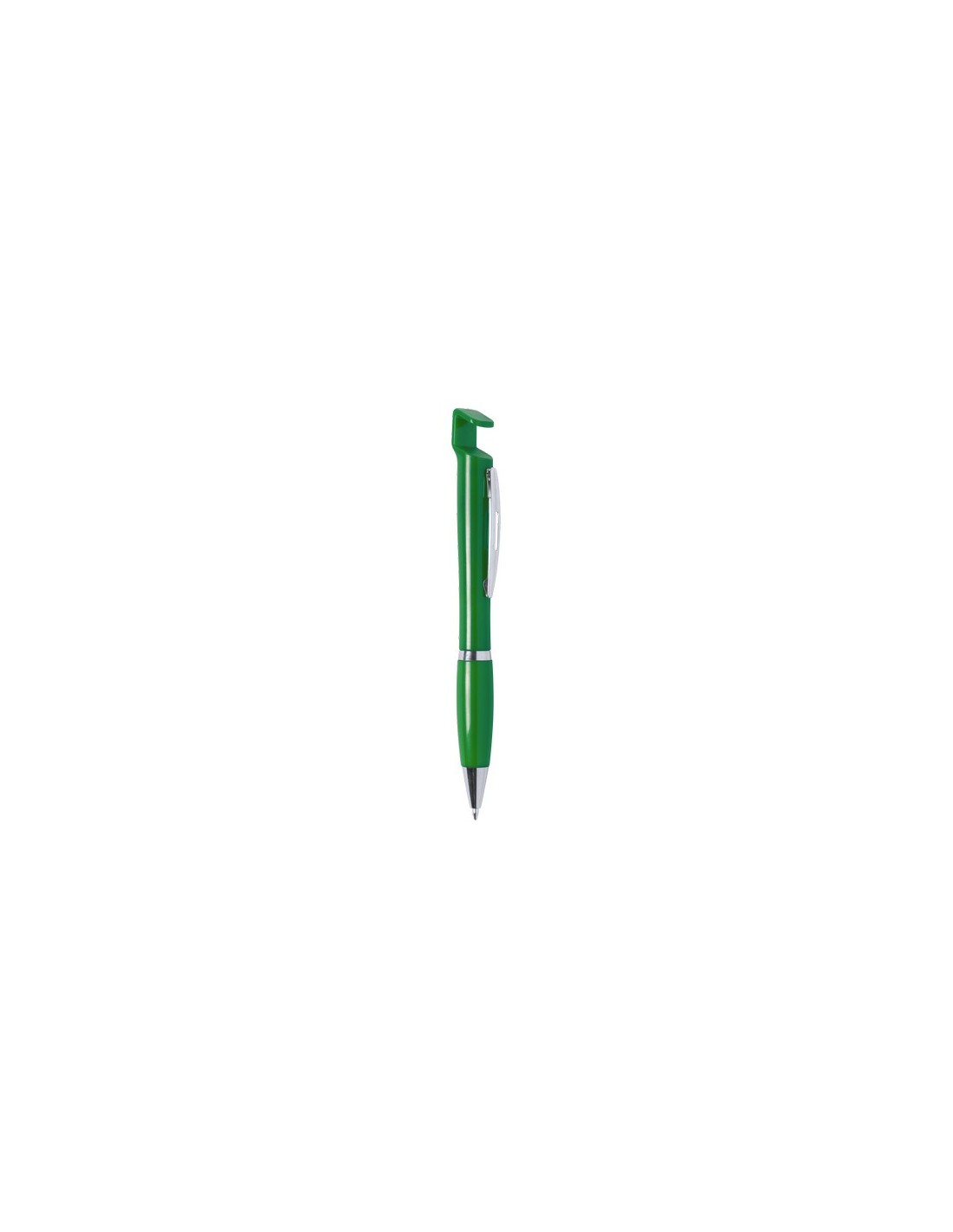 Bolígrafo con soporte para dispositivo móvil. De mecanismo pulsador y atrevido diseño bicolor con accesorios en color plateado y cuerpo de suave acabado en divertidos colores sólidos. Con original clip metálico troquelado a juego y cómoda empuñadura. Tinta azul.