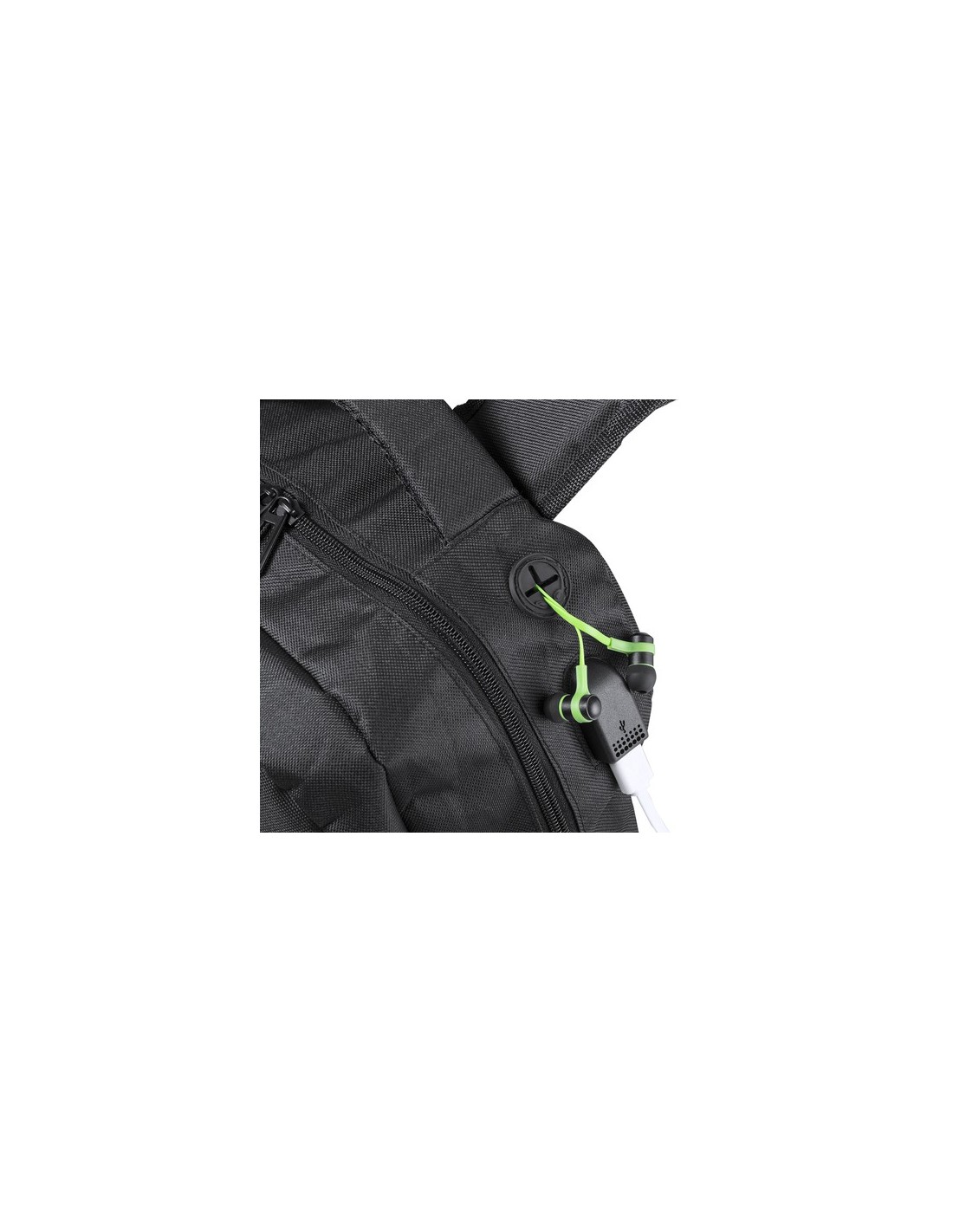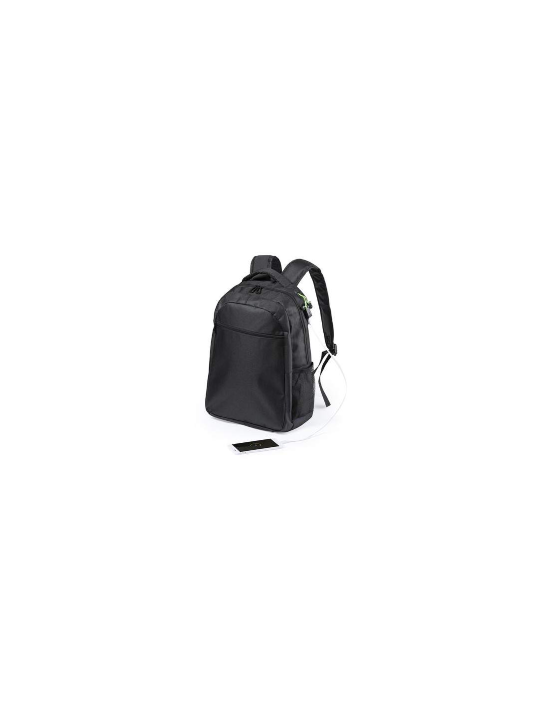 Mochila de resistente poliéster 600D en elegante acabado impermeable de color negro y salida para auriculares. Con compartimento interior con salida USB para conexión de powerbank -no incluido-. Interior con compartimento acolchado para ordenador portátil de hasta 15 pulgadas y tablets de hasta 10 pulgadas. Multitud de bolsillos interiores y exteriores. Cintas de hombros y espalda con acolchado ergonómico. Conexión USB. Bolsillo Acolchado para Portátil y Tablet. Parte Trasera y Cintas Acolchadas Composition : Poliéster 600D.