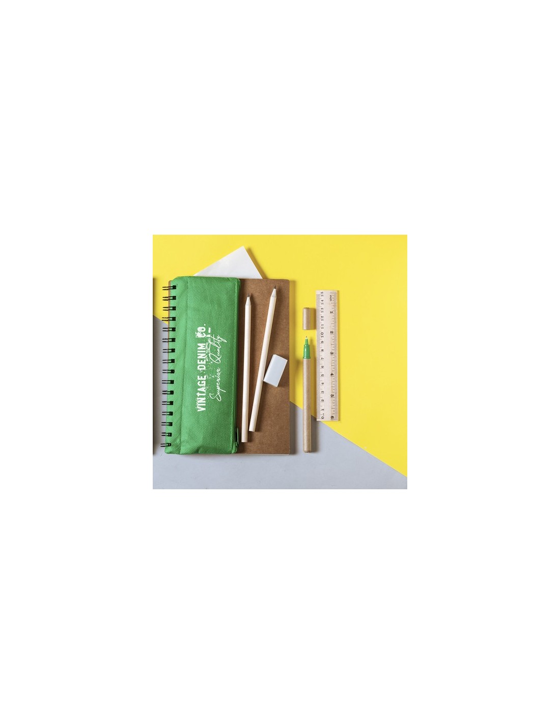 Libreta de anillas con tapas de suave tacto acabadas en resistente cartón reciclado. Con estuche en poliéster 600D de vivos colores y cierre de cremallera integrado en portada. Incluye bolígrafo en cartón reciclado y set de regla, lápices y sacapuntas en madera natural. 70 hojas lisas. Portada Rígida. 70 Hojas. Estuche Incluido. 6 Piezas Composition : Cartón Reciclado.