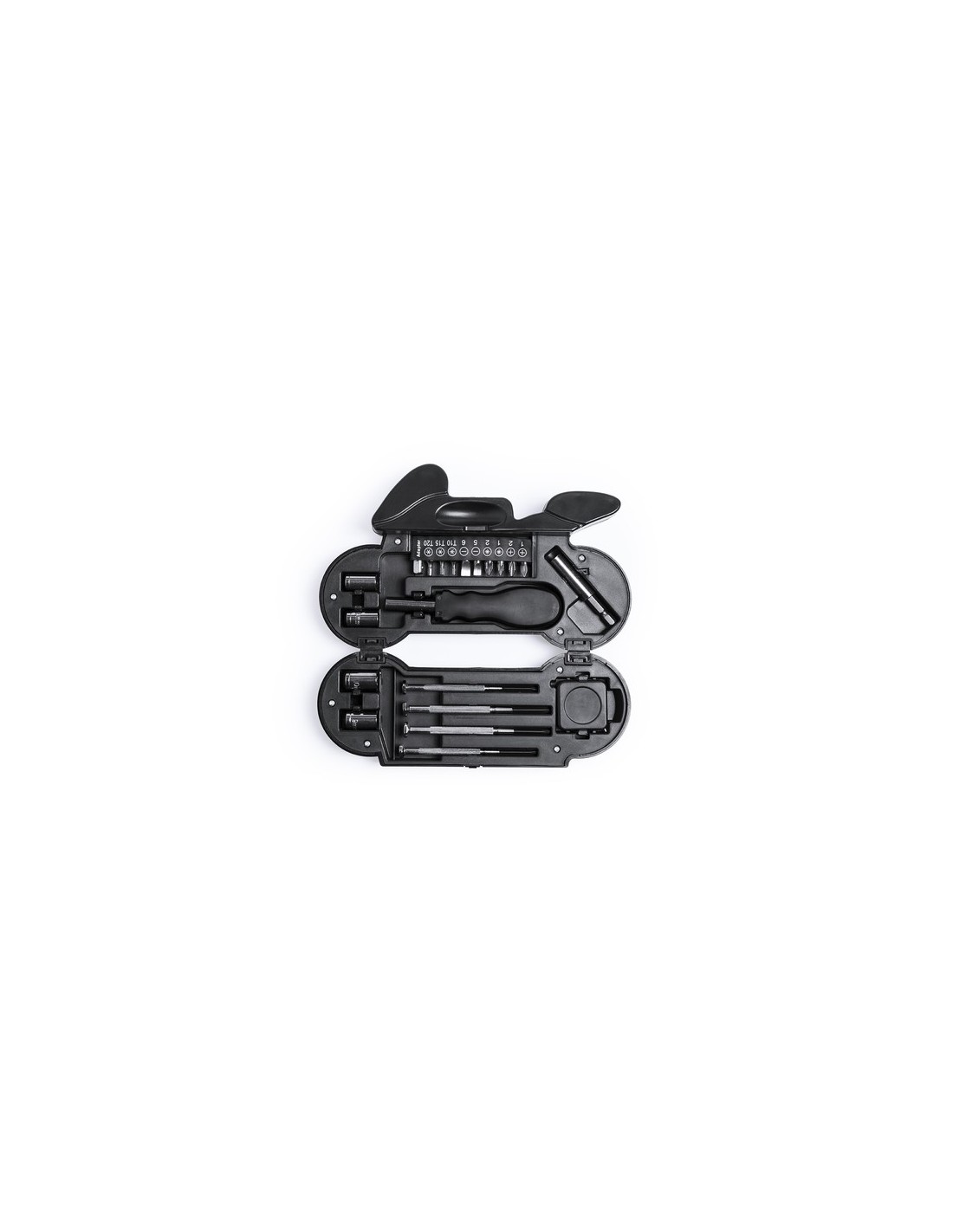 Set de herramientas de 14 accesorios en resistente estuche con diseño de moto, con linterna de 4 ledes integrada. Incluye set de destornilladores de precisión, herramienta de fijación, cabezales destornilladores planos y de estrella y llaves para tuercas de cabeza hexagonal. Pilas de botón incluidas. Presentado en caja individual. 4 Ledes. 21 Accesorios. Pilas Botón Incluidas
