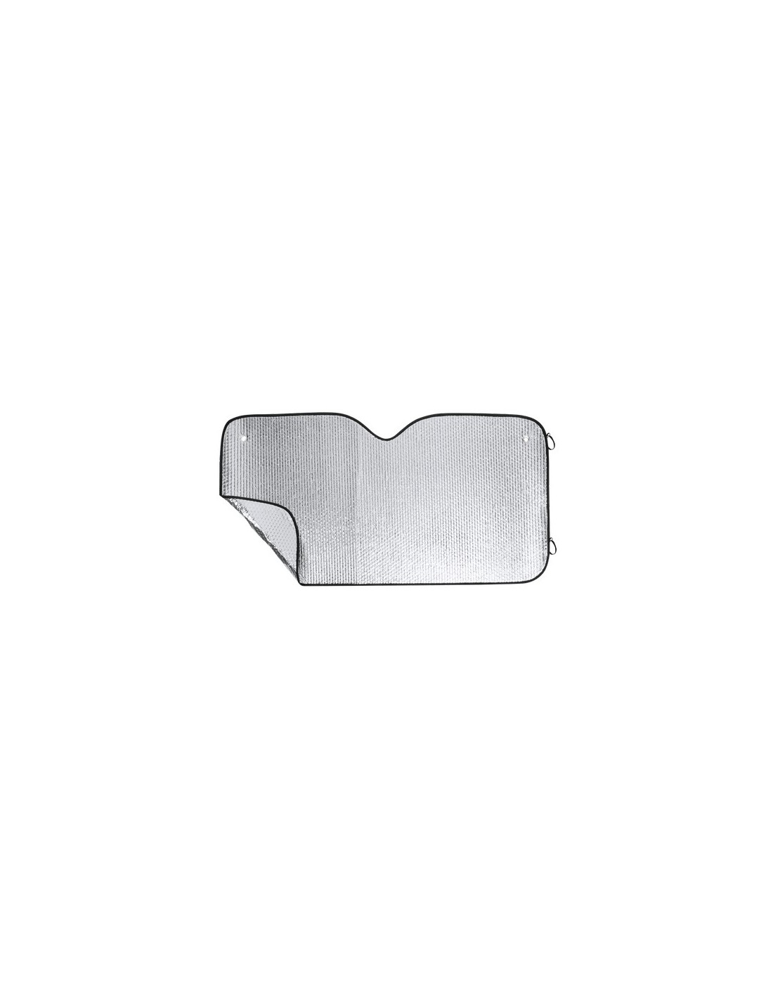 Parasol en aluminio con burbuja en ambas caras en color plateado de acabado metalizado con ribetes en color negro. De tamaño maxi 180x90cm, con argollas metálicas de refuerzo, cintas elásticas para plegado, dos ventosas para ajuste en luna y presentación desplegado en plancha para fácil impresión. Composition : Aluminio Burbuja Dos Caras.