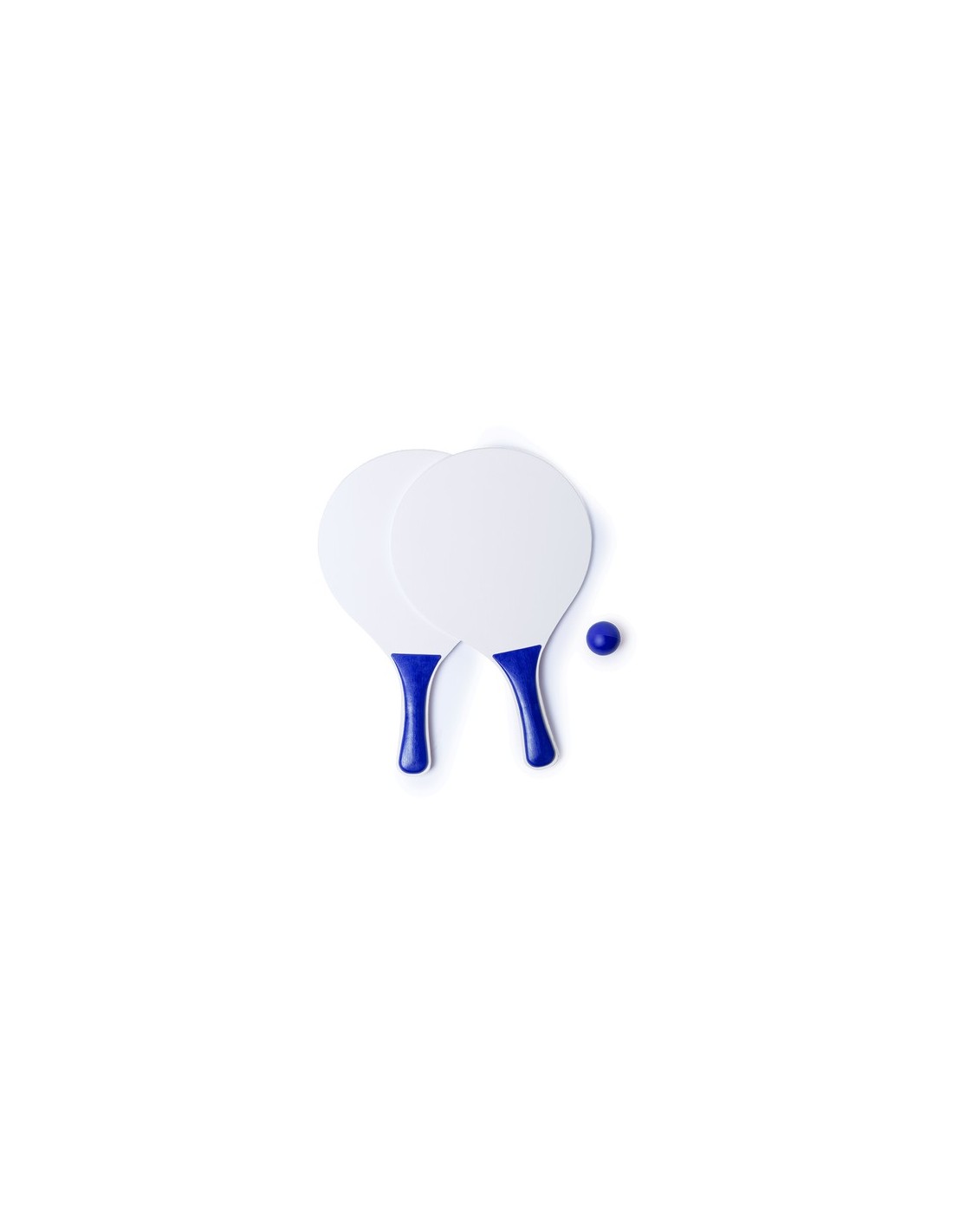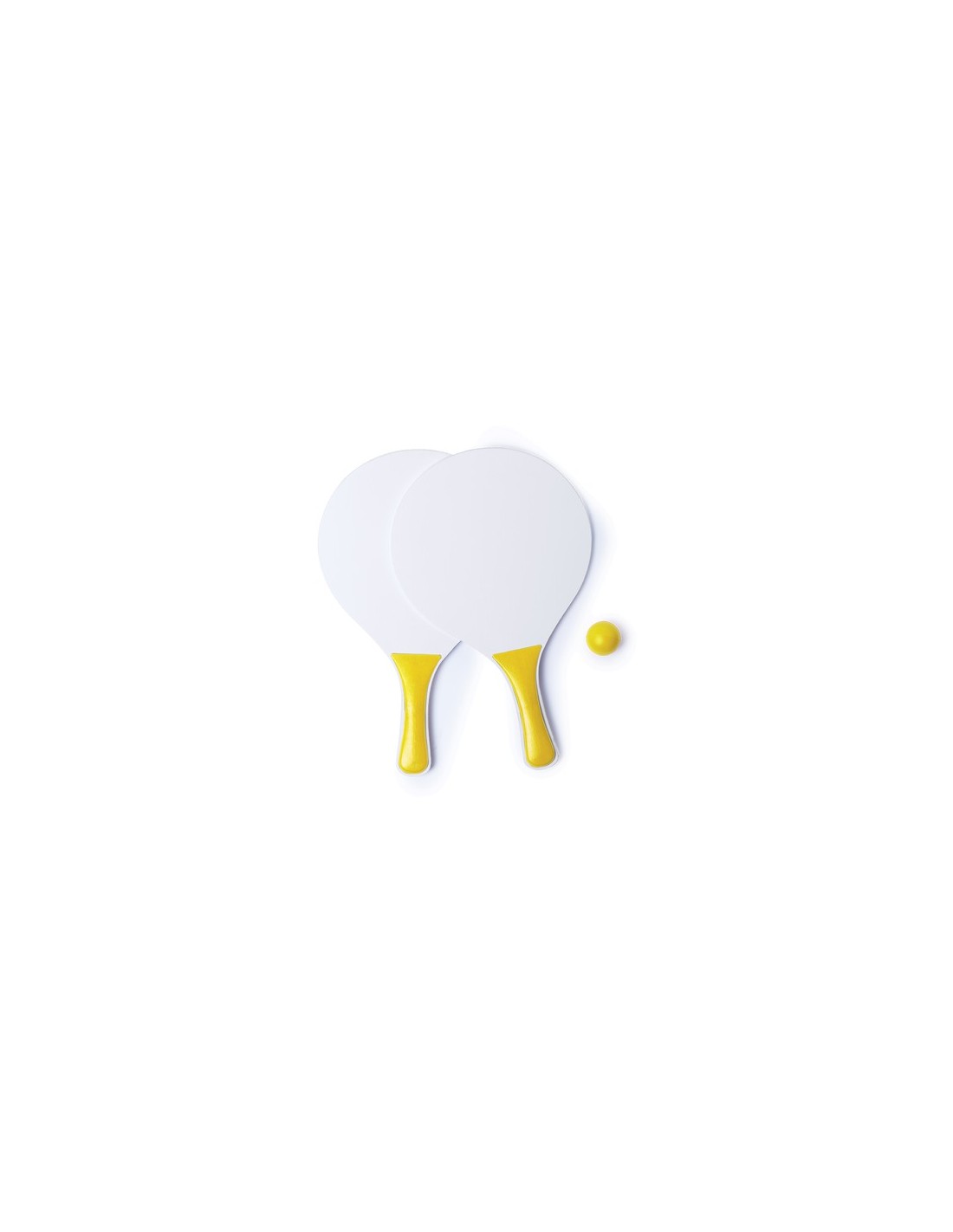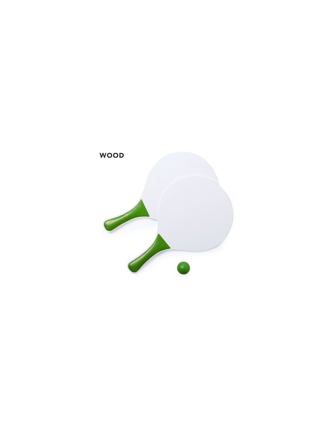 Par de palas de playa en madera natural blanca. Con mango reforzado en variada gama de vivos colores. Presentadas en bolsa redecilla con pelota a juego. Composition : Madera.