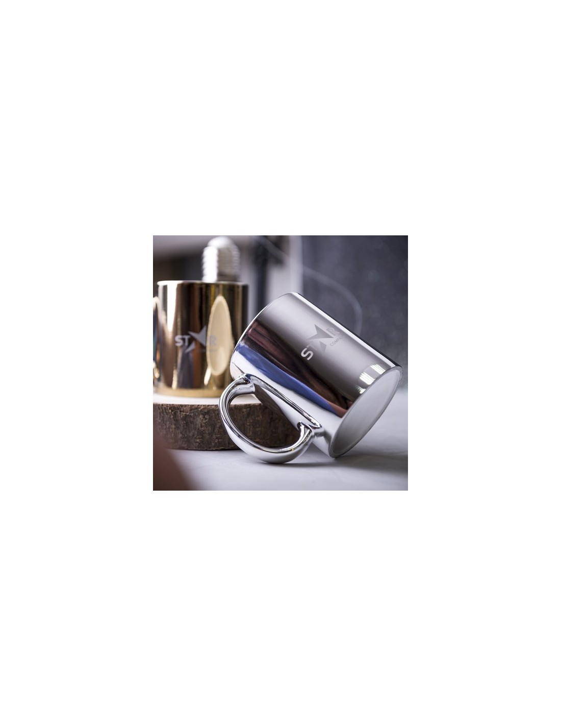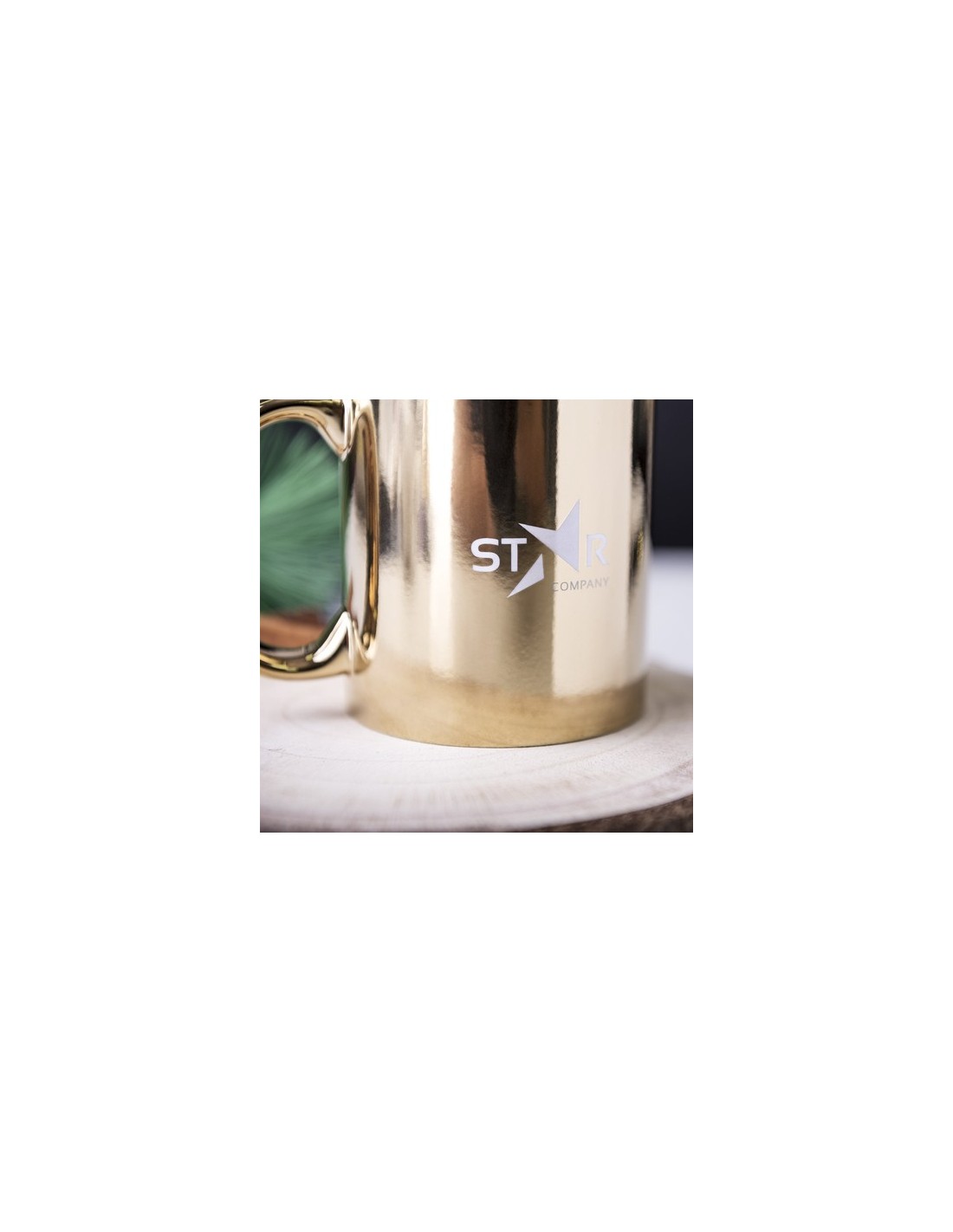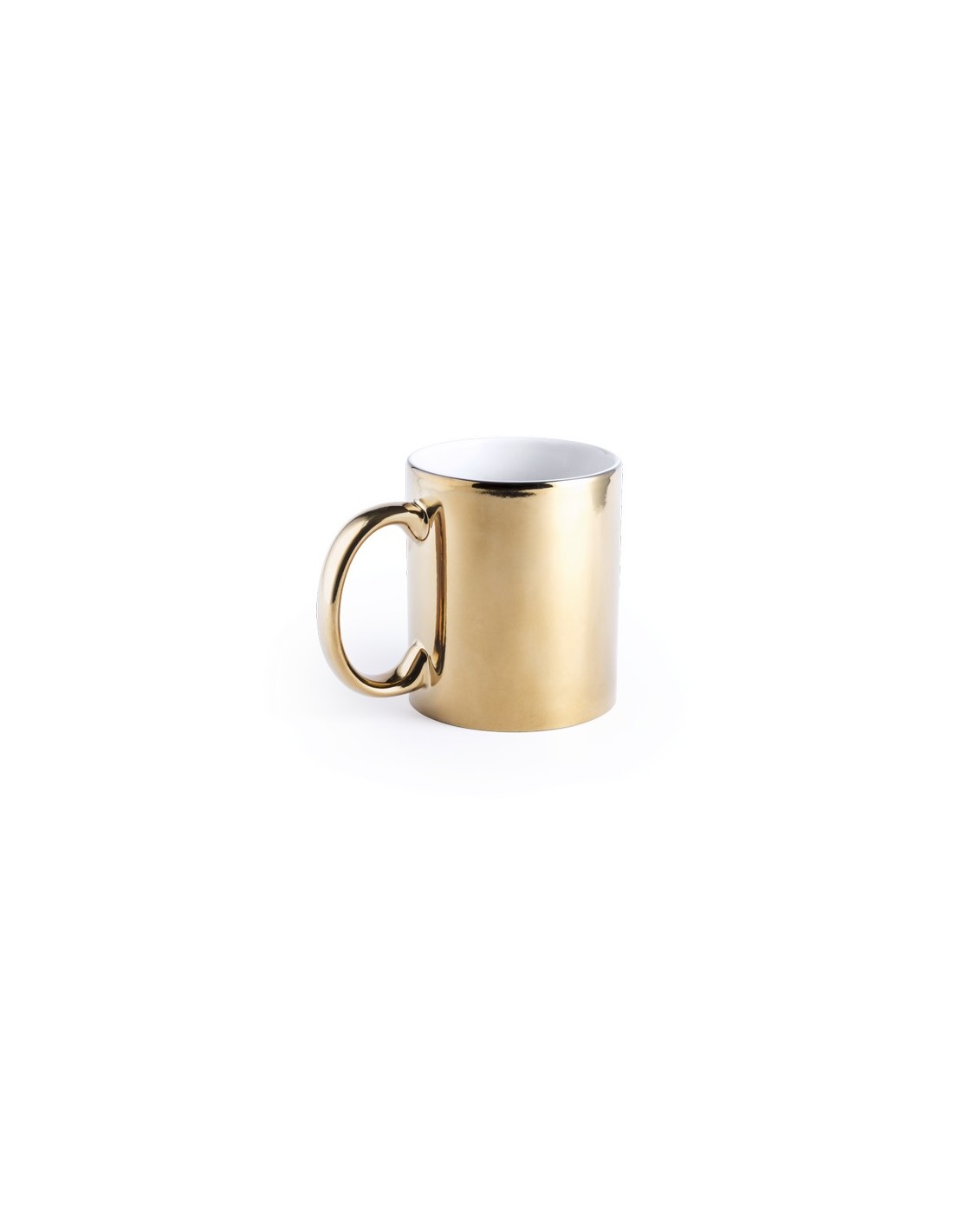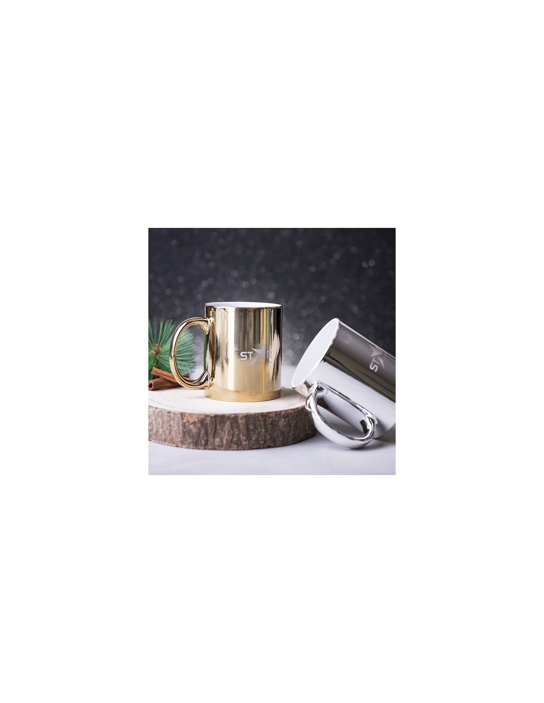 Taza de cerámica de 350ml de capacidad. Disponible en llamativos colores plateado y dorado brillantes. Especialmente diseñada para marcaje en láser, con un recubrimiento exterior metalizado especial para que tu publicidad quede perfectamente grabada en color blanco, a juego con el color interior de la taza. Presentada en caja individual. Se desaconseja su uso en el microondas debido al recubrimiento exterior metalizado. 350 ml Composition : Cerámica.