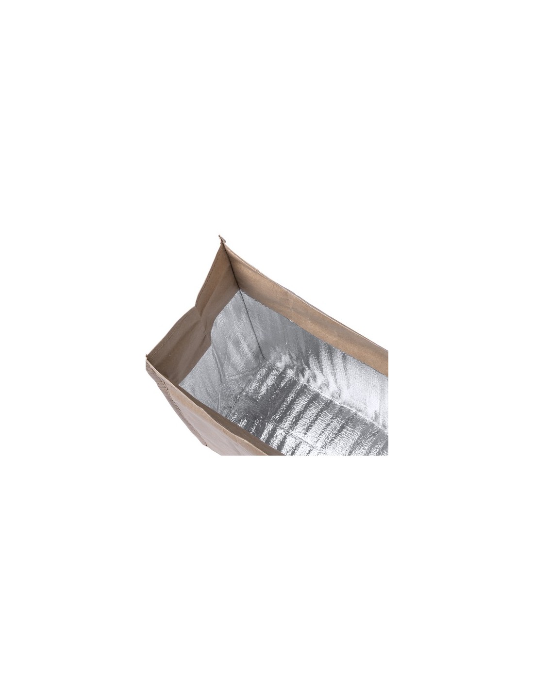 Bolsa térmica en papel resistente a la humedad de 85g/m2. Con interior isotermo acabado en aluminio, y cierre de velcro. 2,6 litros de capacidad. Composition : Papel Reciclado Laminado/ Aluminio.