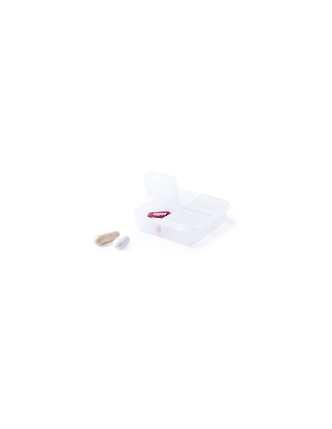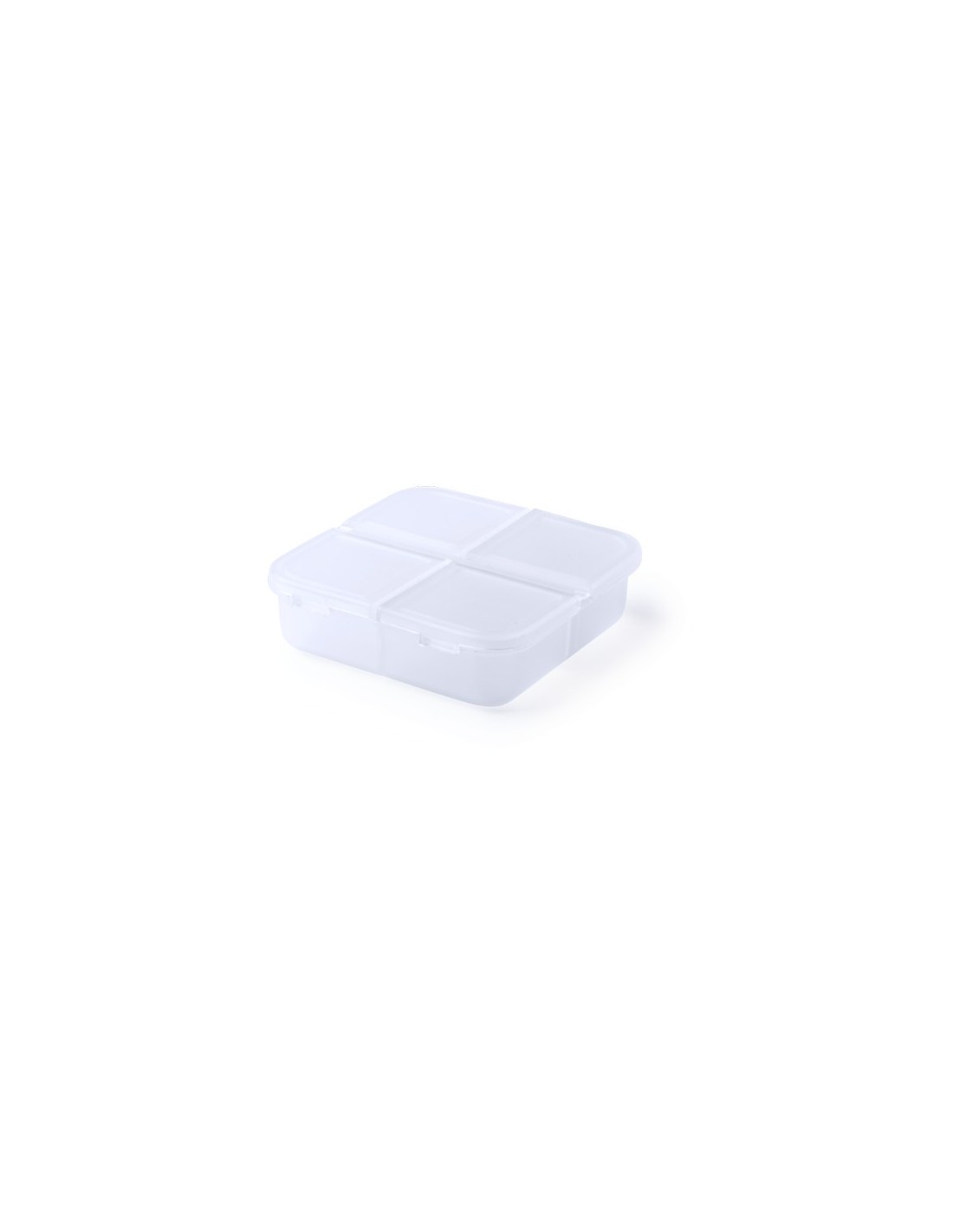 Pastillero de 4 compartimentos en material ABS de acabado translúcido y libre de BPA. Con tapa individual por compartimento. 4 Compartimentos