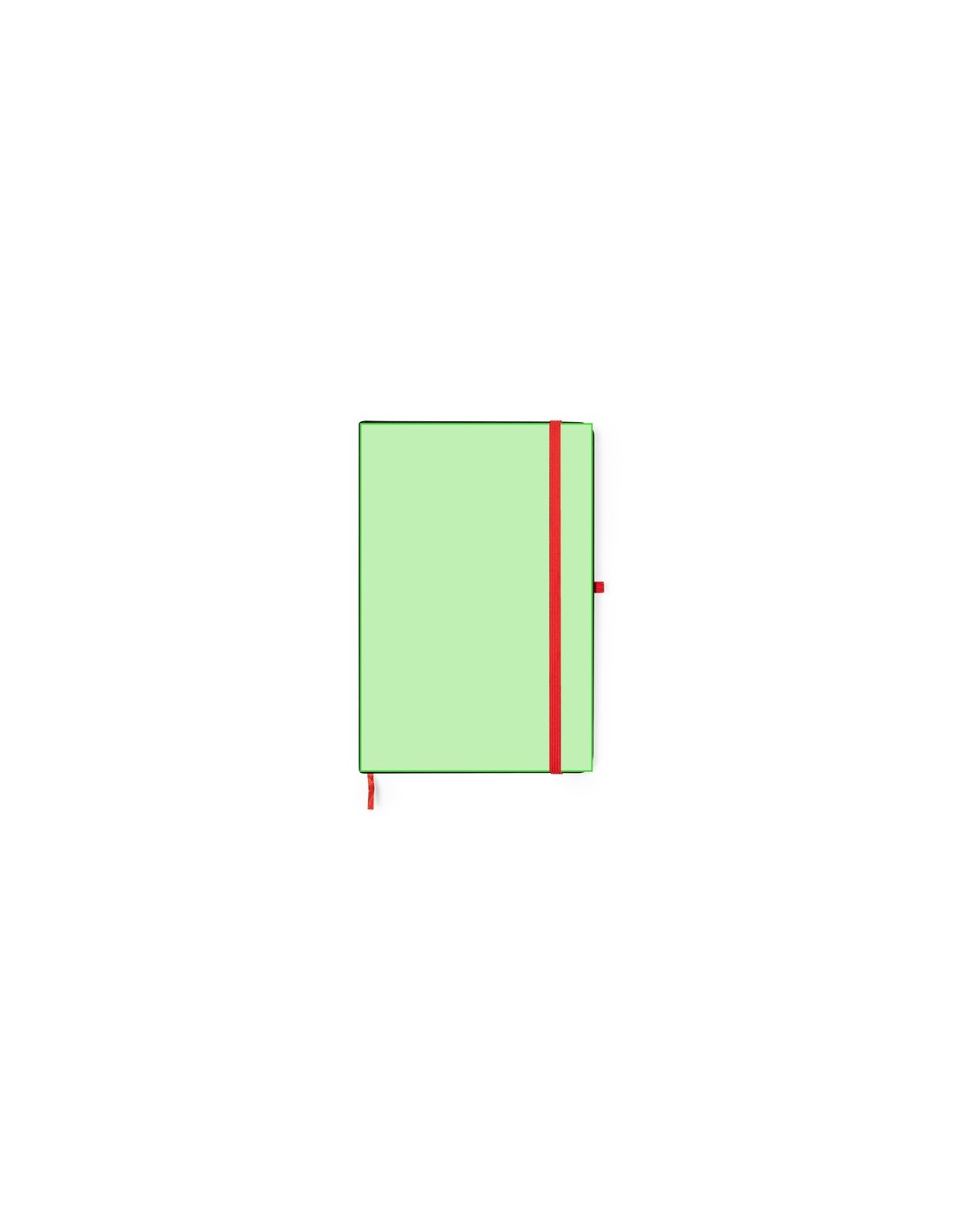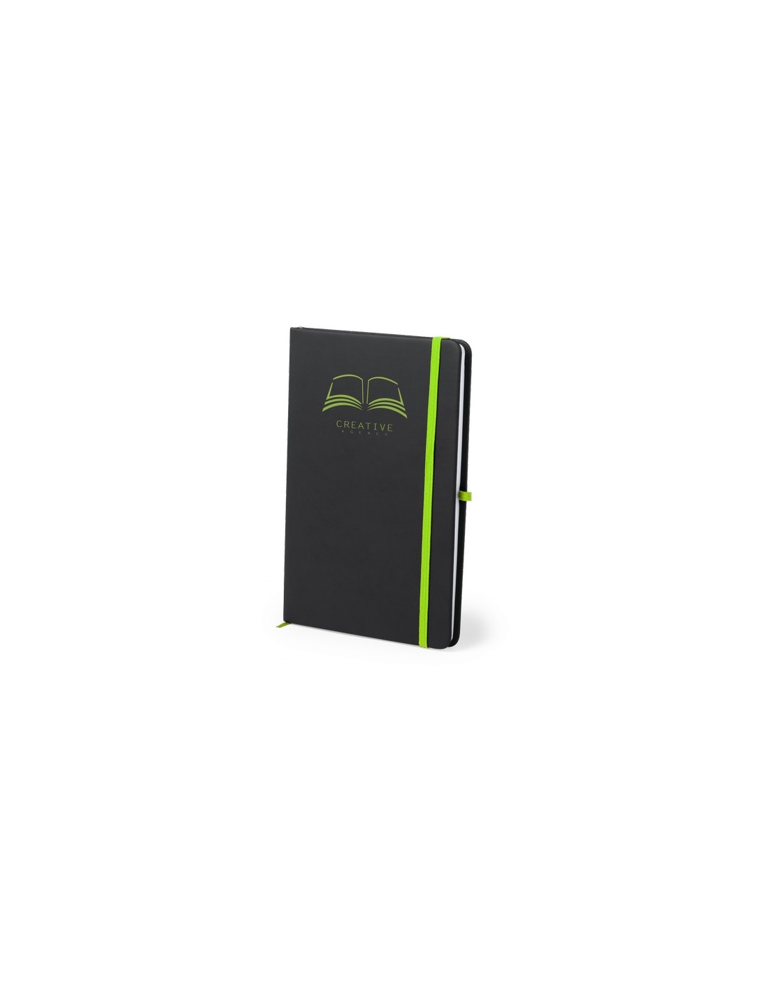 Bloc de notas con tapas de suave tacto acabadas en polipiel. En elegante color negro, con elástico de cierre, marcapáginas y soporte elástico para bolígrafo en vivos colores. Recubrimiento exterior especialmente diseñado para marcaje en láser, con el que conseguirá que su publicidad o marca quede perfectamente grabada en color a juego con el del artículo. Incluye 100 hojas con disposición a una raya. Portada Rígida. 100 Hojas Composition : Polipiel.