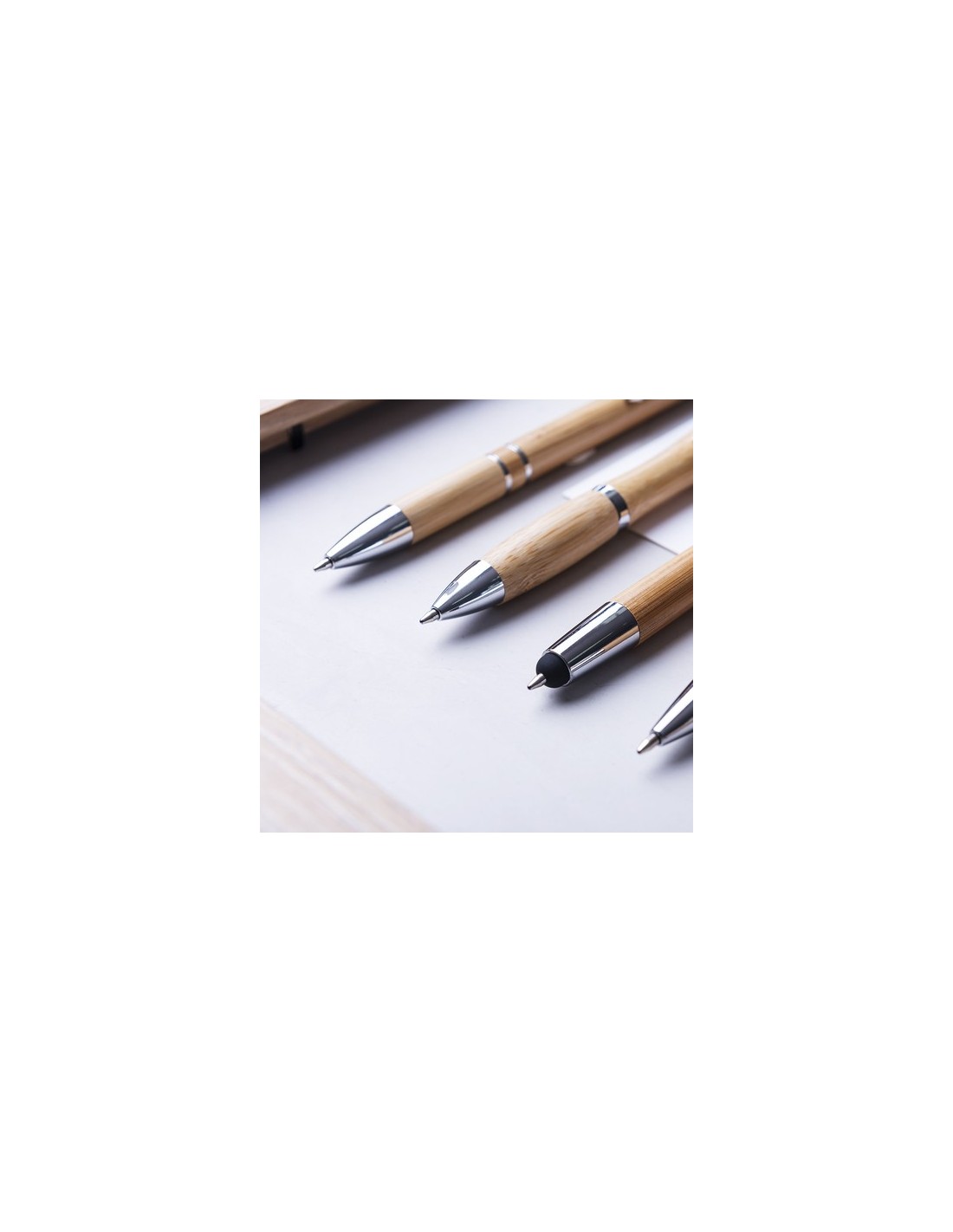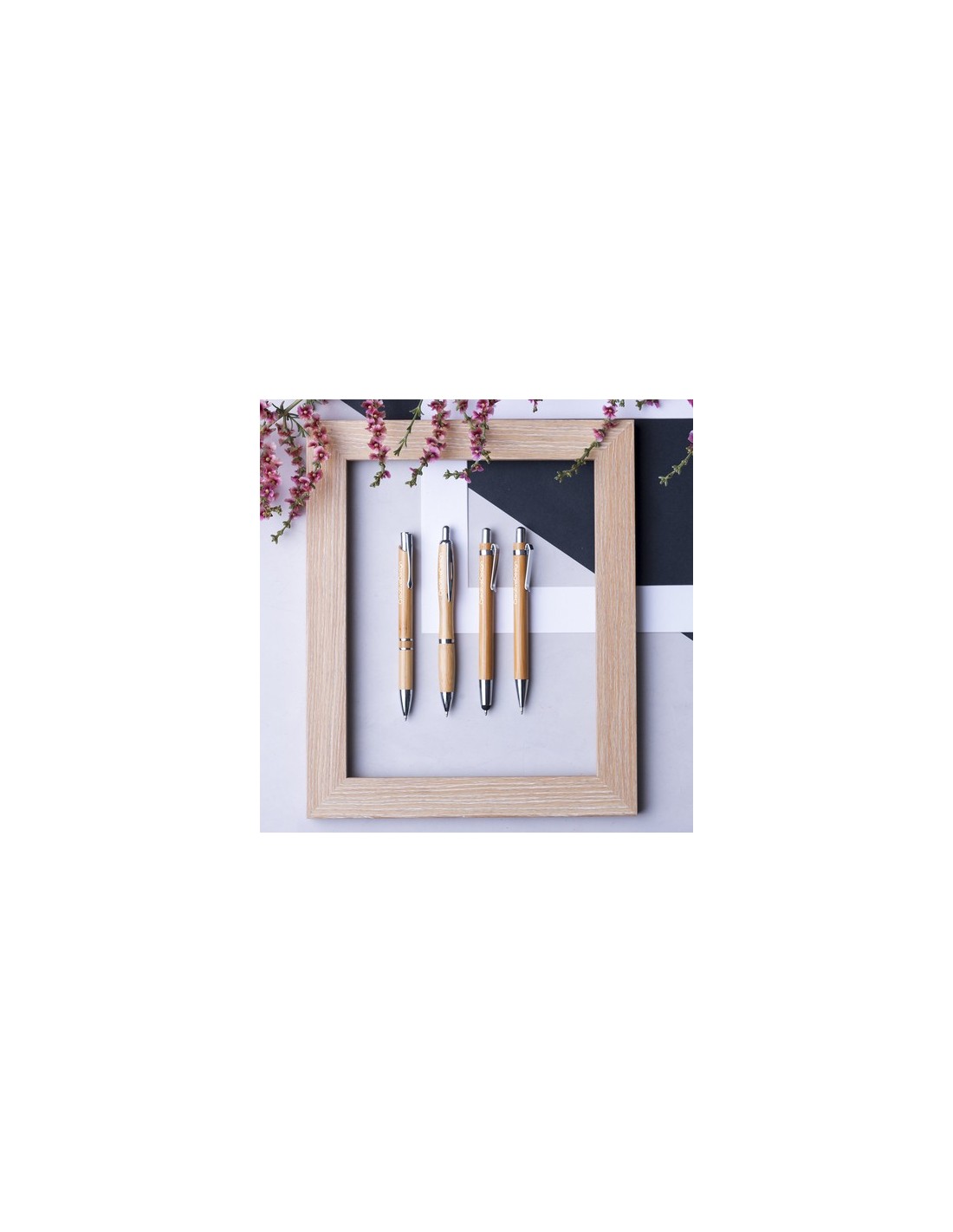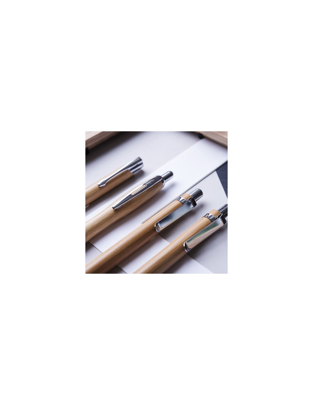 Bolígrafo de línea nature con cuerpo en madera de bambú. De mecanismo pulsador, con clip troquelado y detalles en acabado cromado. De cartucho jumbo y tinta negra. Carga Jumbo. Tinta Negra Composition : Bambú.