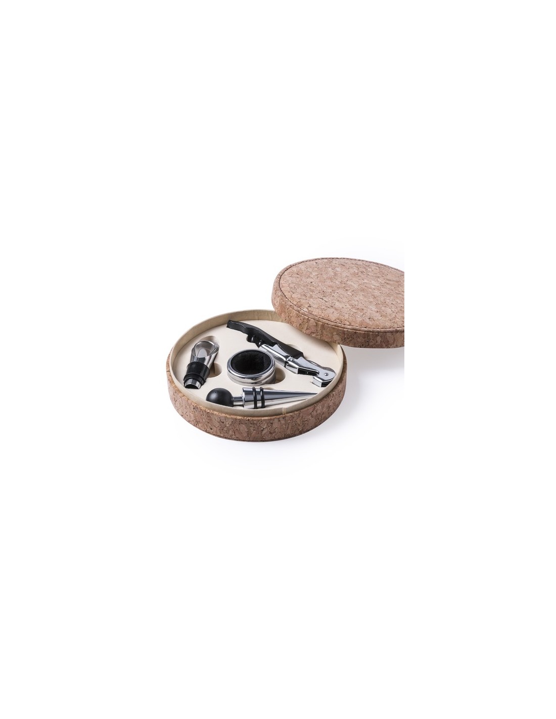 Set de vinos de elegante diseño circular con acabado en corcho natural. Accesorios de acero inox, incluye sacacorchos de 2 tiempos con cortacápsulas y abridor, tapón, dosificador y recogegotas. Presentado en estuche individual de corcho con interior en suave espuma troquelada de color beige. 4 Accesorios Composition : Corcho.