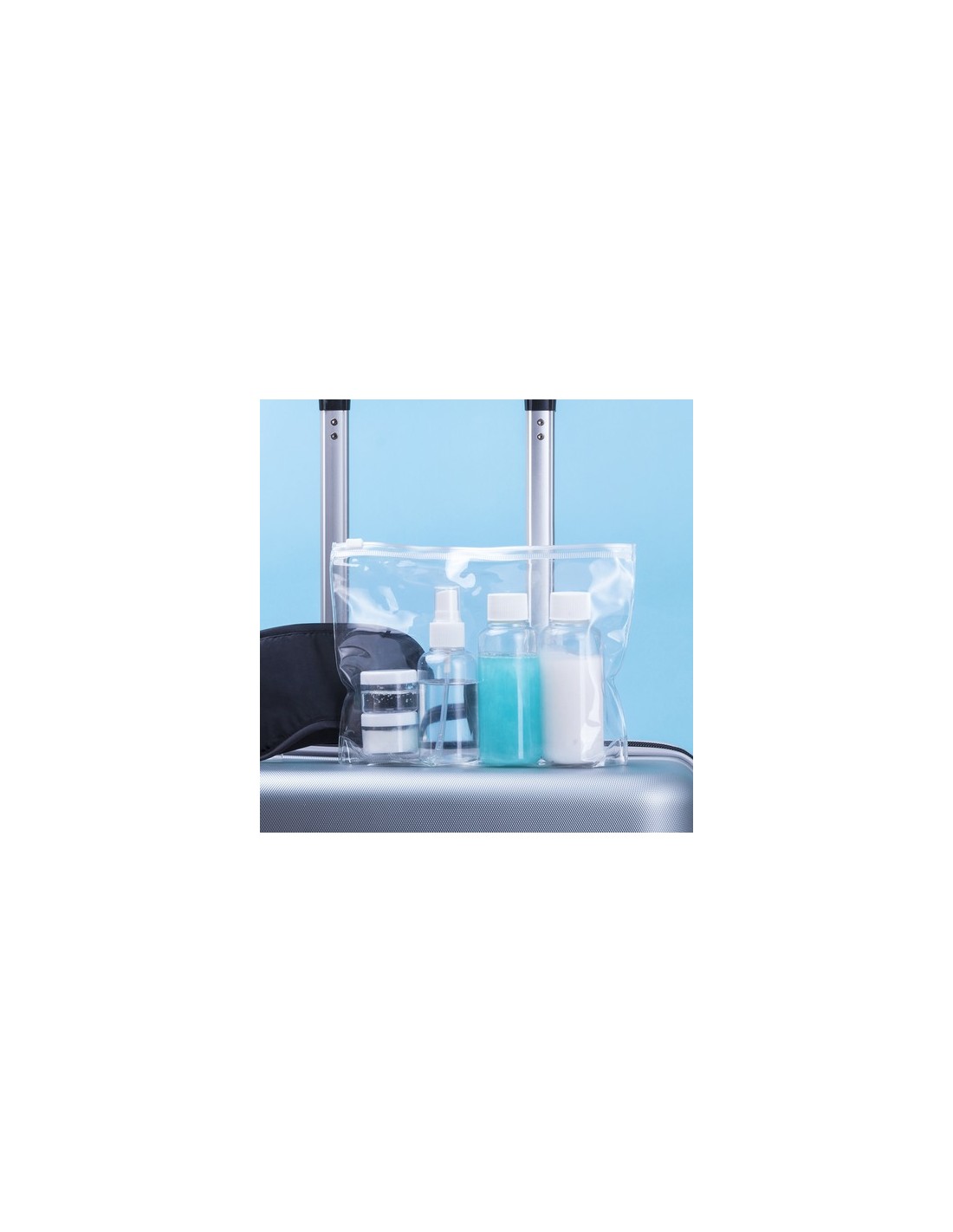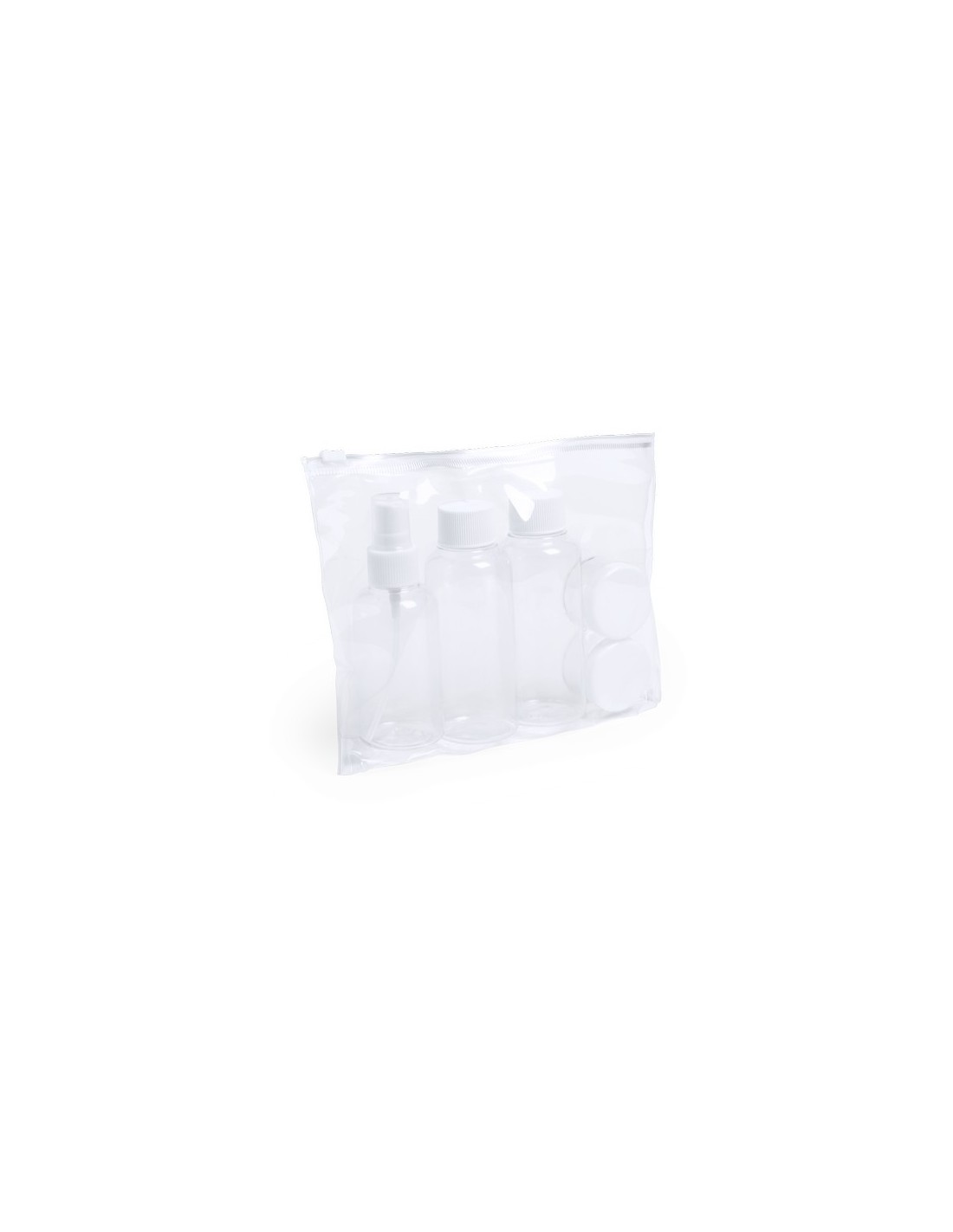 Set neceser de viaje de 5 accesorios en diseño transparente. Incluye dos botes para gel y champú con tapón a rosca, perfumador y dos tarritos para crema. Presentado en estuche de PVC con cierre hermético a juego. 5 Accesorios Composition : PVC/ PP.