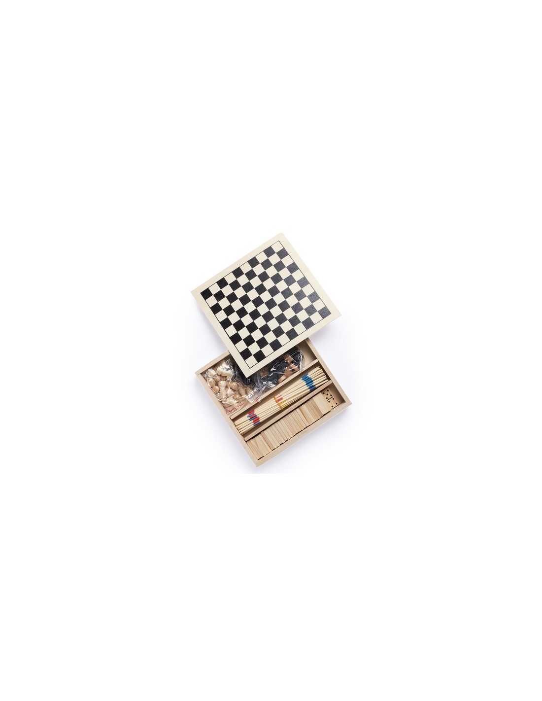 Set de juegos en madera. Incluye mikado, ajedrez, damas y dominó. Presentado en estuche de madera con tapa-tablero. Tablero con lado liso para marcaje. 4 Juegos Composition : Madera.