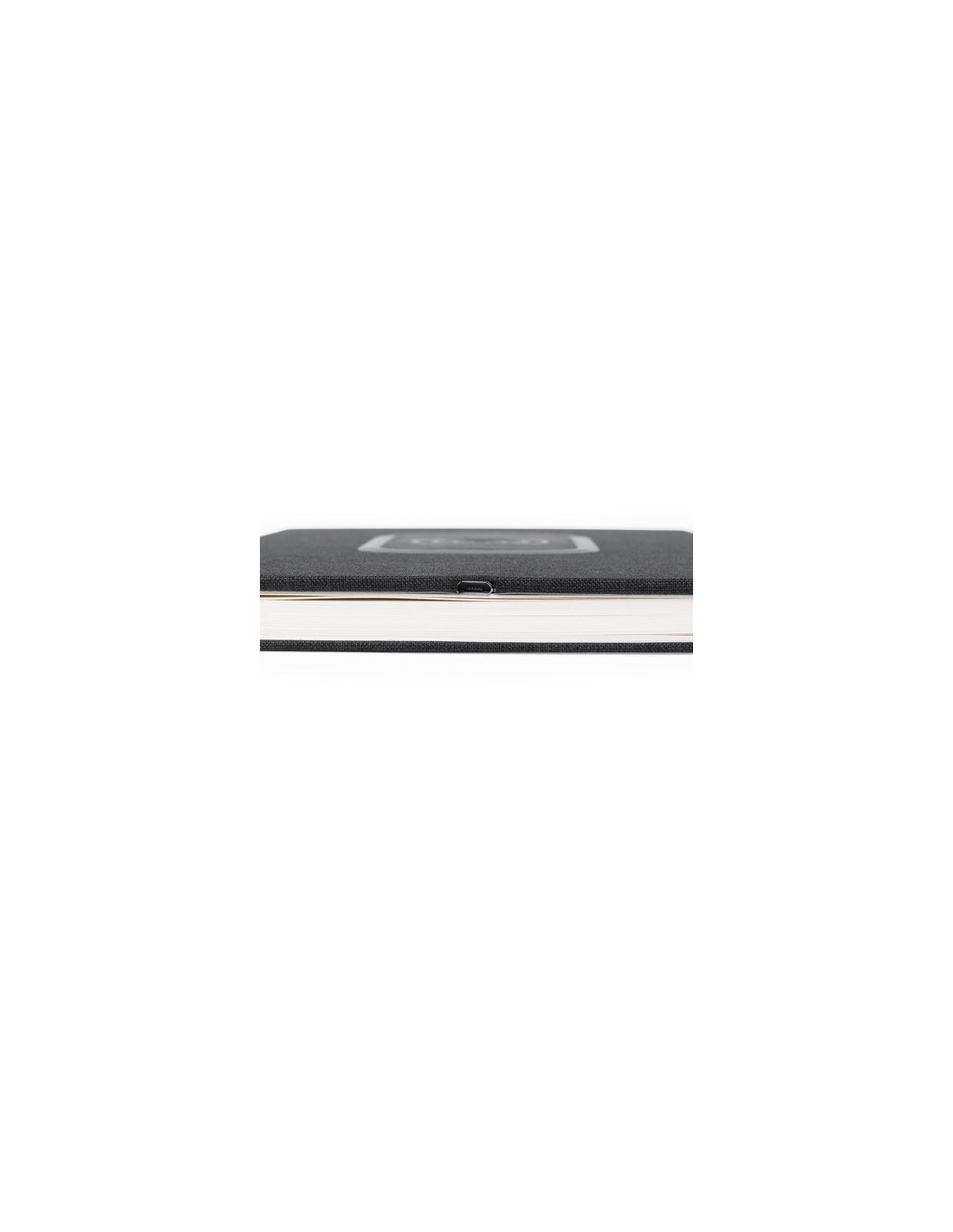 Bloc de notas cargador en resistente poliéster 300D con cargador inalámbrico integrado. De sobrio diseño y original estación de carga en la portada. Incluye 80 hojas con disposición a una raya. Inalámbrico 5W. Portada Rígida. 80 Hojas Composition : Poliéster 300D.