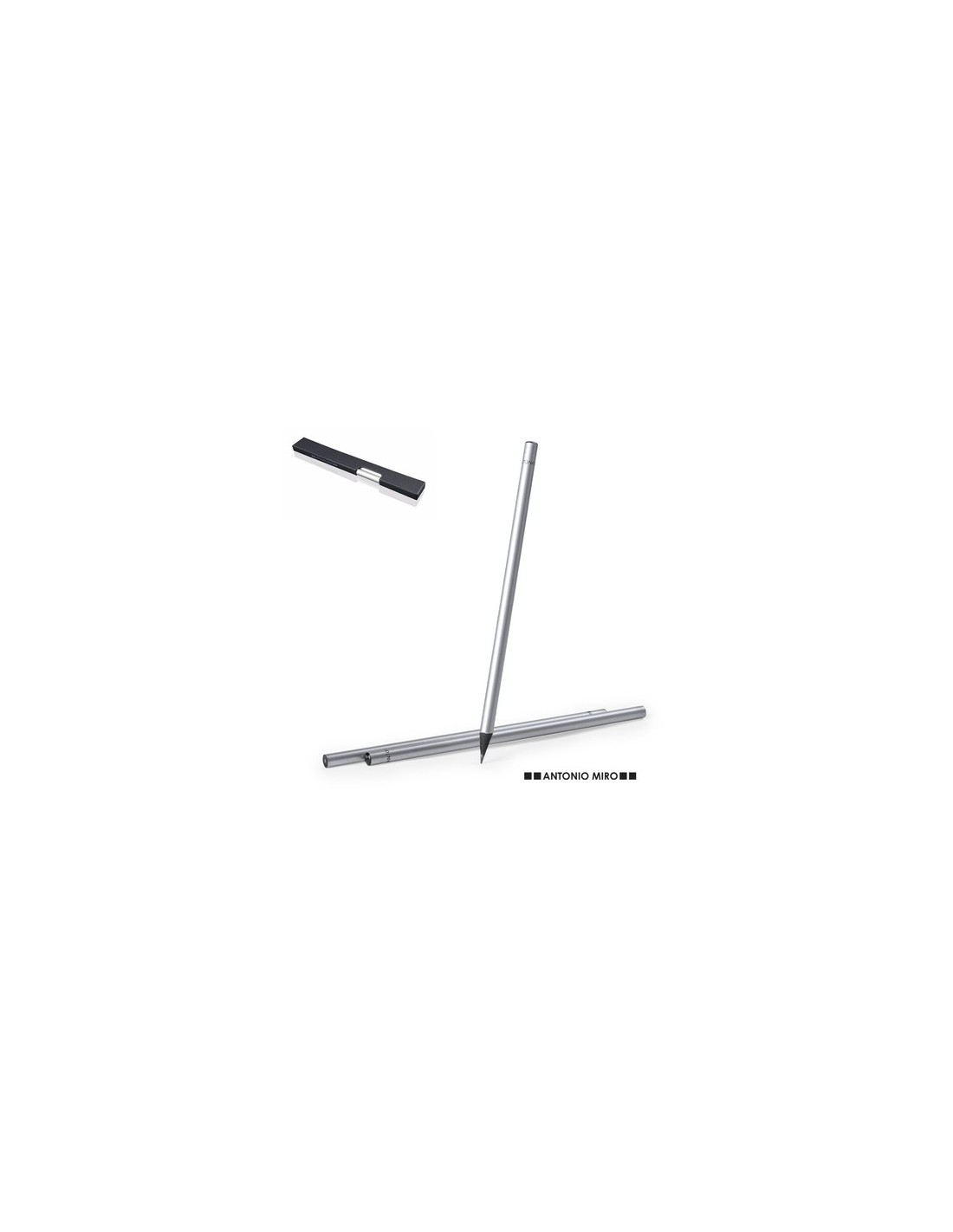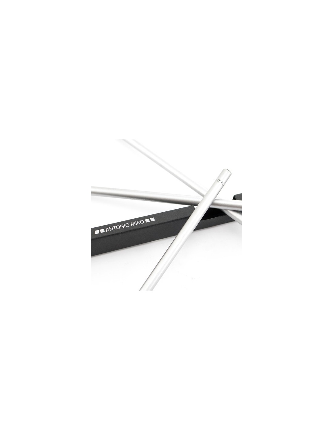 Set de 3 lápices de madera de Antonio Miró en elegante acabado plateado, con logotipo de la marca en parte superior. Presentados en elegante estuche de cartón negro con ventana y logotipo de la marca. 3 Lápices