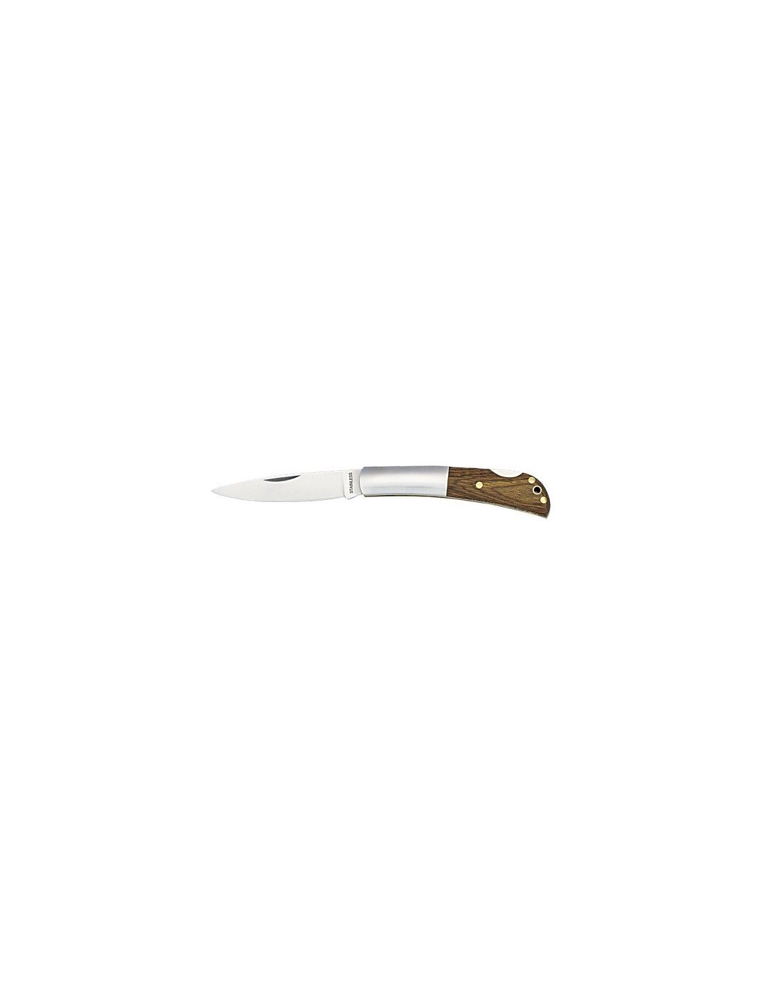 Navaja con hoja en acero inox y empuñadura en combinación de madera natural con acero inox. Con bloqueo de seguridad, troquelado en mango y presentada en caja individual. Con Bloqueo Composition : Madera/ Acero Inox.