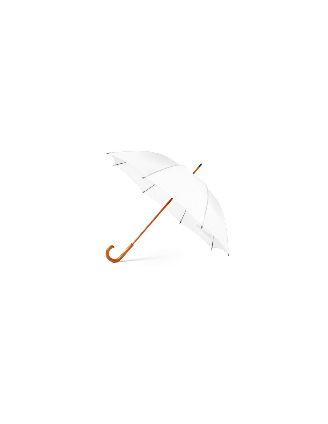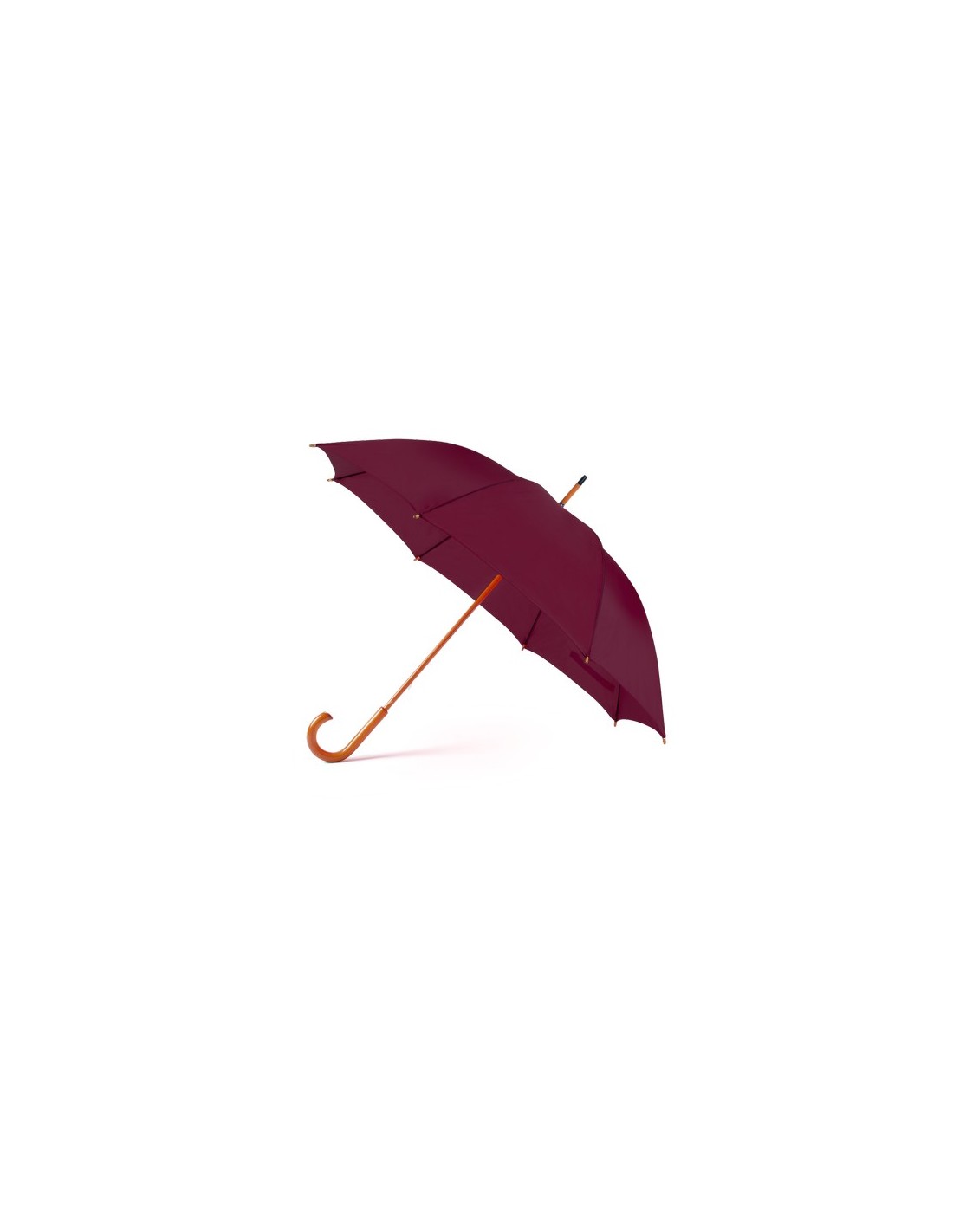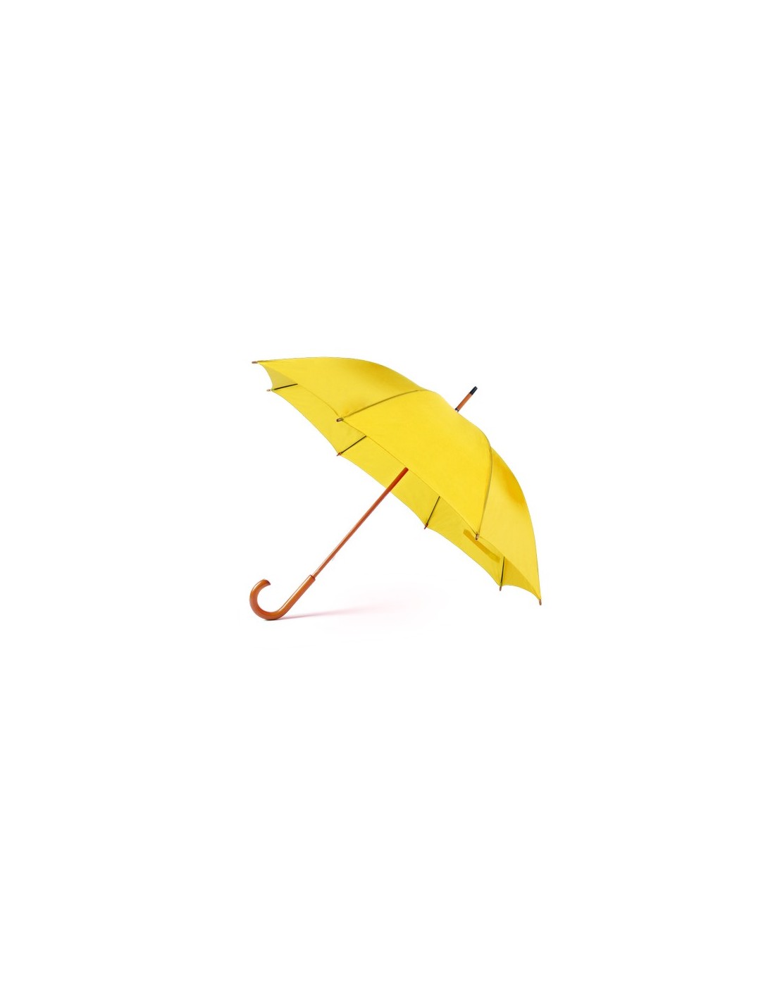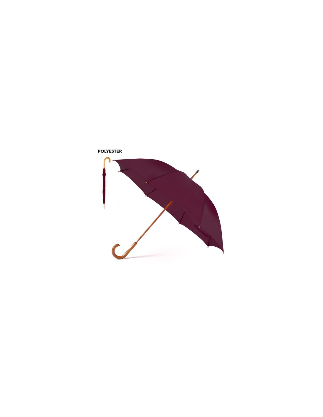 Paraguas de 8 paneles confeccionado en poliéster. De 105cm de diámetro, con apertura manual, varillas metálicas en color negro y cierre de velcro. Palo y mango fabricados en suave madera de color natural, con tela en variada gama de vivos colores. 23". Mango y Caña Madera Composition : Poliéster 190T. Varillas Metal.