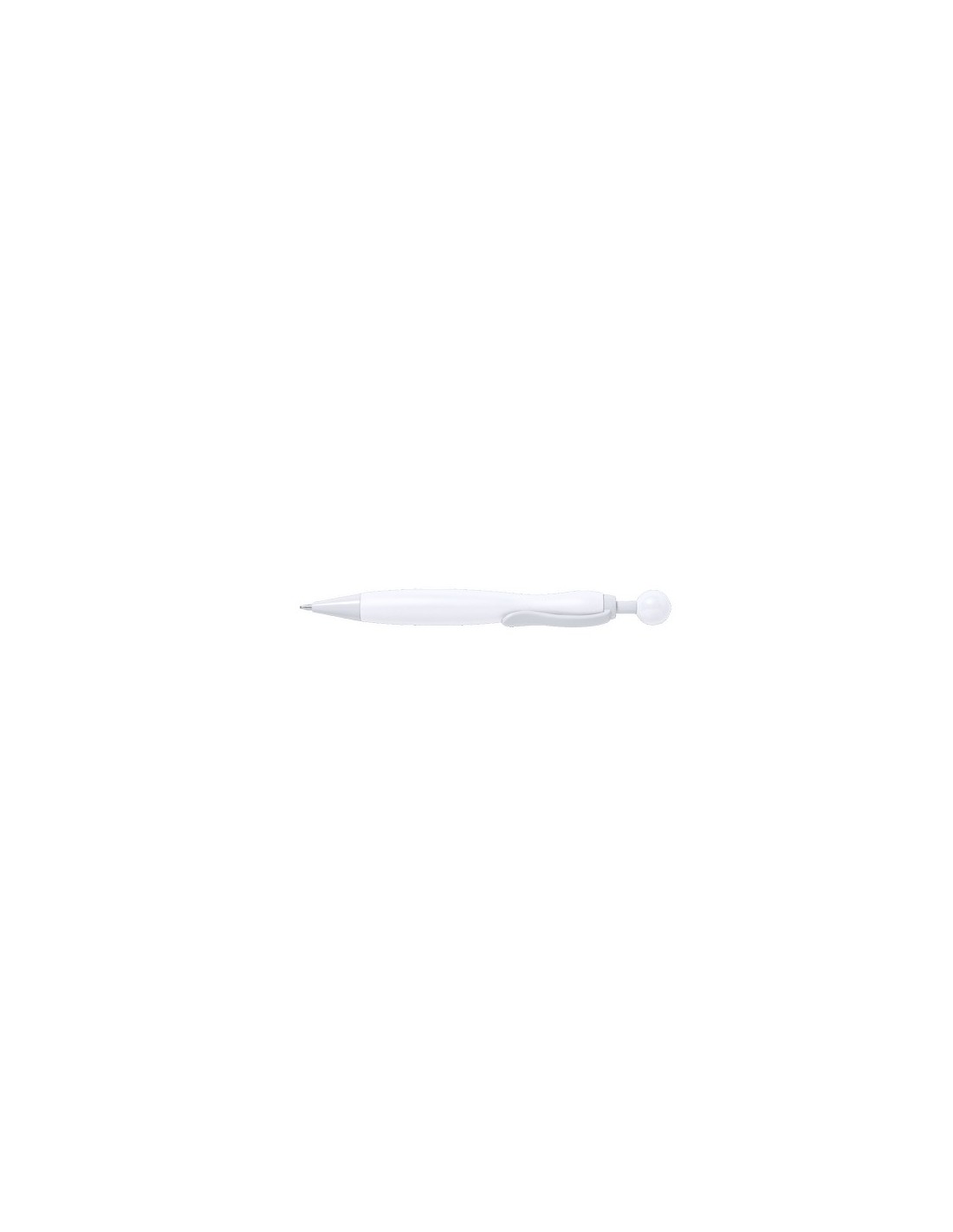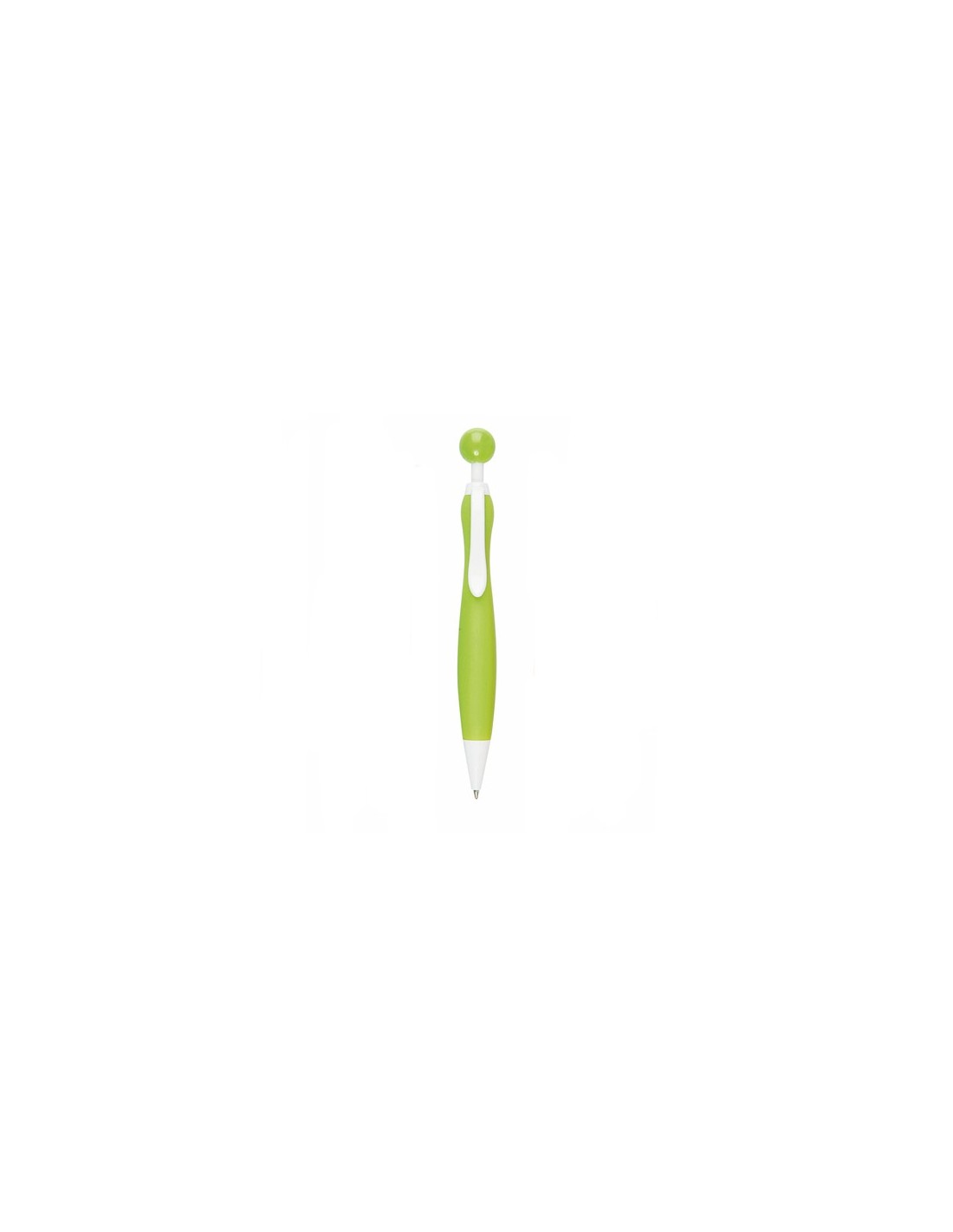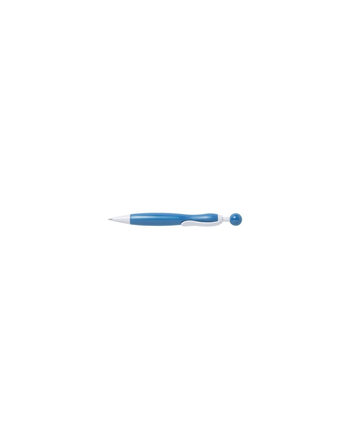 Bolígrafo de mecanismo pulsador de atrevido diseño bicolor con accesorios en color blanco sólido y cuerpo curvado de suave acabado en llamativos colores sólidos. Con original clip pulsador en forma de bola a juego. De cartucho jumbo y tinta azul. Carga Jumbo
