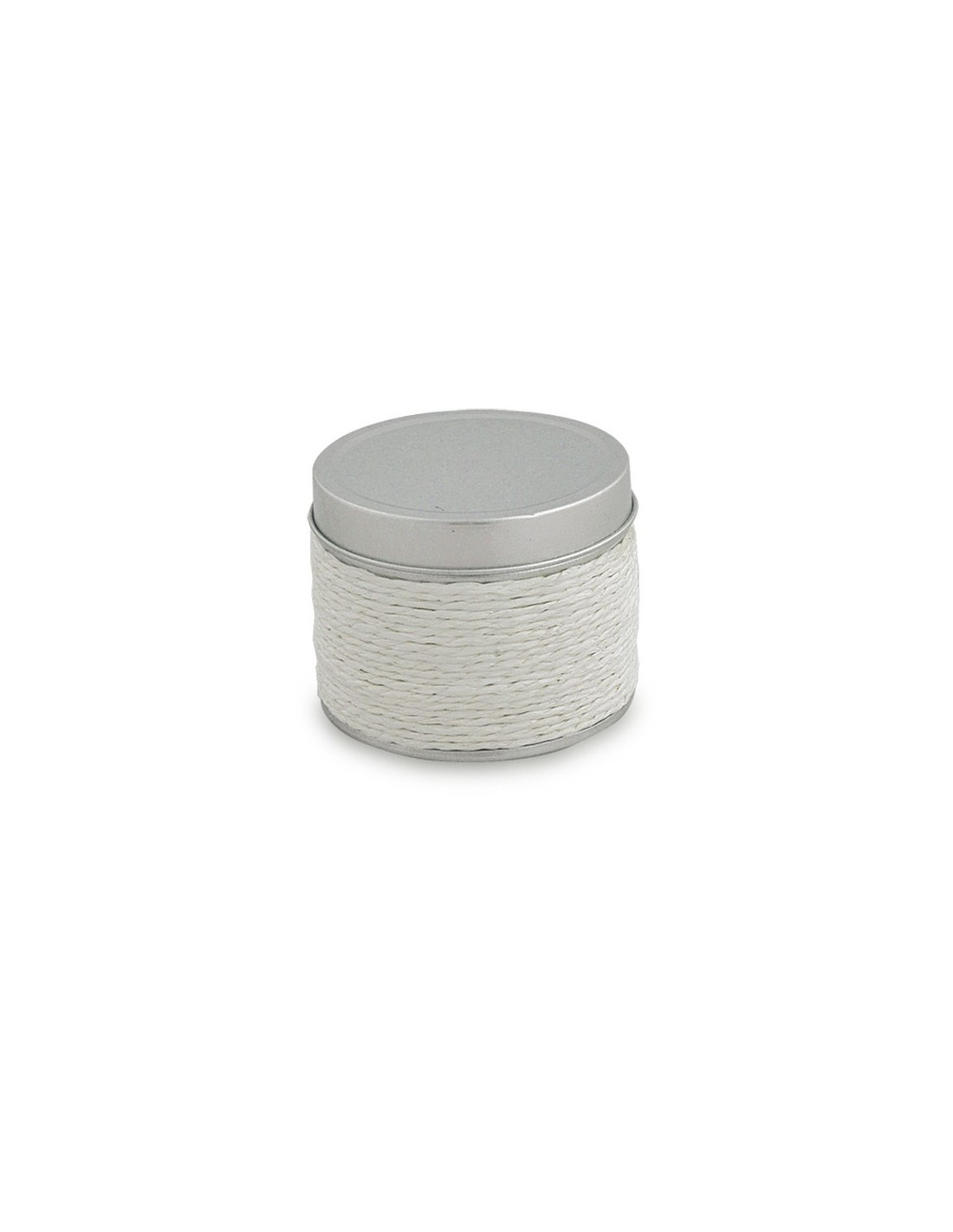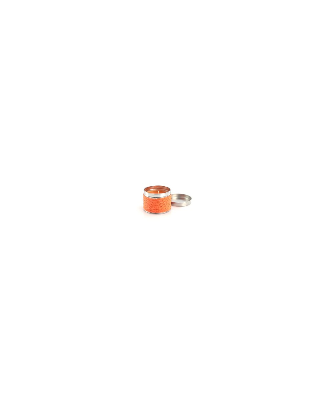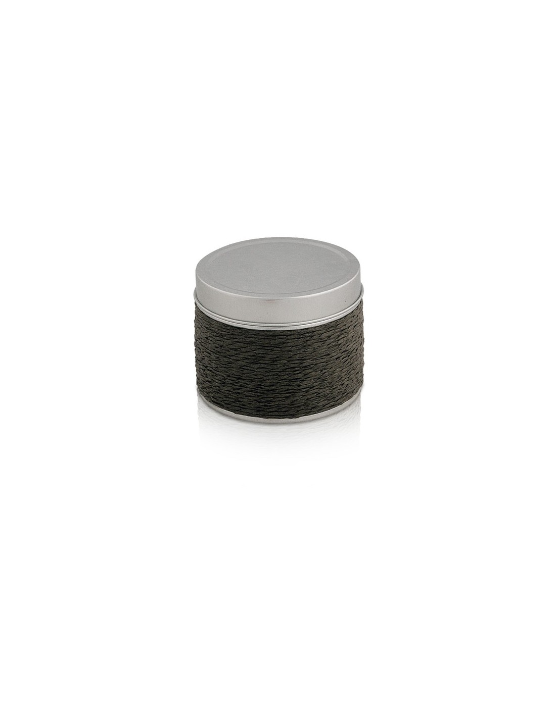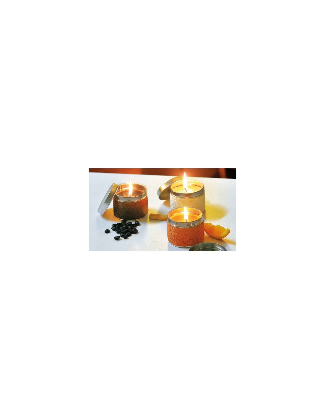 Vela aromática con envase metálico y cuerpo revestido de hilo en variada gama de colores. Disponible en aromas vainilla, naranja y chocolate. Composition : Metal.