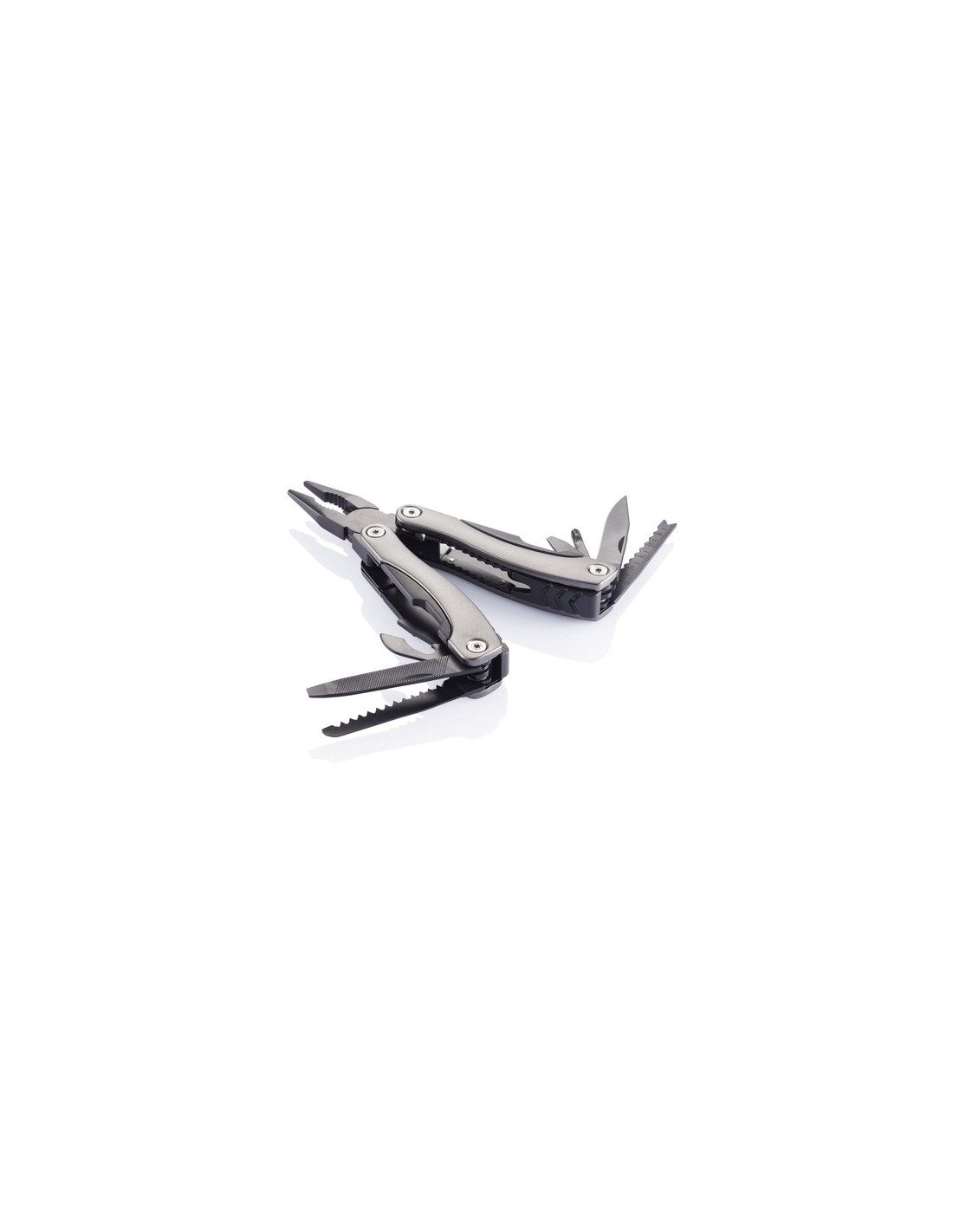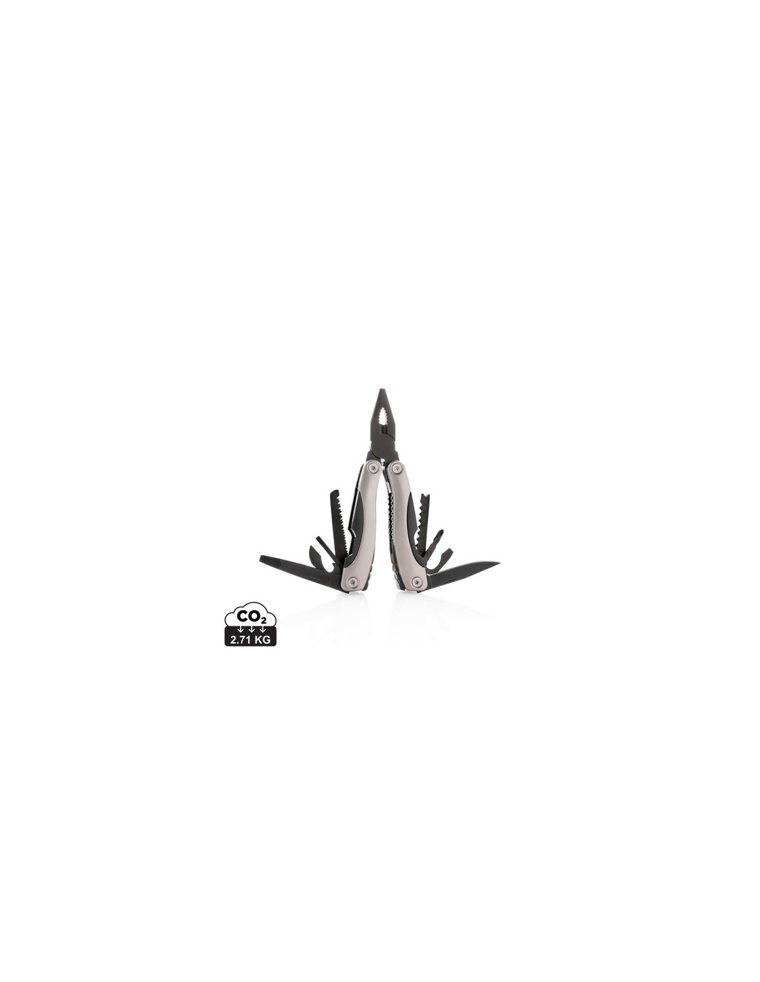 Multiherramienta con 14 funciones, es de acero inoxidable negro con agarre de aluminio anodizado. Incluye funda negra. Material : Acero inoxidable, Aluminio Recycled Content Percent : 0 Conforme directiva AZO dye 2002/61/EC, Conforme directiva Cadmio 91/338/EC, Conforme contenido de plomo U.S, Conforme legislación alimentos Alemania, Conforme directiva SVHC 1907/2006/EC, Libre de parafinas cloradas de cadena corta y media. Packaging : Bolsa de plástico y caja individual All print codes : Laser Engraving 2,Pad Print - Print code default : Grabado a láser - parte frontal e izquierda del artículo - 6 x 30 mm - max color : 1 Social Audits : BSCI Total CO2 emissions : 2,71.