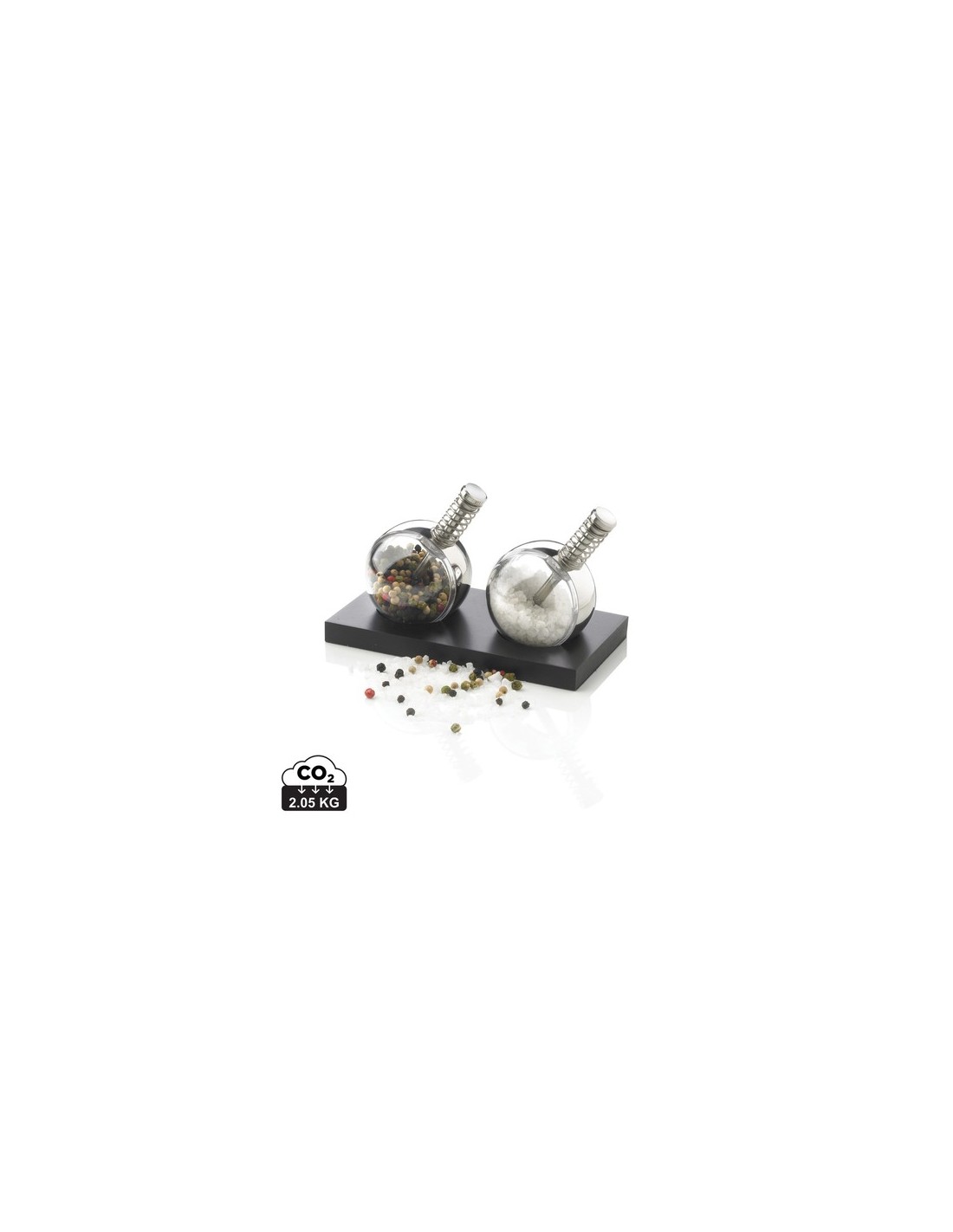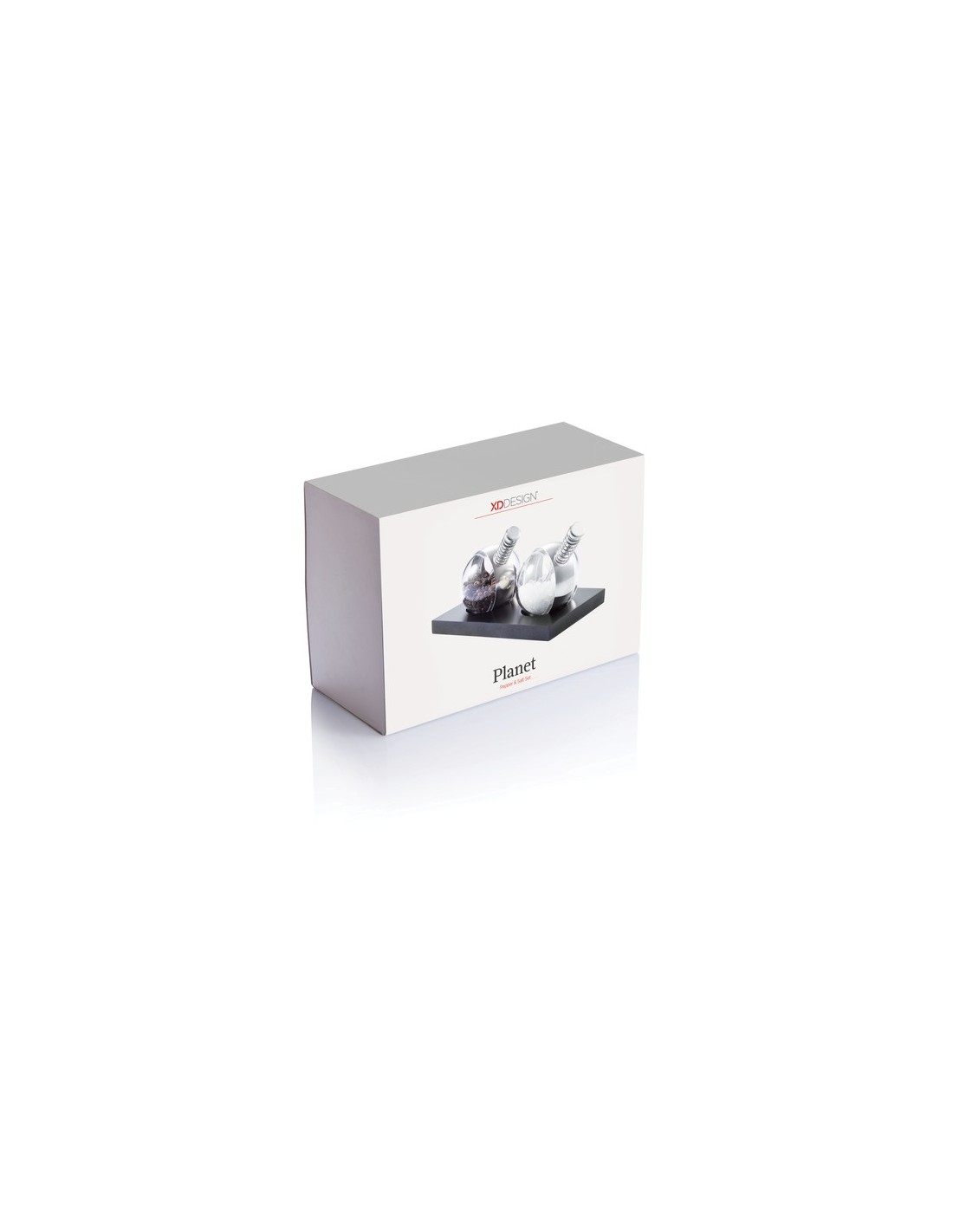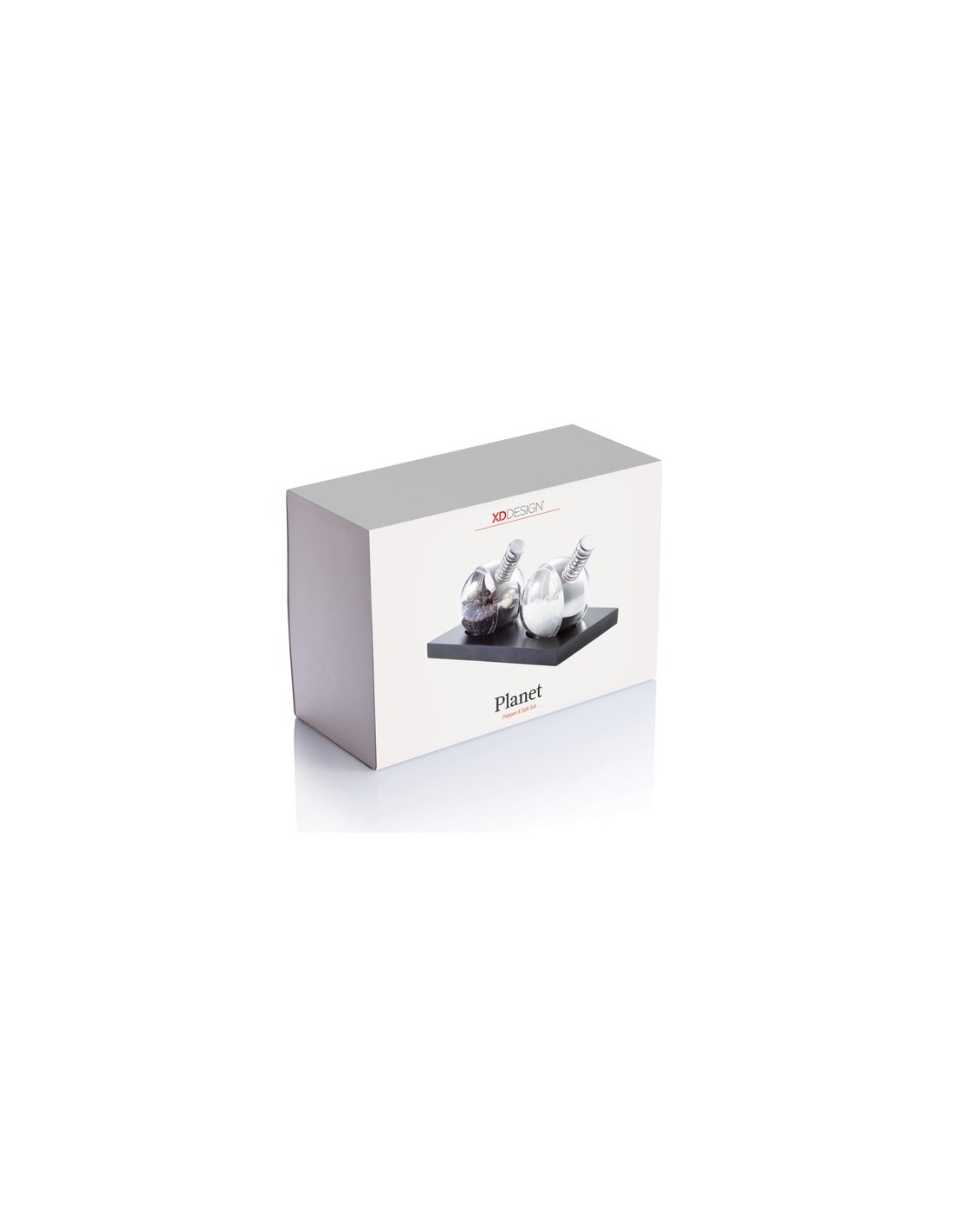Planet es un moderno set sal y pimienta de diseño único con el que gracias a su molinillo podrás dispensar con una sola mano. Las esferas transparentes te ayudarán a ver el nivel de sal y pimienta. Diseño registrado® Material : Acero inoxidable, Madera Recycled Content Percent : 0 Sin materiales Bisphenol A, Conforme legislación alimentos Alemania, Conforme directiva SVHC 1907/2006/EC, Libre de parafinas cloradas de cadena corta y media. Packaging : Bolsa de plástico y caja individual All print codes : Pad Print,Laser Engraving 2,Doming - Print code default : Tampografía - bandeja - 30 x 15 mm - max color : 5 Social Audits : BSCI Total CO2 emissions : 2,05.