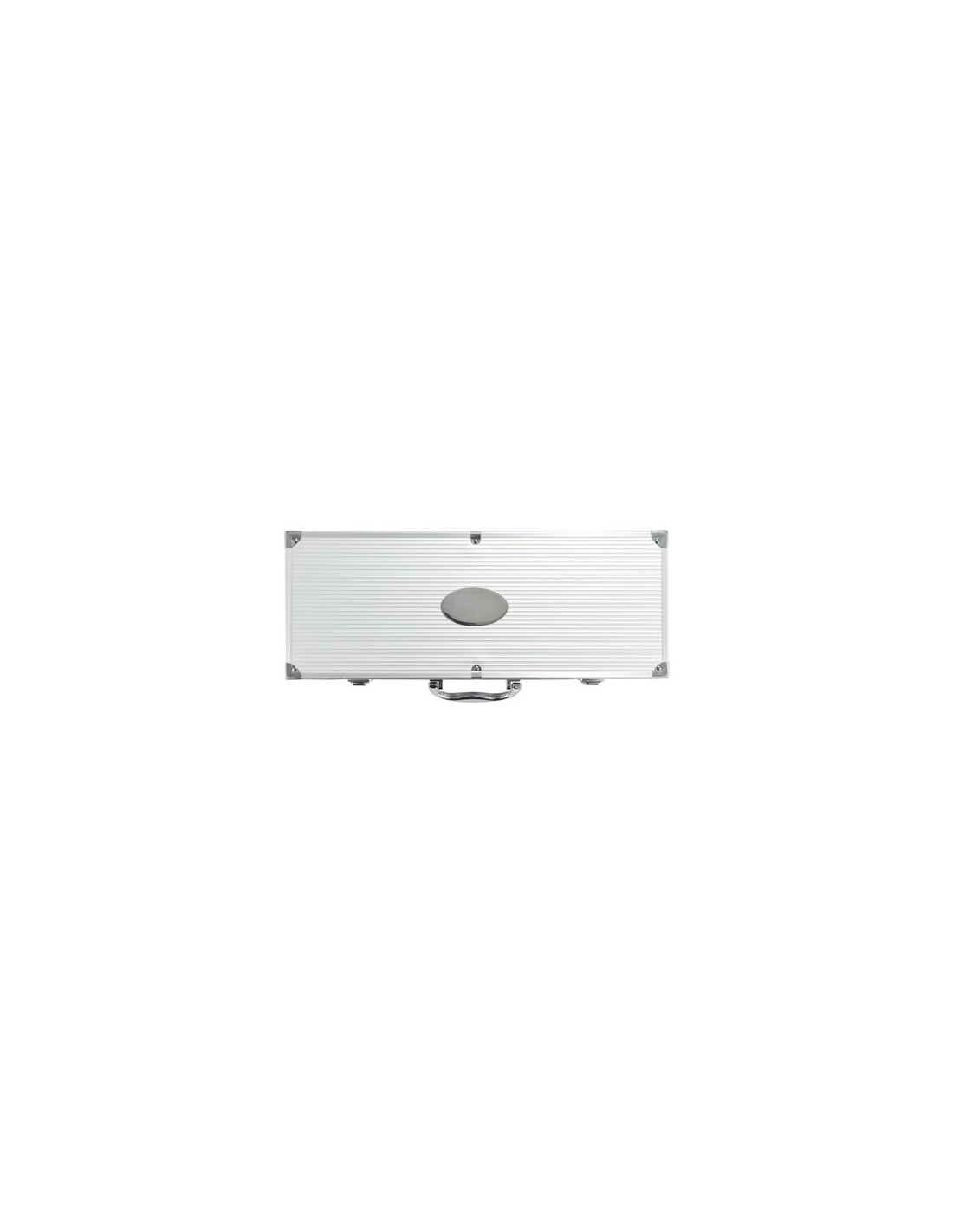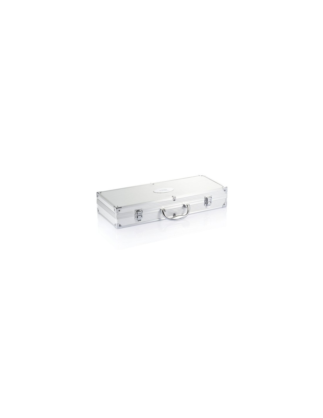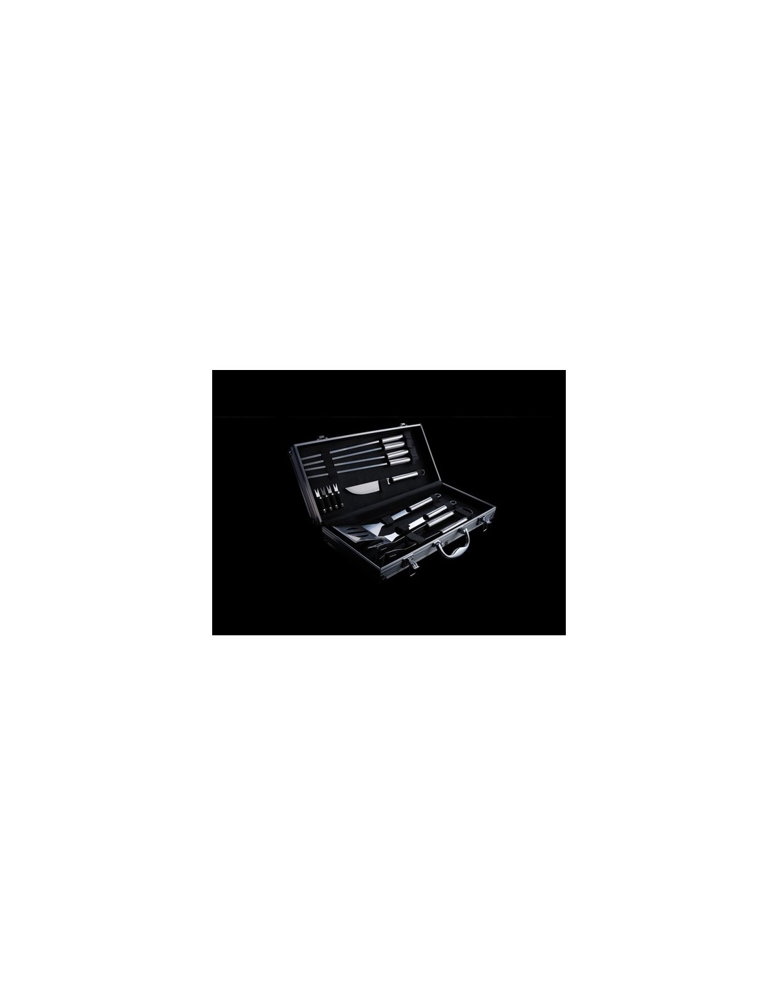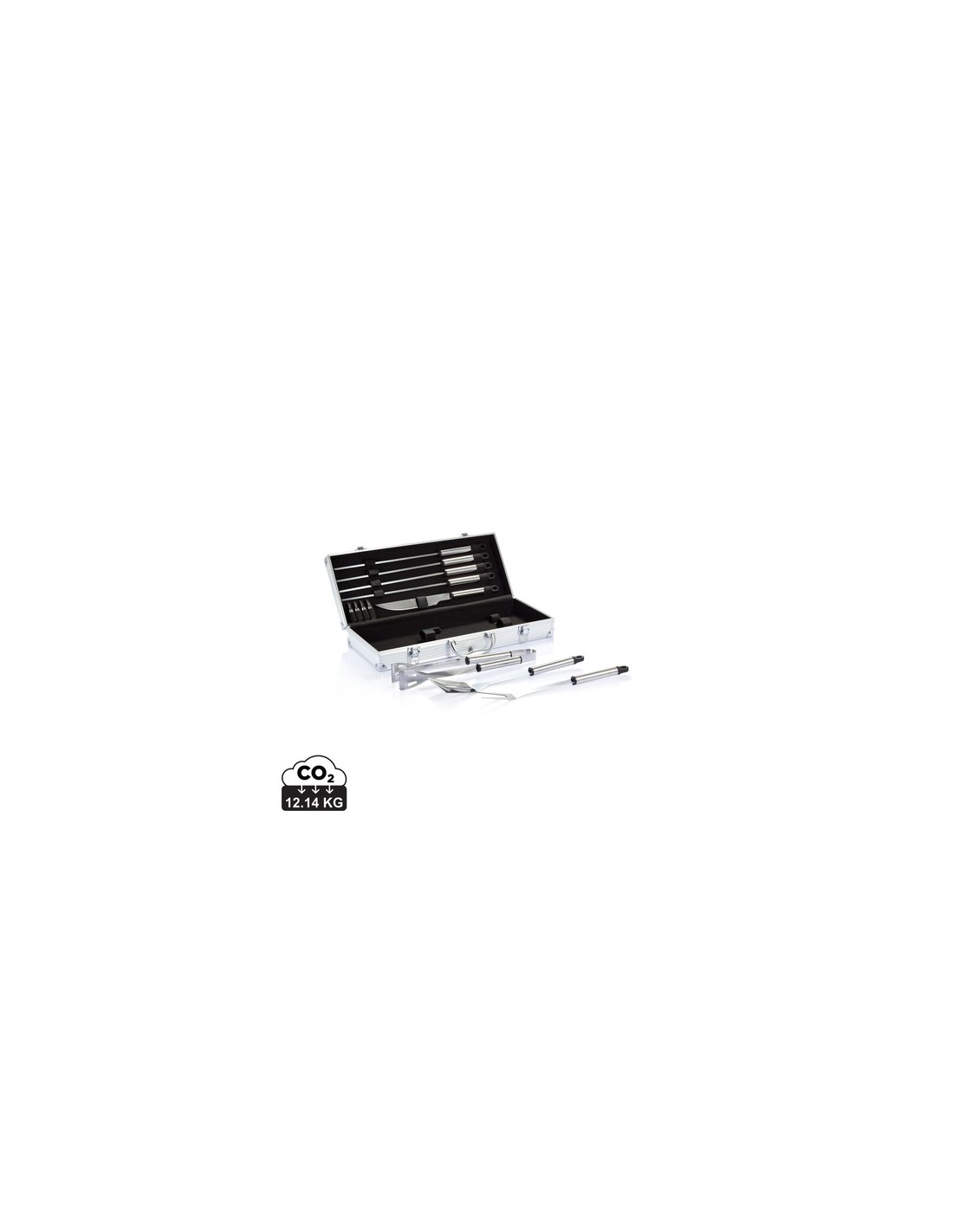 Set Barbacoa de 12 piezas de acero inoxidable incluye cuchillo, 4 pinchos para mazorcas, 4 pinchos para brochetas, espátula, tenedor con protector y tenazas. Presentado en caja de aluminio con bisagras y asa. Material : Acero inoxidable, Aluminio Recycled Content Percent : 0 Libre de parafinas cloradas de cadena corta y media., Conforme directiva SVHC 1907/2006/EC, Conforme legislación alimentos Alemania, Sin materiales Bisphenol A Packaging : Caja individual All print codes : Laser Engraving 2,Pad Print,Doming - Print code default : Grabado a láser - placa metálica - 50 x 25 mm - max color : 1 Total CO2 emissions : 12,14.