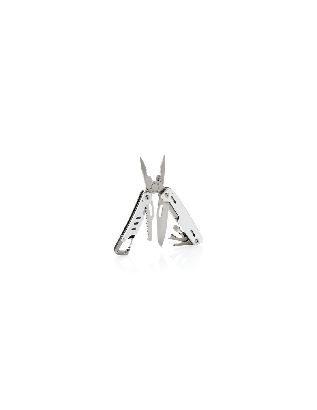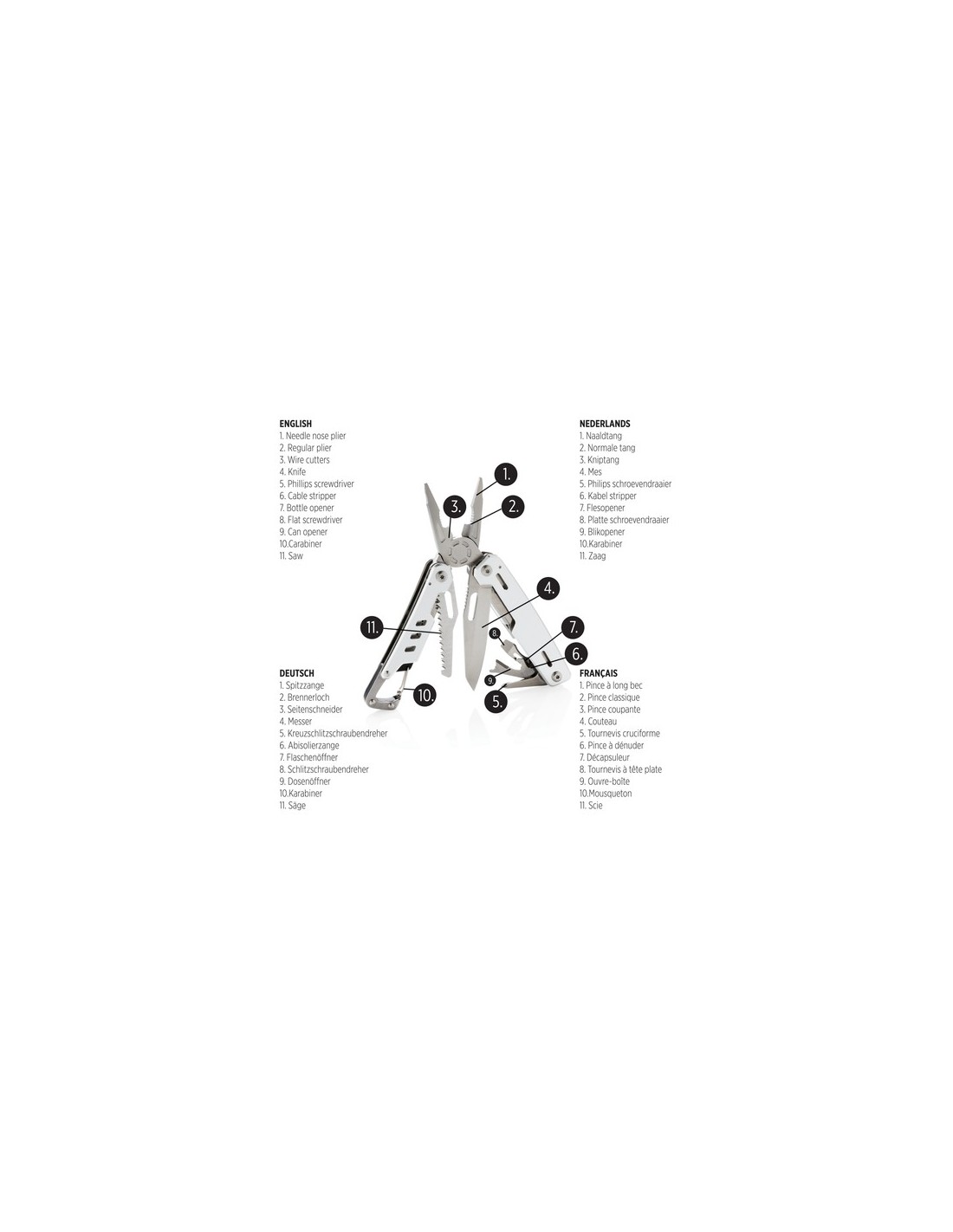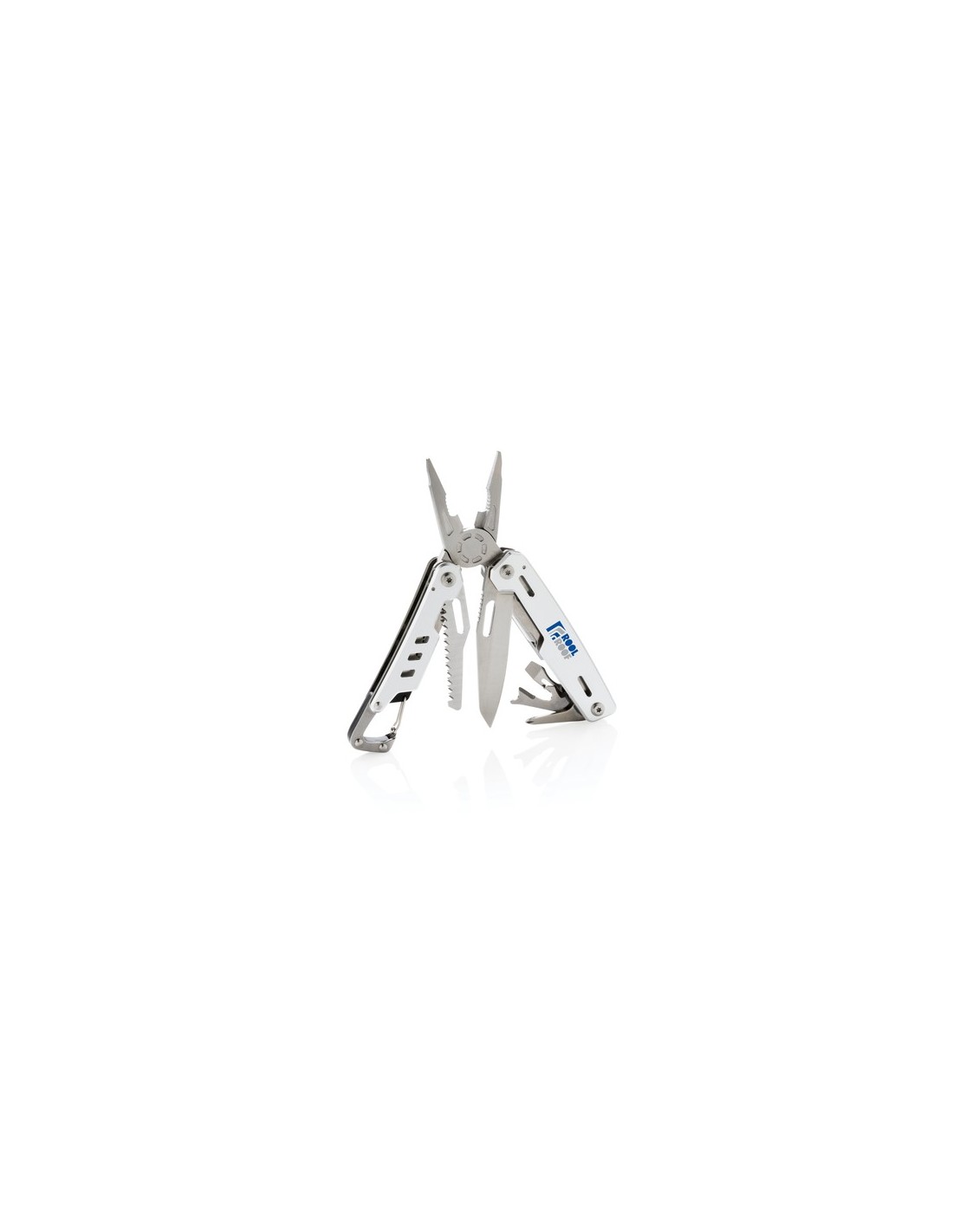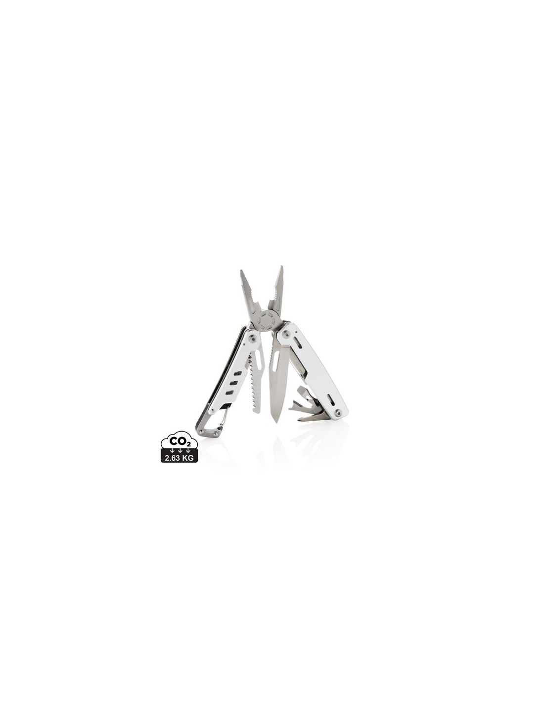 Multiherramienta sólida y duradera con 11 funciones, carcasa de aluminio y herramientas de acero inoxidable. Incluye: alicates de punta fina, alicates normales, cortaalambres, navaja, destornillador, destornillador plano, sierra, abrelatas, abrebotellas, pelacables, mosquetón. Presentado en caja de regalo. Material : Aluminio, Acero inoxidable Recycled Content Percent : 0 Conforme directiva Cadmio 91/338/EC, Conforme contenido de plomo U.S, Conforme legislación alimentos Alemania, Conforme directiva SVHC 1907/2006/EC, Libre de parafinas cloradas de cadena corta y media. Packaging : Caja de regalo All print codes : Laser Engraving 2,Pad Print - Print code default : Grabado a láser - parte frontal y derecha del artículo - 8 x 40 mm - max color : 1 Social Audits : BSCI Total CO2 emissions : 2,63.
