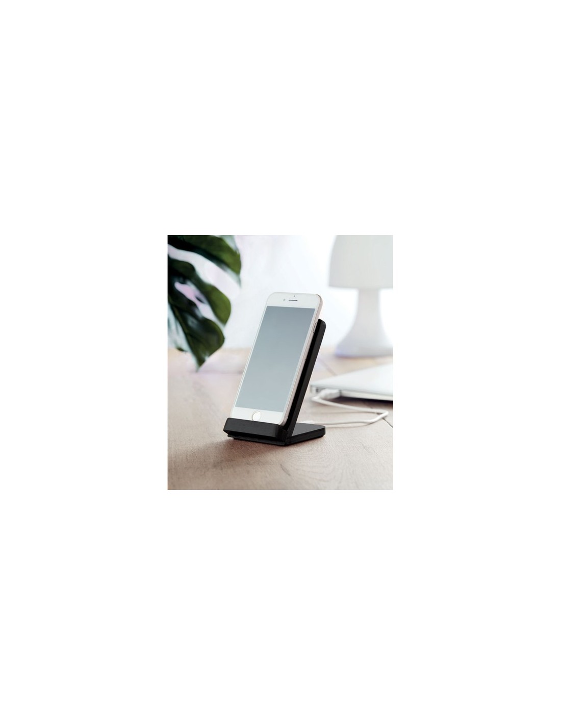 Cargador inalámbrico de doble bobina para 1 dispositivo en carcasa de bambú y con función de soporte. Coloque el smartphone sobre él para iniciar la carga. Salida: DC5V/1A (15W). Compatible con los últimos Android, iPhone® 8, X y posteriores.