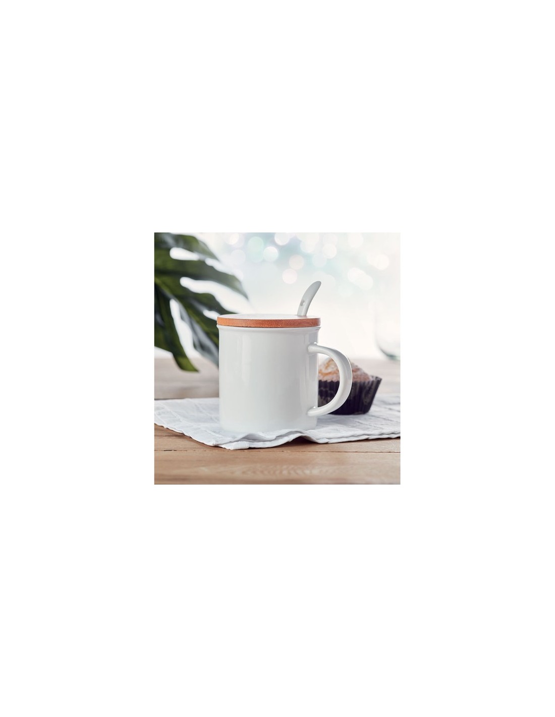 Taza de porcelana con cuchara y tapa de bambú. Embalaje con caja individual. Marcaje en tampografía no es apto para lavavajillas. Transfer cerámico es apto para lavavajillas. Capacidad 380 ml. El bambú es un material natural, el color del articulo, la medida y la impresión sobre el puede variar.