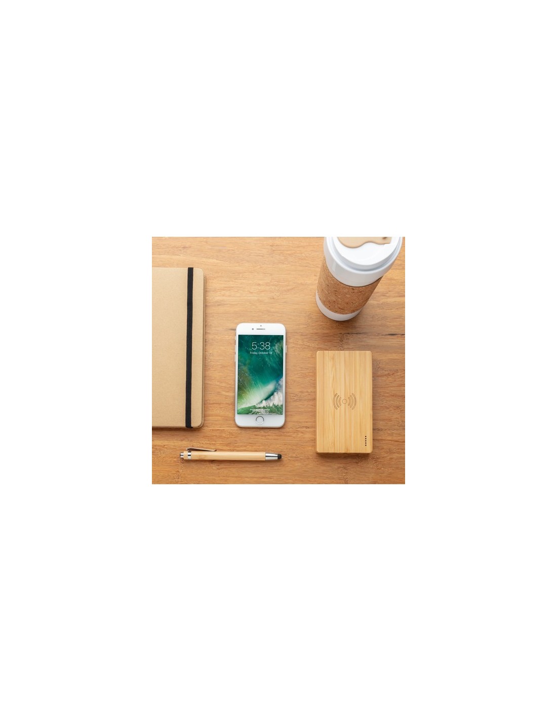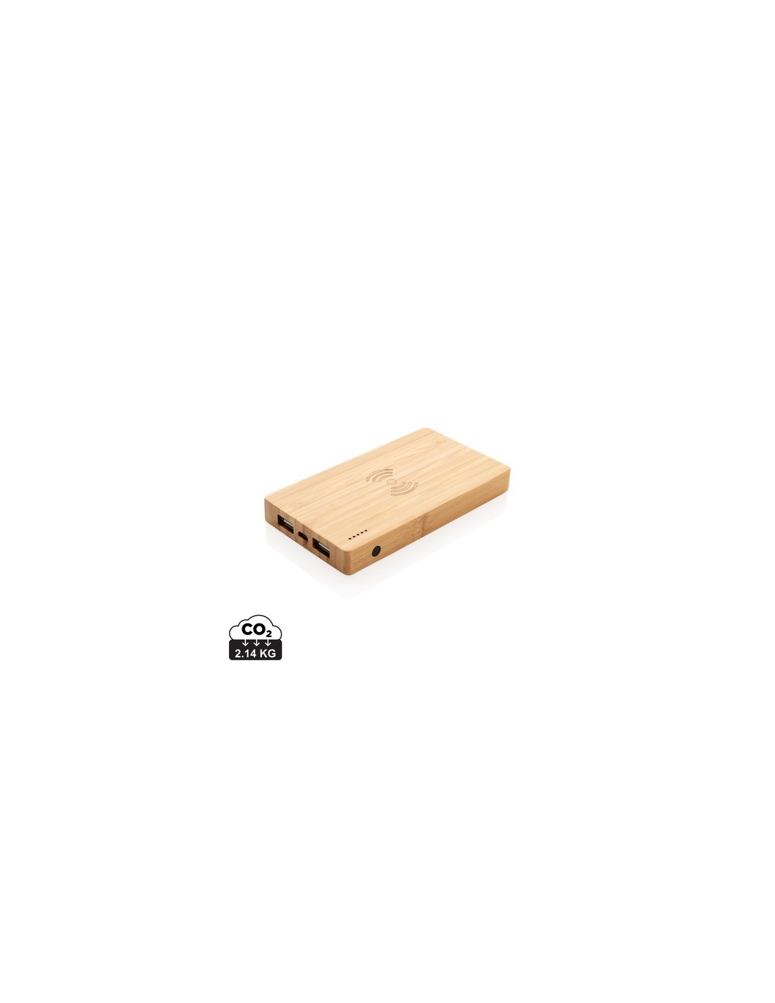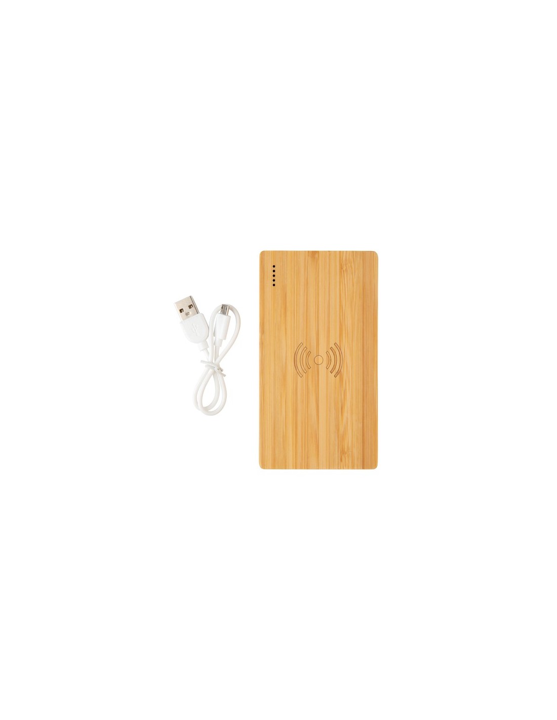 Batería externa Eco 4.000 mAh de bambú natural y sostenible. Soporta carga inalámbrica de 5W y carga a través de puerto USB por cable. Cuando esté completamente cargada, te proporcionará suficiente energía para recargar tu teléfono móvil hasta dos veces. Este powerbank contiene una batería de polímero de litio de alta densidad de 4.000 mAh de larga duración de grado A. Los indicadores de energía indicarán el nivel de energía restante para que siempre sepas cuándo recargar. Entrada 5V/2A. Salida USB 5V/2A. Salida inalámbrica 5W 5V/1A. Material : Bambú Recycled Content Percent : 0 Conforme directiva bateria 2006/66EC, Conforme directiva Electromagnética 2014/30/EU, Conforme directiva de sustancias peligrosas 2011/65/EC & 2015/863, Conforme PAHS content in Reach & ZEK 01-4-08, Conforme directiva SVHC 1907/2006/EC, Conforme directiva seguridad baterias Alcalinas EN62133, Conforme directiva EN60950-1 a la protección contra descargas eléctricas y peligros de energía WEEE Battery : 1 Li-poli - 45 g. Packaging : Bolsa de plástico y caja individual All print codes : CO2 Engraving 2,Pad Print,Digital Print 2 - Print code default : Grabado CO2 - parte frontal y baja del artículo - 55 x 40 mm - max color : 1 Social Audits : BSCI Total CO2 emissions : 2,14.