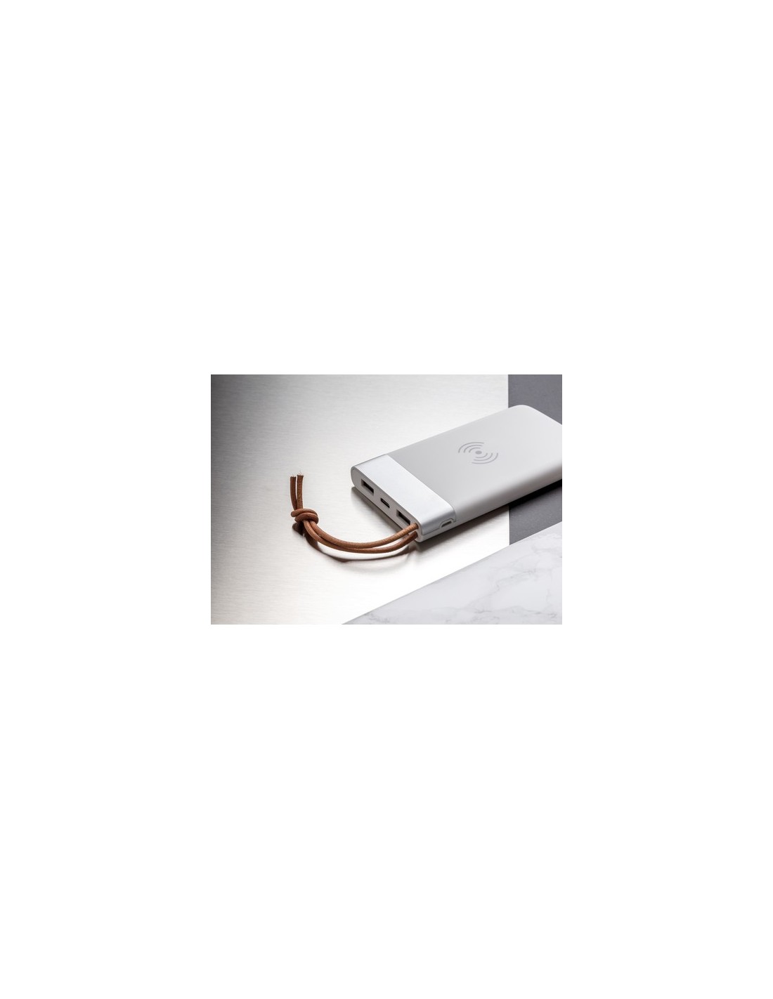 La funcionalidad inalámbrica se combina con el diseño nórdico en este powerbank inalámbrico Aria. Esta batería externa inalámbrica está fabricada en lujoso aluminio y ABS con un acabado suave de alta calidad. El detalle final es la correa de PU. El powerbank admite tanto la carga por USB como la inalámbrica de 5W. Compatible con todos los dispositivos habilitados para QI como la última generación de Android, iPhone 8 y superior. Entrada 5V/2A Salida inalámbrica: 5V/1A. Salida USB: 5V/2A. Presentada en caja de regalo de lujo. Diseño registrado® Material : ABS, Aluminio Recycled Content Percent : 0 Conforme directiva bateria 2006/66EC, Conforme directiva equipamientos Radio y Telecomunicaciones 2014/53/EU, Conforme directiva de sustancias peligrosas 2011/65/EC & 2015/863, Conforme PAHS content in Reach & ZEK 01-4-08, Conforme directiva SVHC 1907/2006/EC, Conforme directiva seguridad baterias Alcalinas EN62133, Componentes duraderos y de alta calidad, Control de temperatura, Protección contra cortocircuito, Protección contra sobrecorriente, Protección contra sobrecarga, Detección de objetos extraños, Una corriente en reposo máxima de 0,3 W cuando no se utiliza WEEE Battery : 1 Li-poli - 125 g. Packaging : Caja de regalo All print codes : Pad Print,Laser Engraving 2 - Print code default : Tampografía - parte frontal/alta del artículo - 50 x 15 mm - max color : 5 Social Audits : BSCI Total CO2 emissions : 3,82.