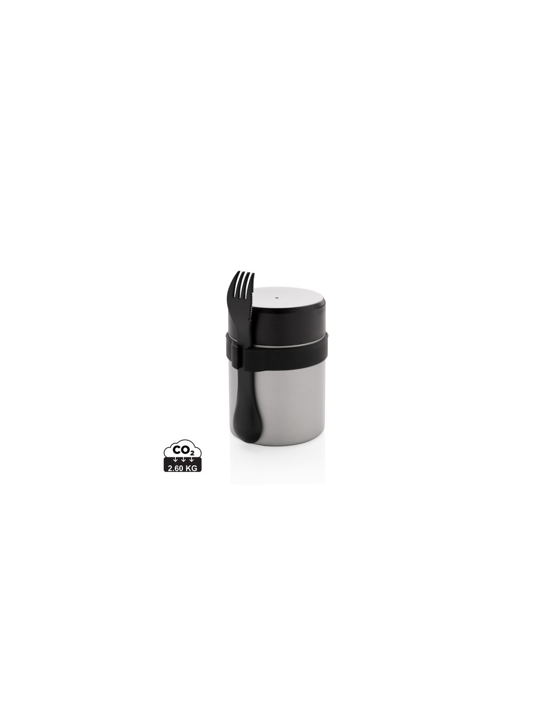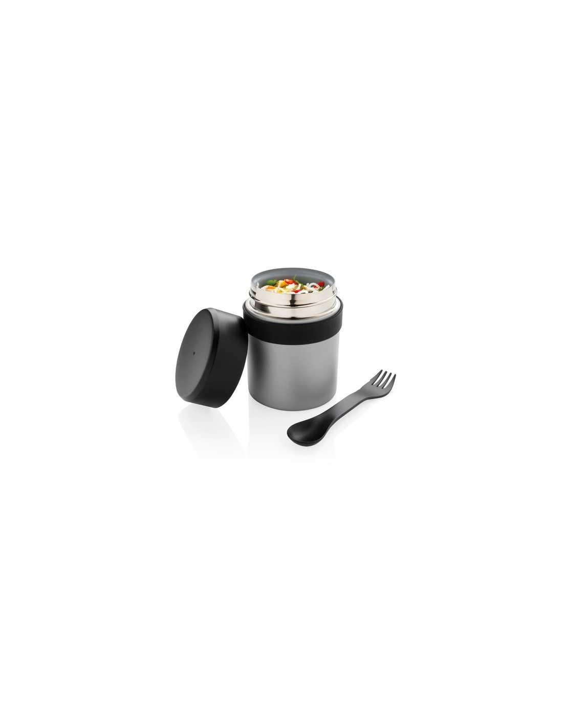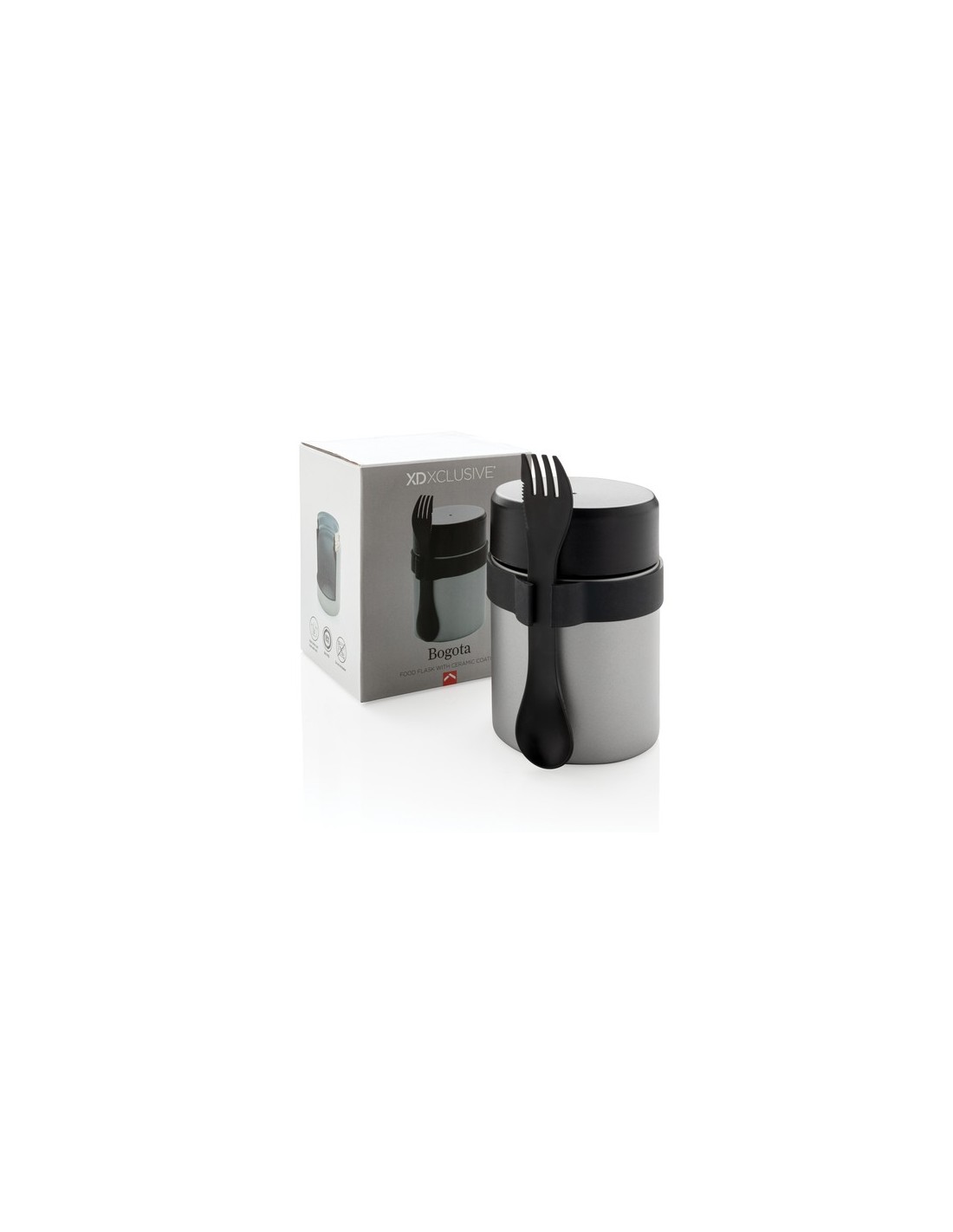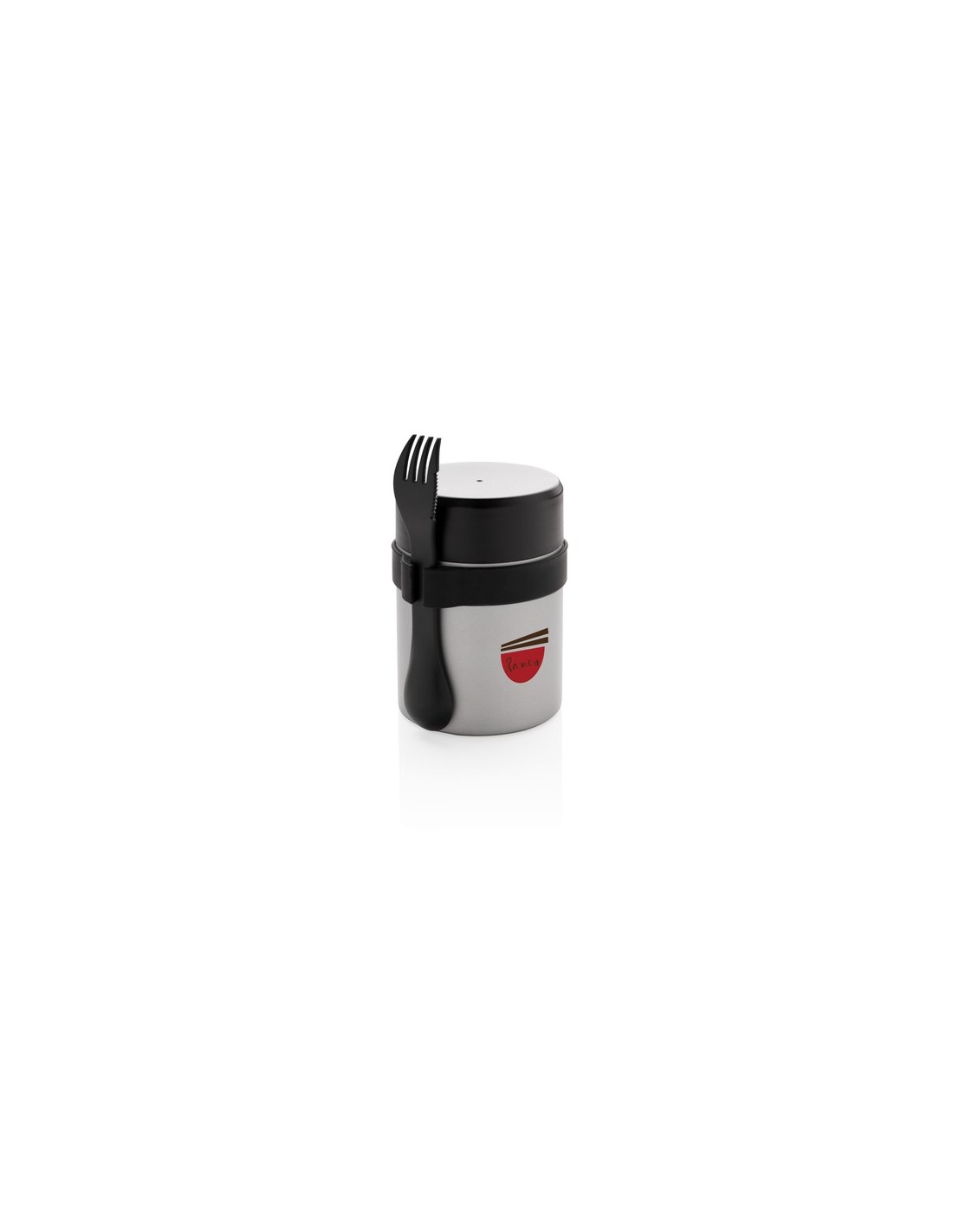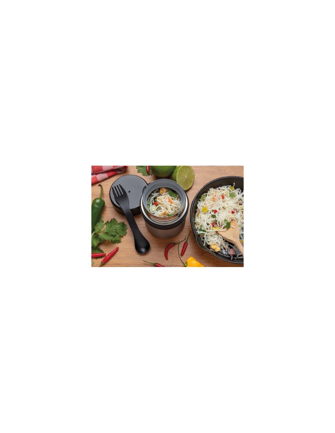 No pruebes el acero inoxidable, solo prueba tus alimentos frescos o sopas! Disfruta de esta experiencia bebiendo en cerámica. Mantén tus bebidas calientes hasta 5h y fría hasta 15h con este recipiente de alimentos con aislamiento al vacío. Se aplicó un revestimiento de cerámica en toda la pared interior para tener una mejor experiencia de bebida y eliminar el sabor metálico. Viene con tenedor todo en uno, cuchillo y cuchara. Tapa antigoteo. Contenido: 400ml. Diseño registrado® Material : Acero inoxidable, PP Recycled Content Percent : 0 Sin materiales Bisphenol A, Conforme legislación alimentos Alemania, Conforme directiva SVHC 1907/2006/EC, Libre de parafinas cloradas de cadena corta y media. Packaging : Bolsa de plástico y caja individual All print codes : Laser Engraving 3,Pad Print Drinkware - Print code default : Grabado a láser - parte frontal en medio - 35 x 50 mm - max color : 1 Total CO2 emissions : 2,6.