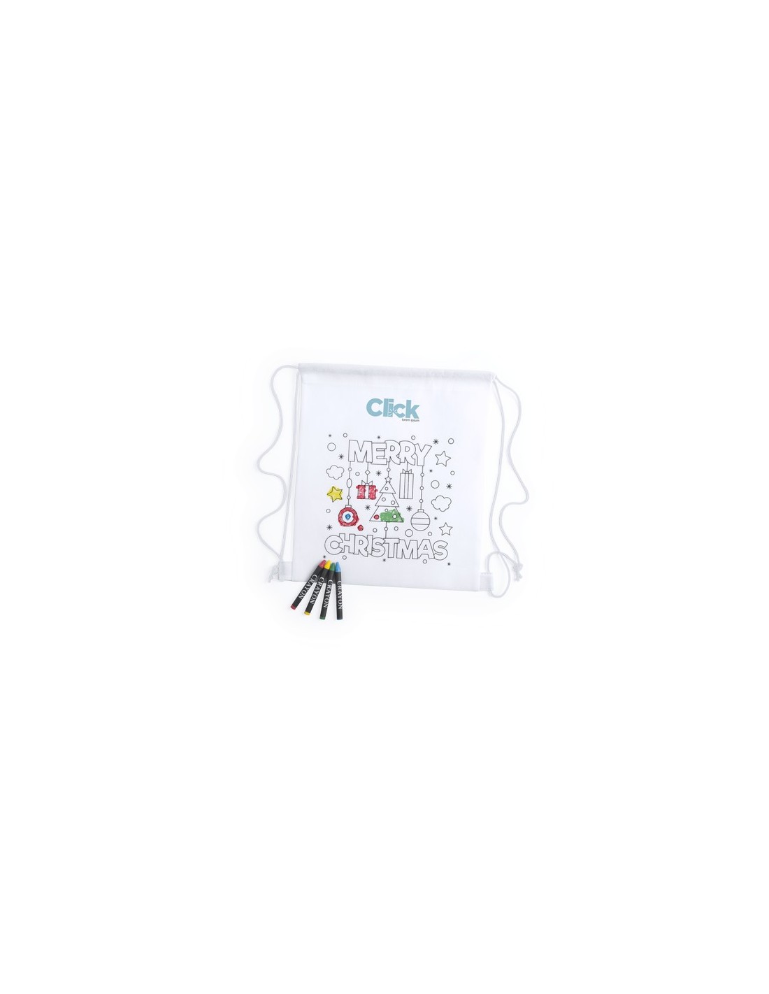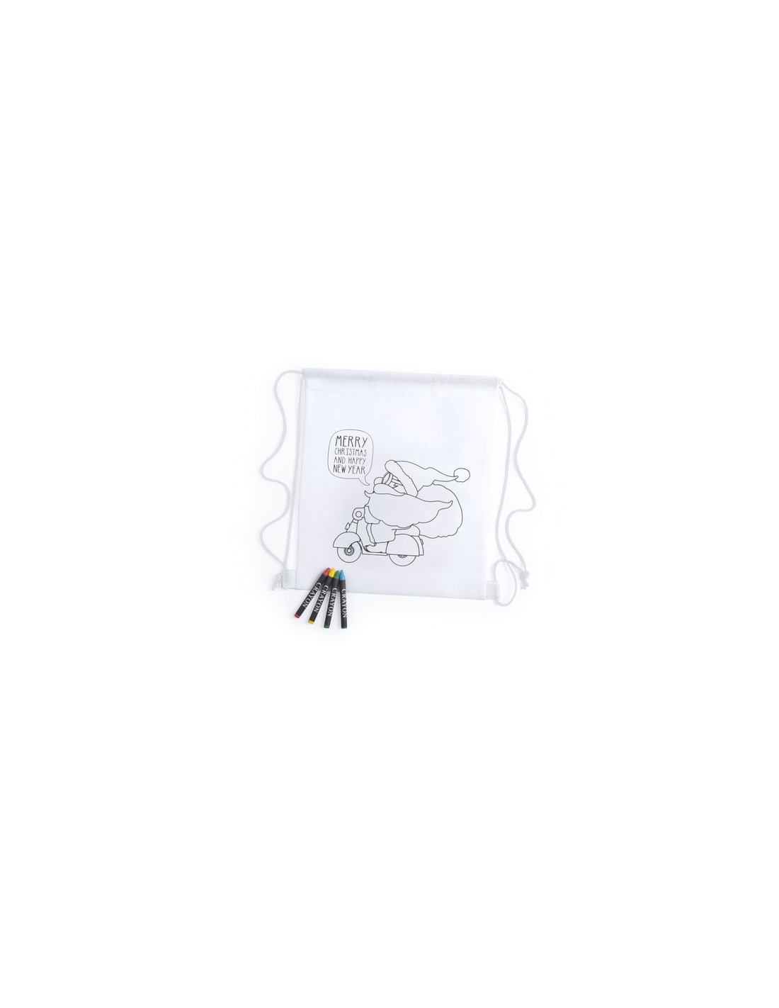 Mochila navideña infantil de non-woven en color blanco especialmente diseñada para colorear con ceras. Incluye 4 ceras en variados colores. Con cuerdas autocierre a juego y refuerzos en las esquinas. Disponible en diseños Merry Xmas y Papá Noel. 4 Ceras Incluidas Composition : Non-Woven.