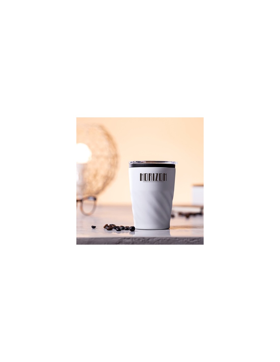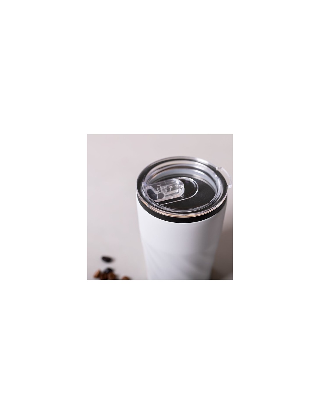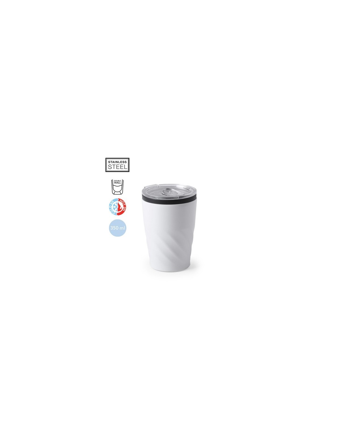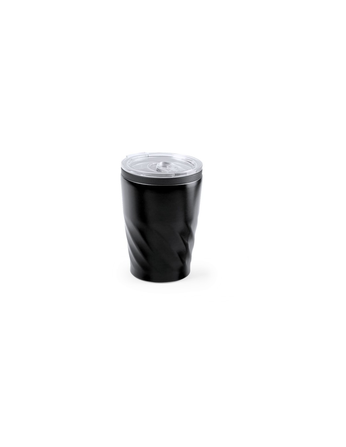 Vaso fabricado en acero inox de 350ml de capacidad. Cuerpo con diseño biselado, con anilla de color negro. Con original tapón dosificador transparente y abrefácil. Es ideal para tener en tu escritorio, mesa o en cualquier superficie donde disfrutar tranquilamente de tu bebida favorita. 350 ml Composition : Acero Inox.